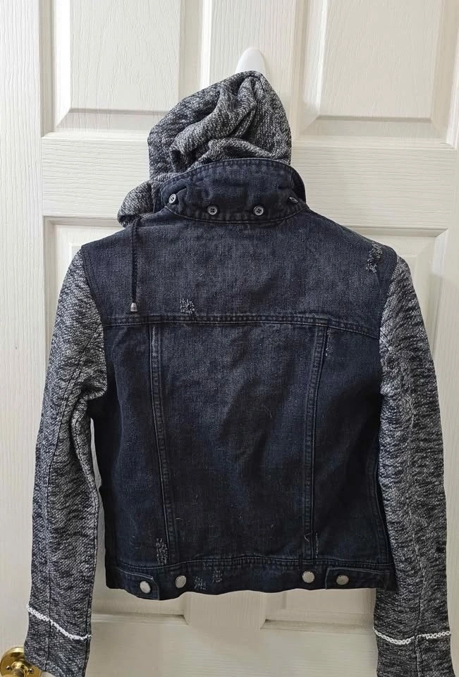 Brand new with tags Black Rivet Distressed Style Jacket. Size Small. Removable hood.