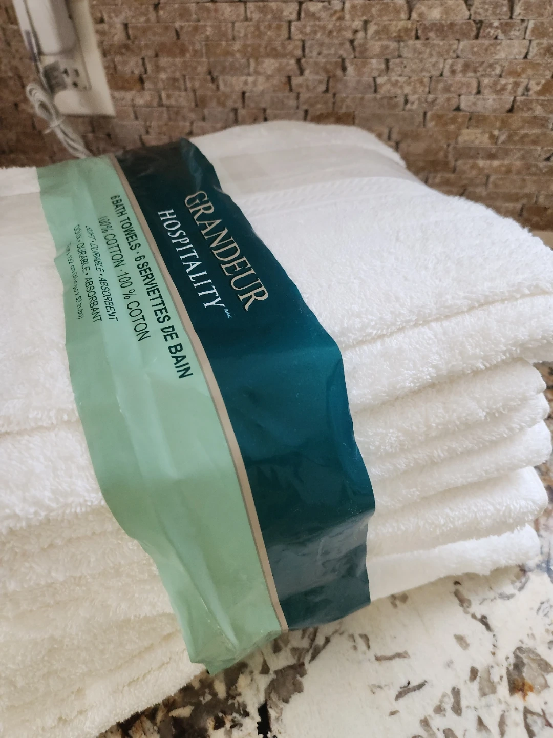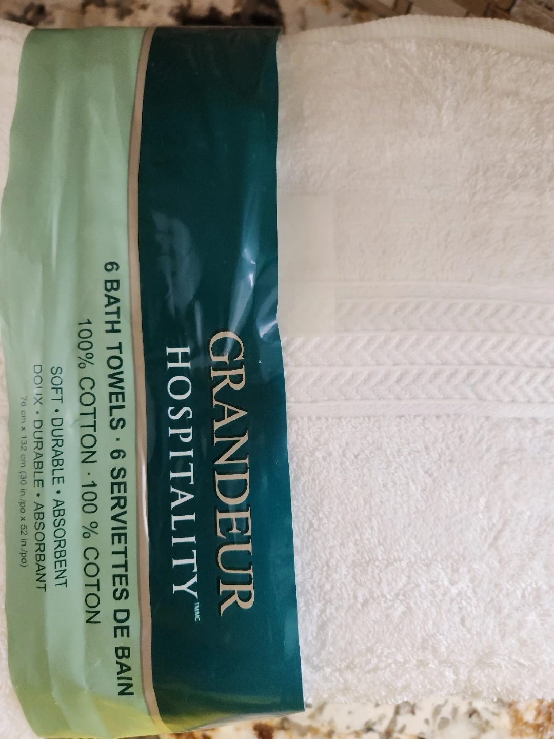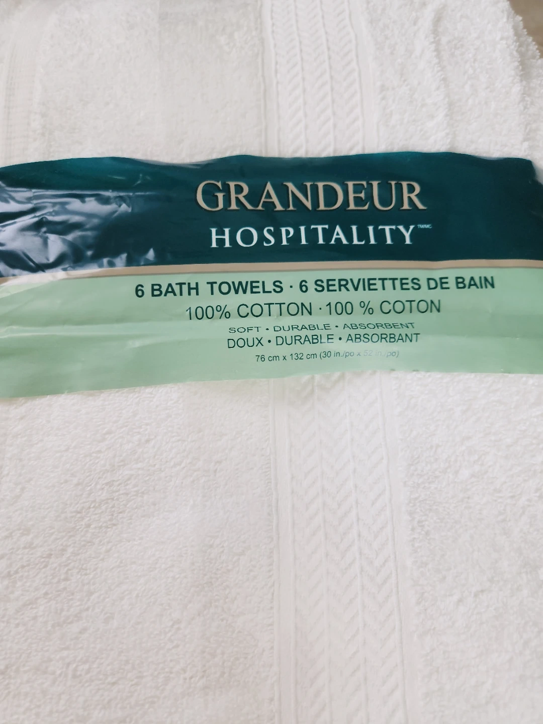 Selling a set of 6 large Grandeure Hospitality bath towels! They are brand new and still in the original packaging. These towels are made of 100% cotton and are soft, durable, and absorbent. Each towel measures 76 cm x 132 cm (30 in x 52 in)