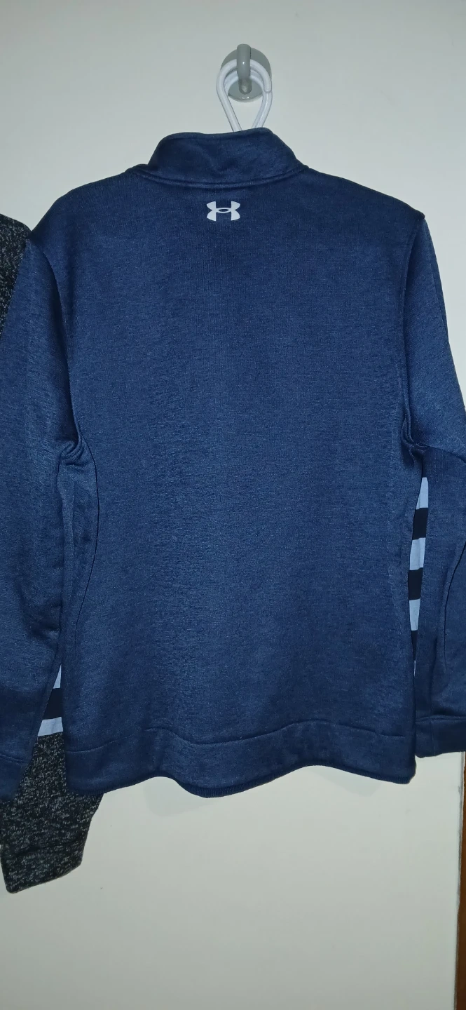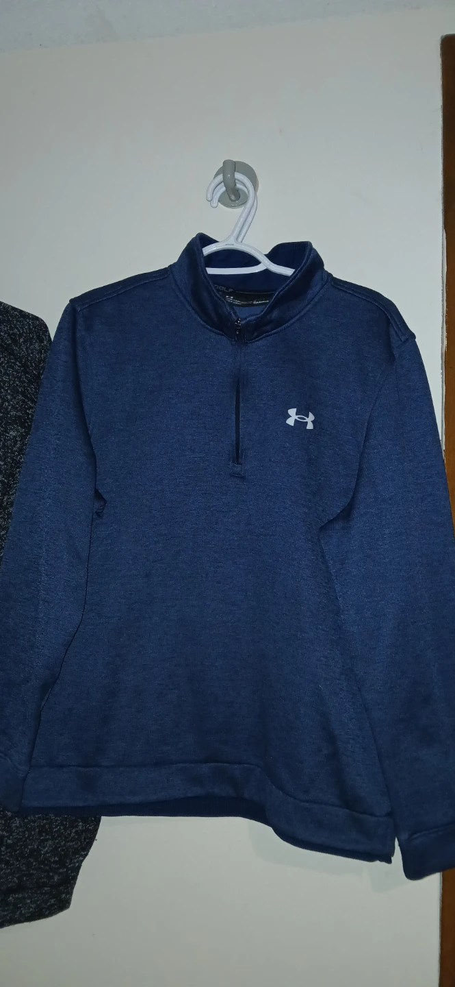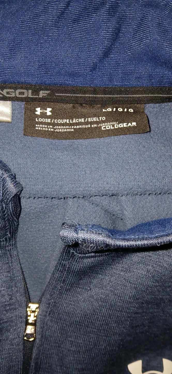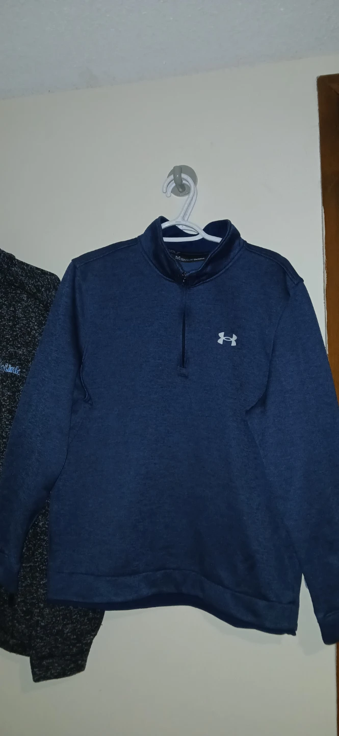 This is an Under Armour 1/4 zip pullover in a men's size large. It's a nice navy blue colour. The material is ColdGear, so it's perfect for cooler weather!