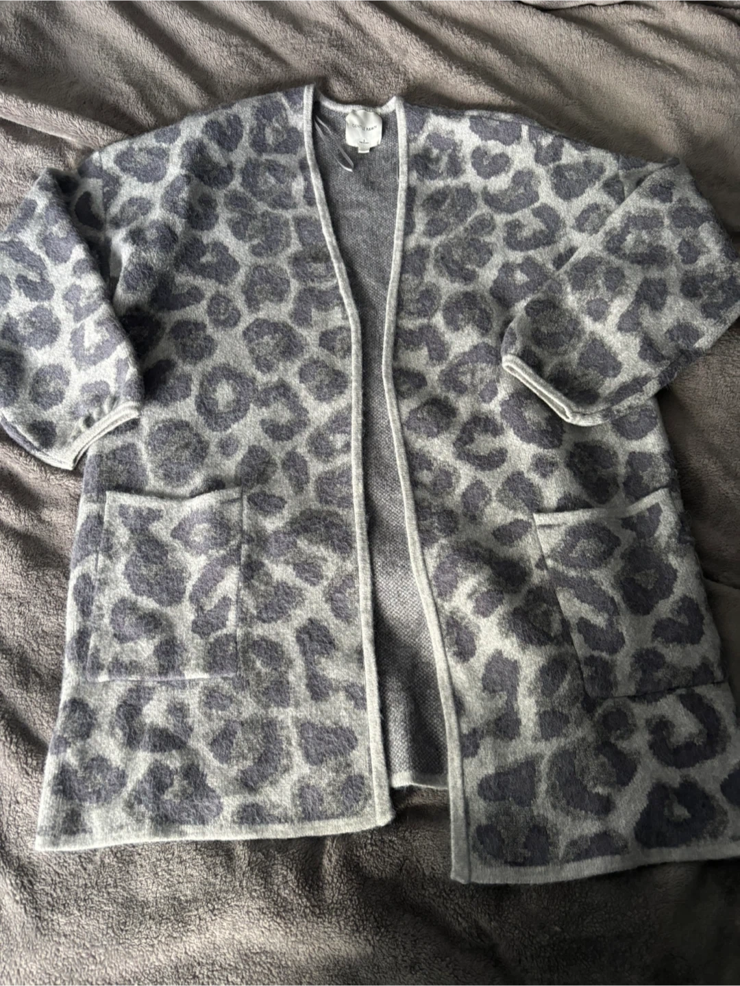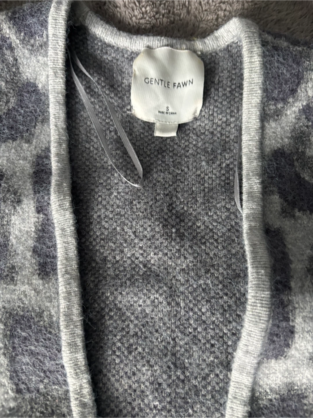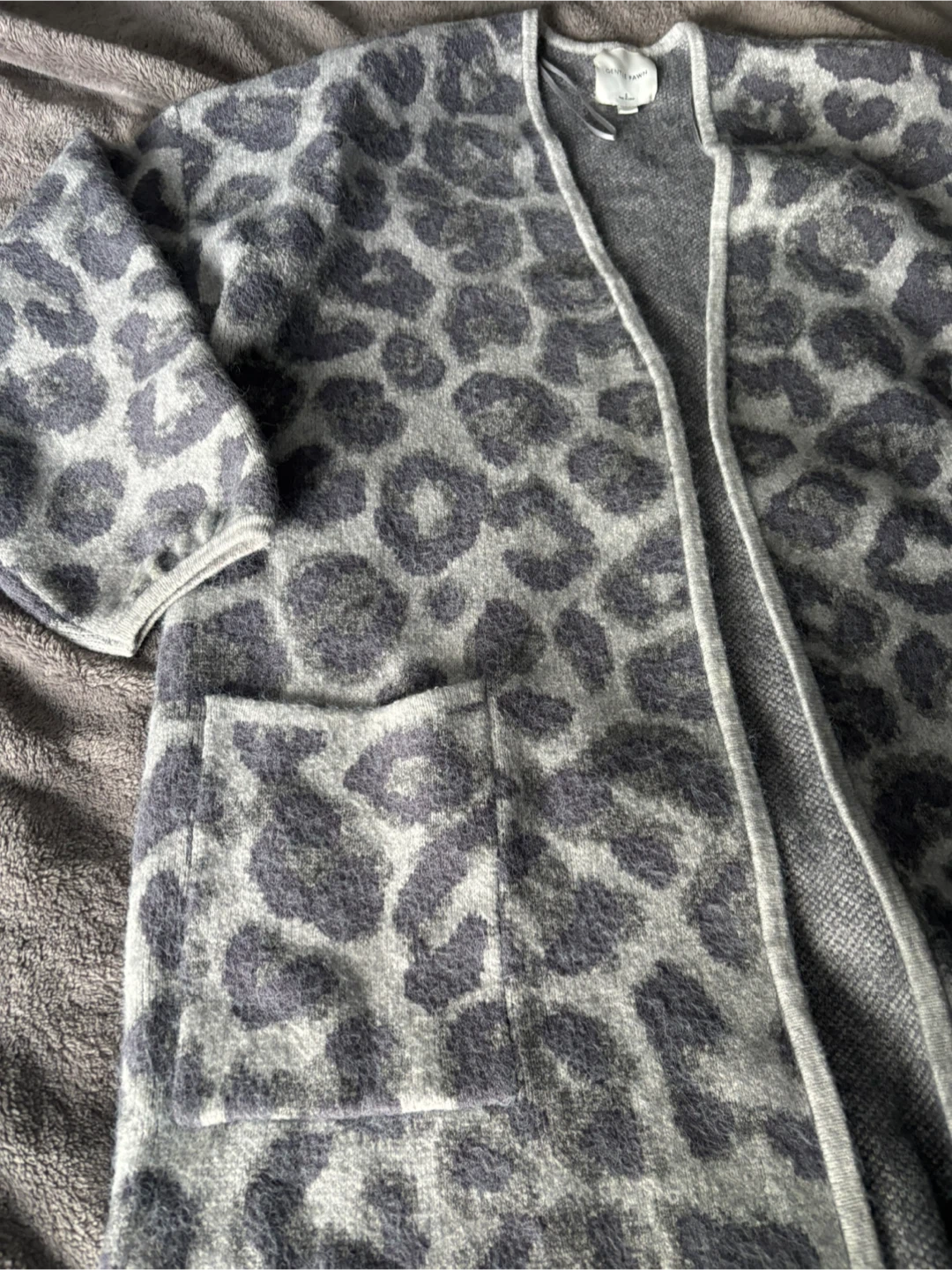 Cozy Gentle Fawn cardigan with a stylish leopard print! It's a size small and made of a soft blend of 50% viscose, 30% polyester, and 20% nylon. Perfect for layering on chilly days! Excellent condition
