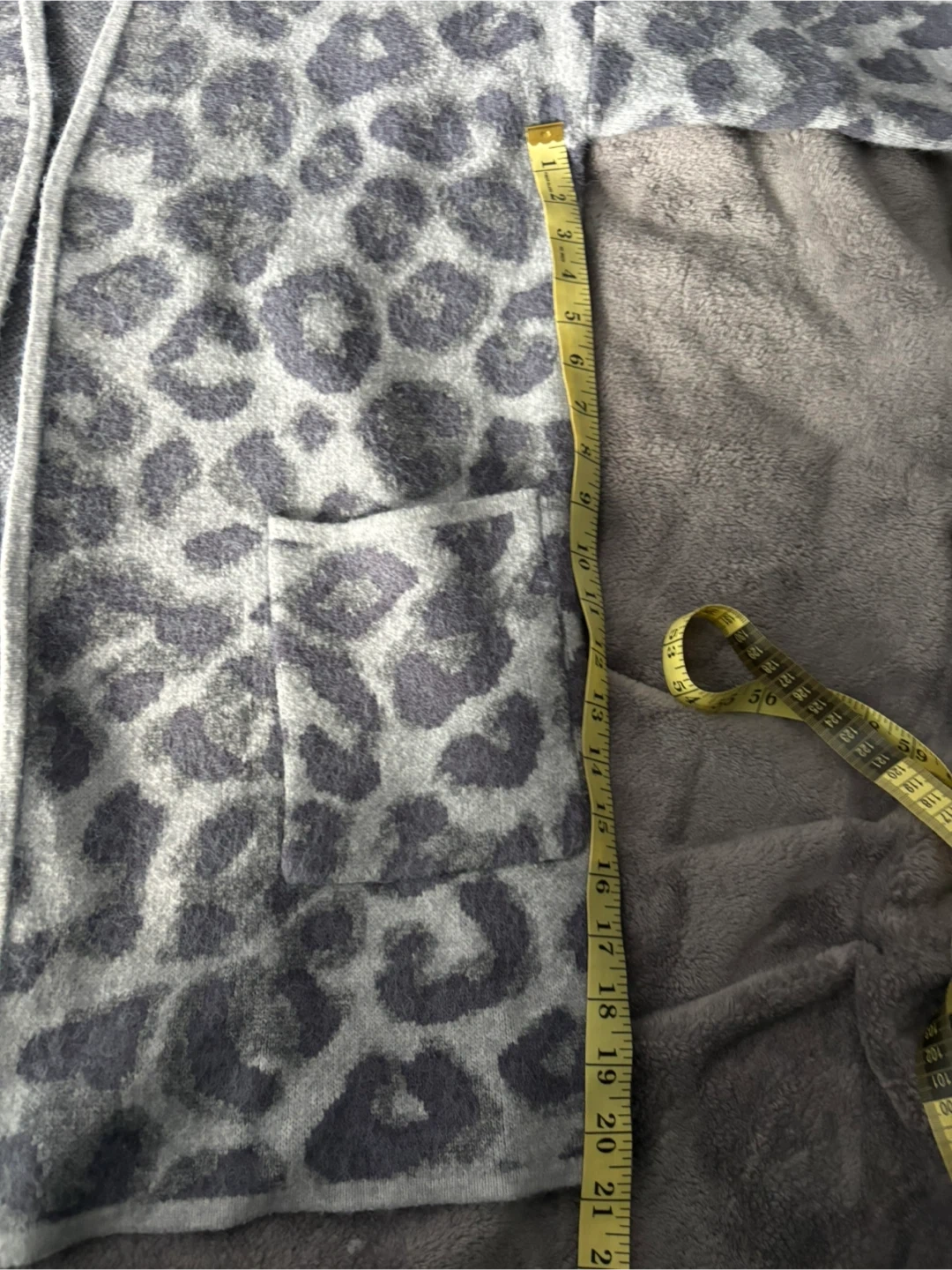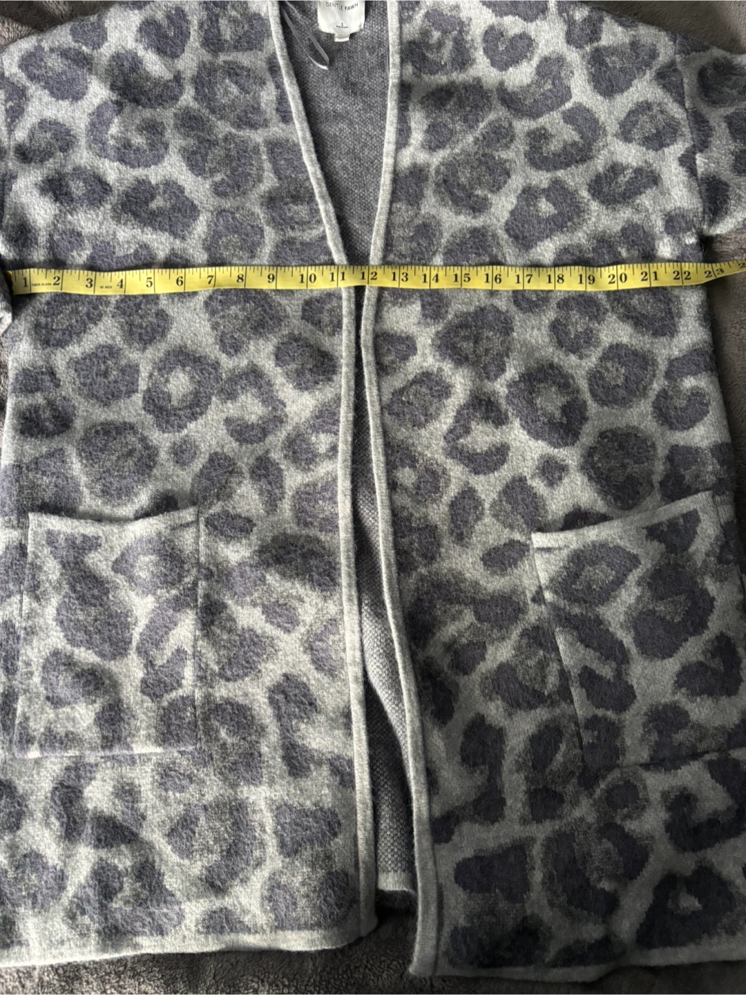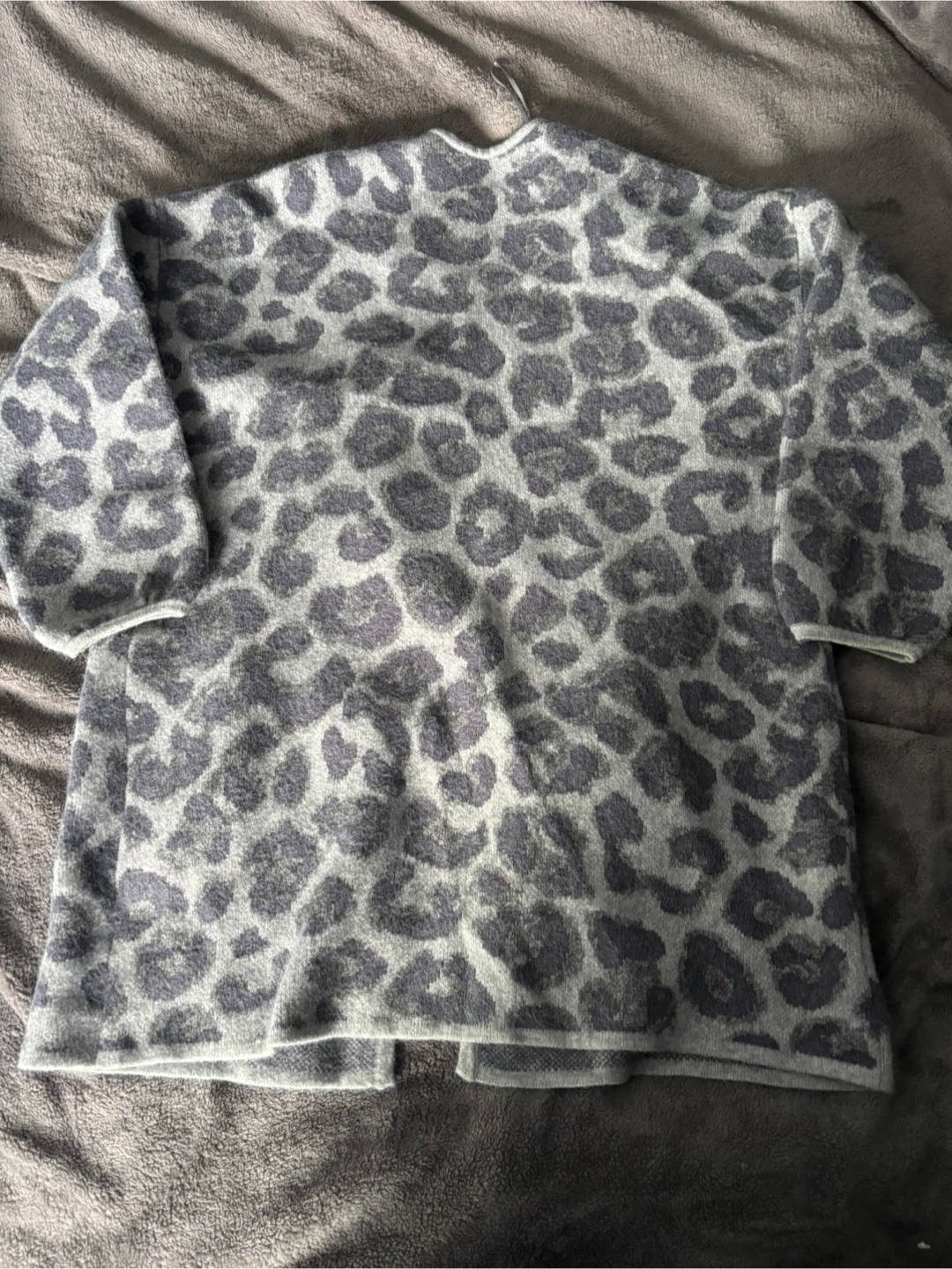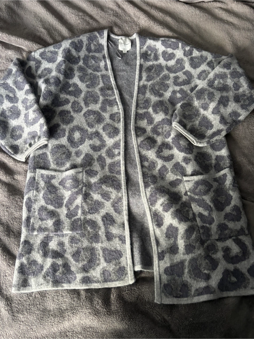 Cozy Gentle Fawn cardigan with a stylish leopard print! It's a size small and made of a soft blend of 50% viscose, 30% polyester, and 20% nylon. Perfect for layering on chilly days! Excellent condition