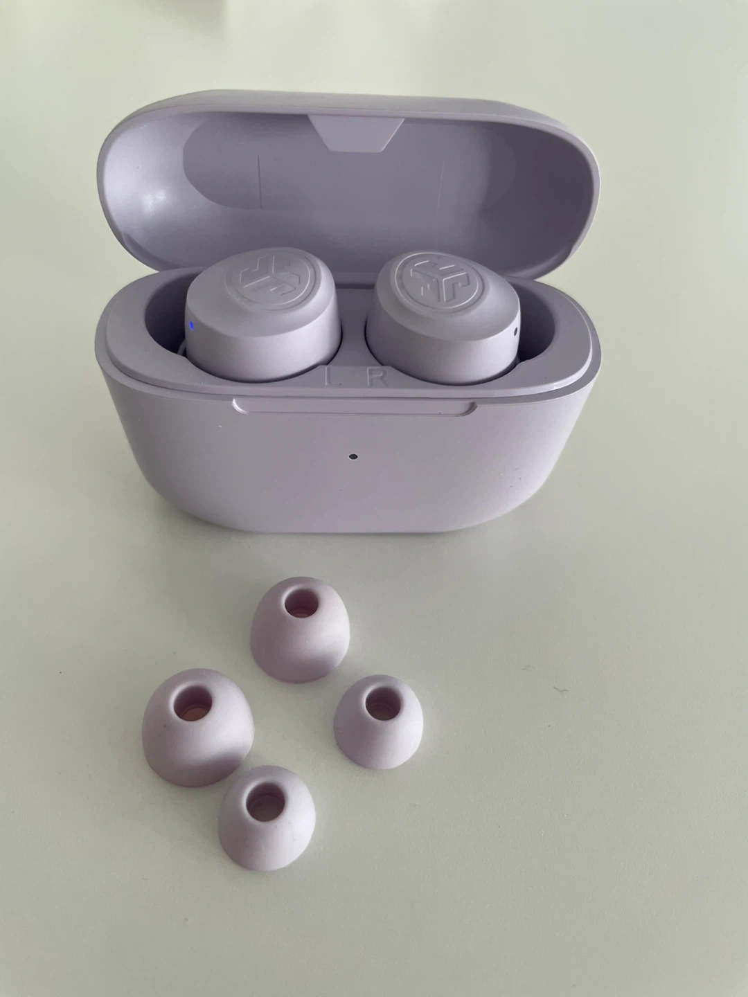 Selling a pair of JLab Go Air Pop earbuds in lavender! They come with the charging case and extra ear tips, so you can find the perfect fit. They are in great condition, barely used.