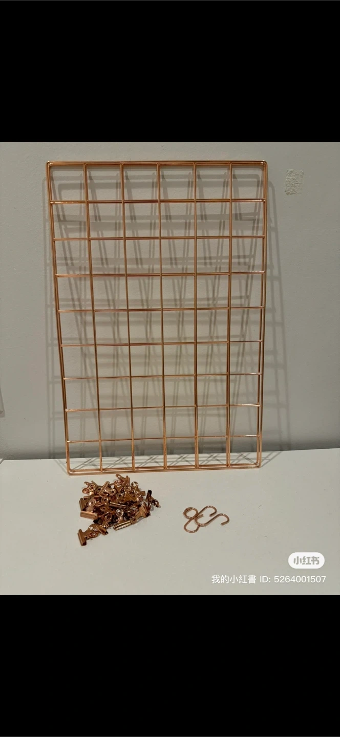 Here's a rose gold grid wall panel, perfect for displaying photos, notes, or small items. It comes with two grids and a bunch of matching rose gold clips to help you get started. It's a great way to add a touch of style to your space