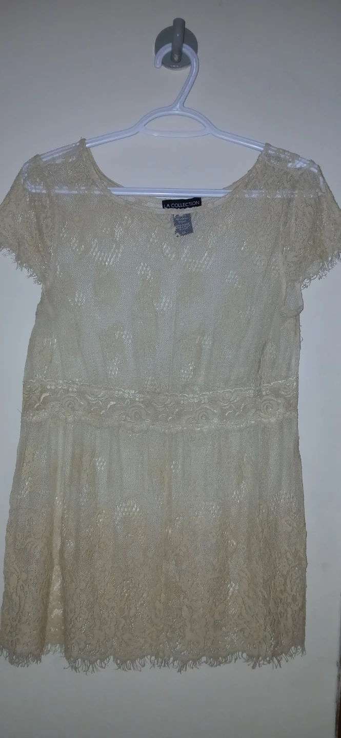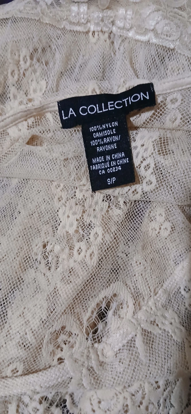 Selling a lovely lace top from LA Collection! It's a size small and made of 100% nylon lace with a 100% rayon camisole underneath. A very pretty piece!