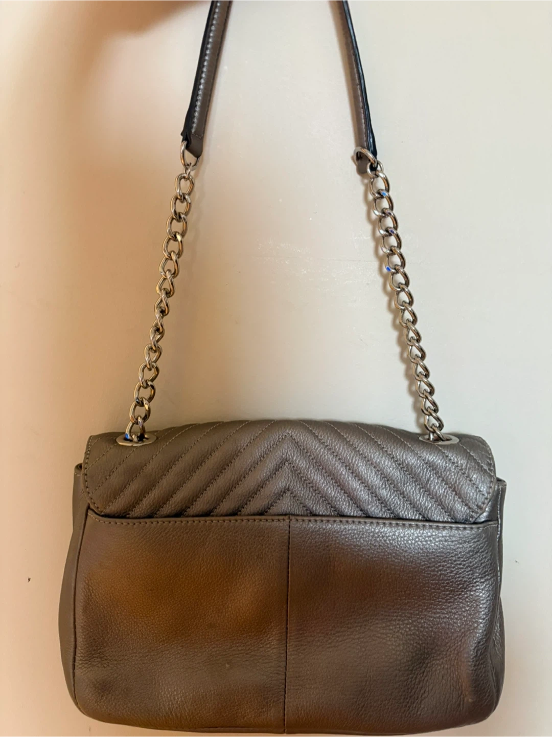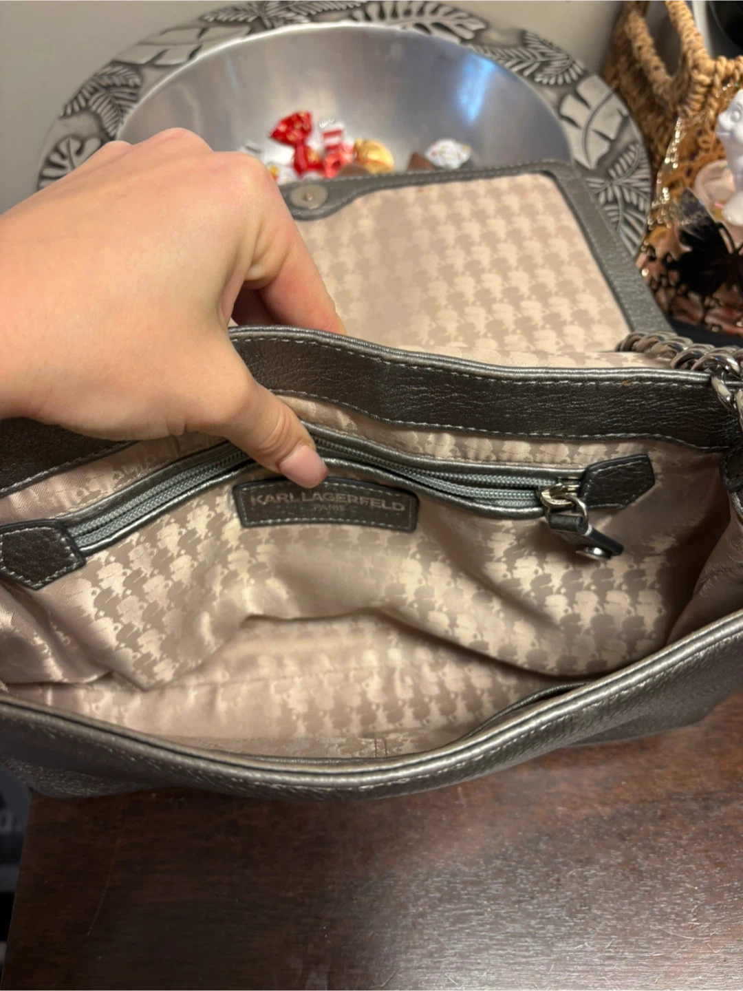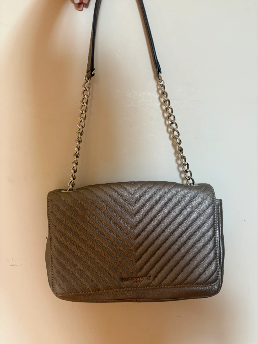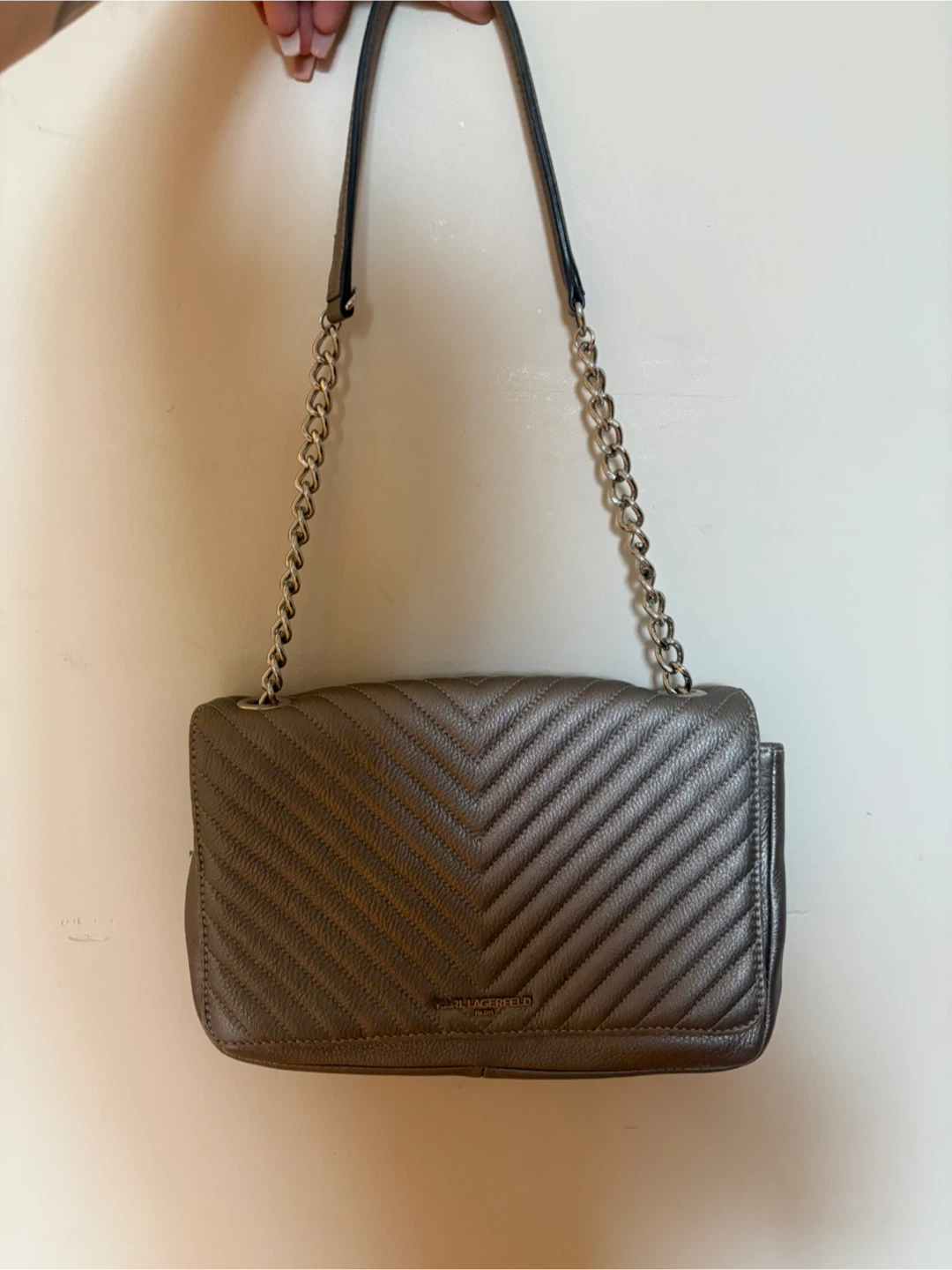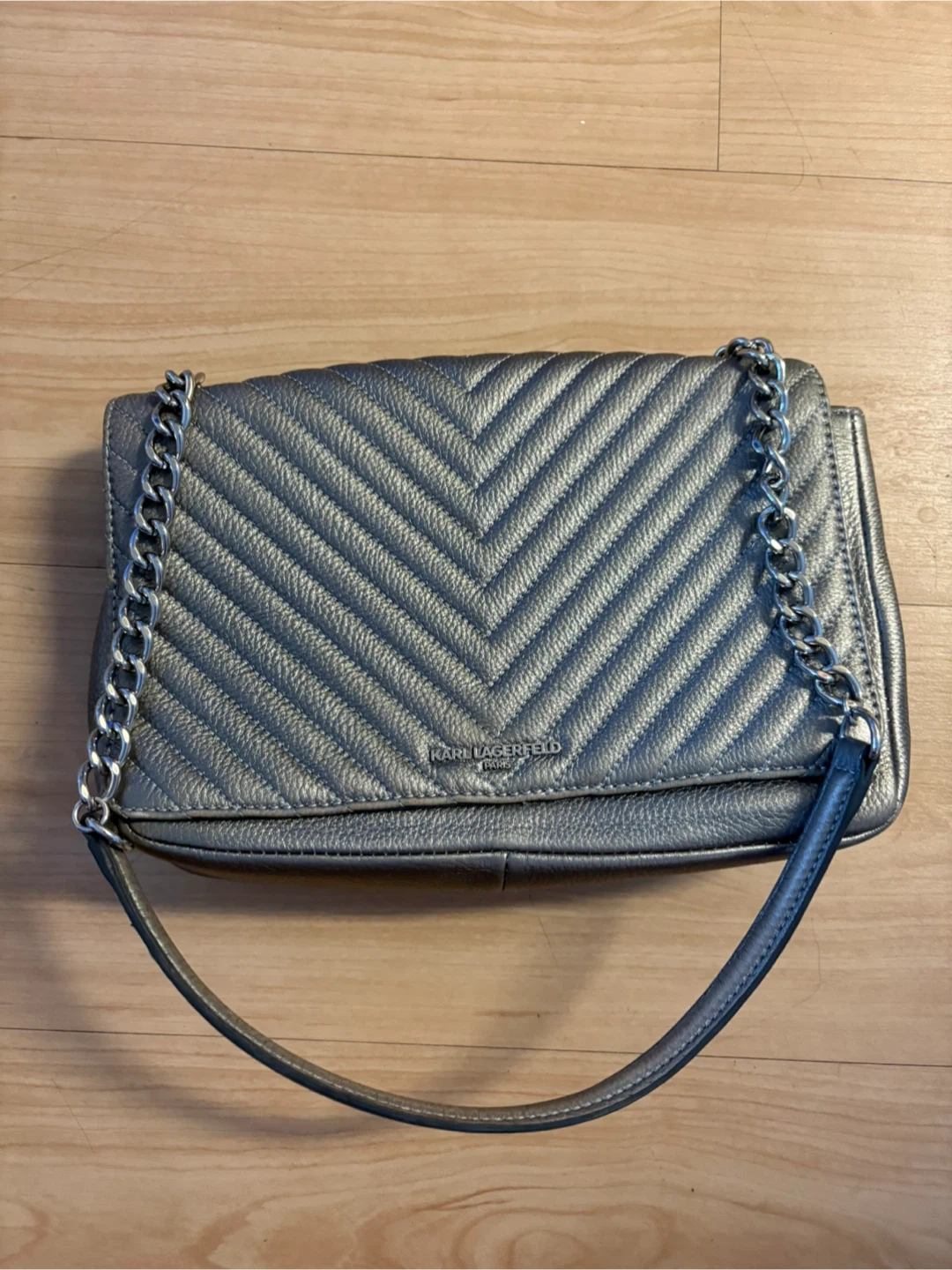 Selling a Karl Lagerfeld Paris shoulder bag. It's in great condition and features a stylish chain strap. The bag has a unique chevron pattern and a metallic silver colour. Perfect for adding a touch of elegance to any outfit!