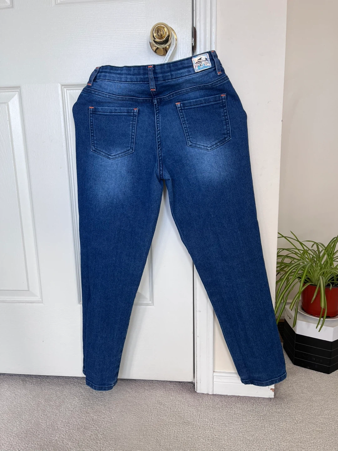 Here's a pair of Faded Glory jeans in great condition! They're a stylish dark wash denim with cute crochet patches on one leg.