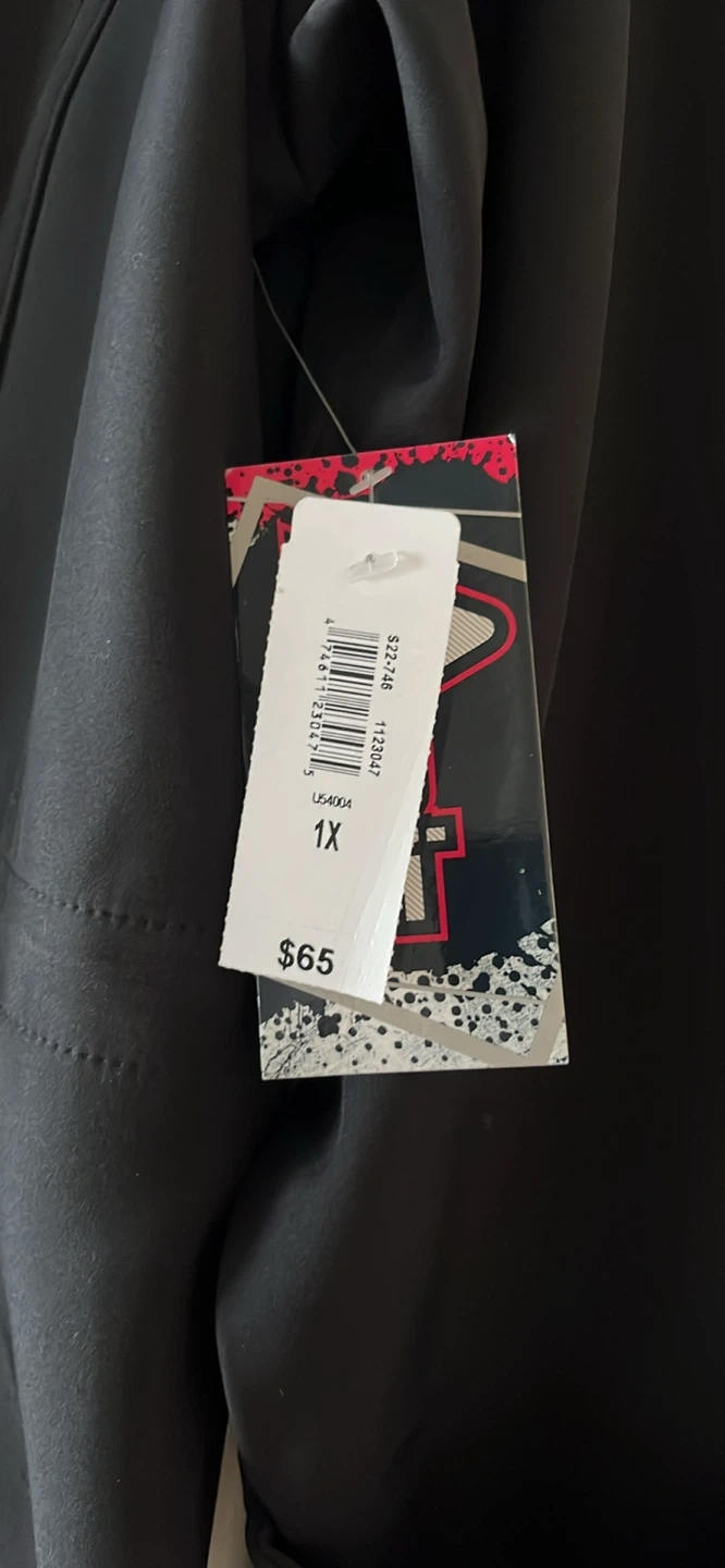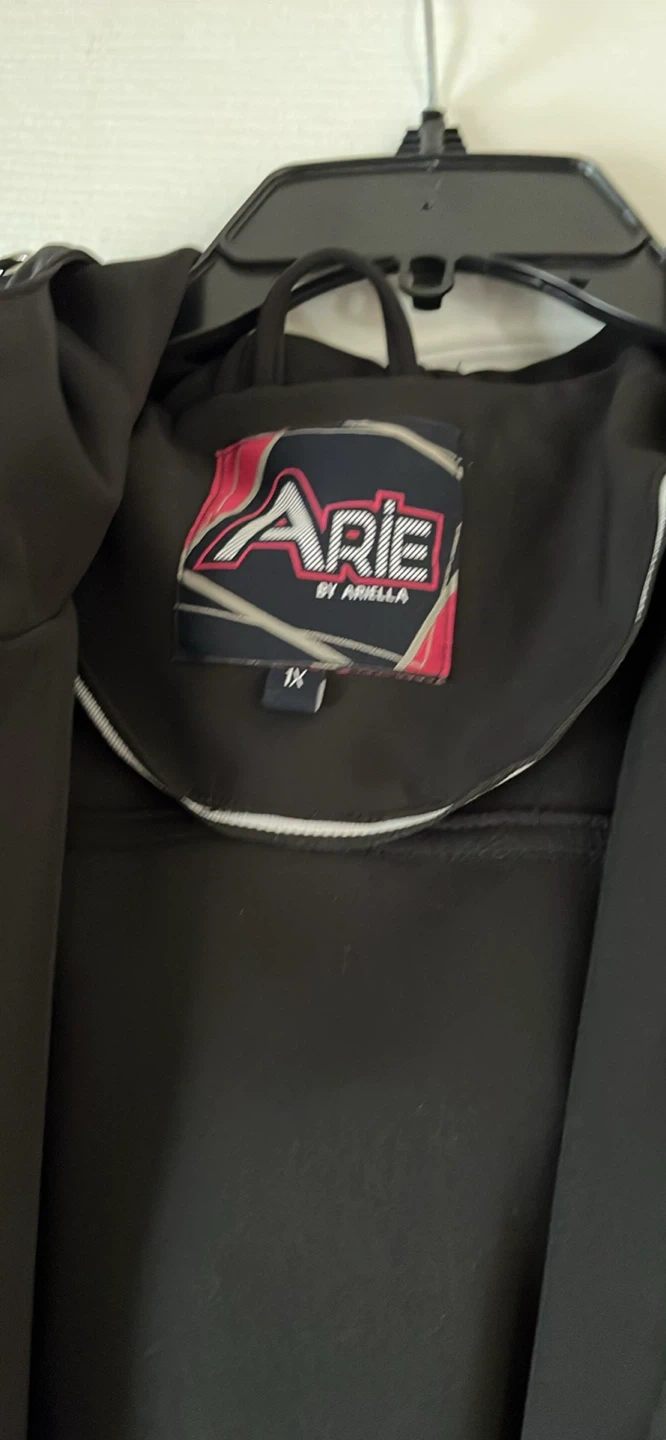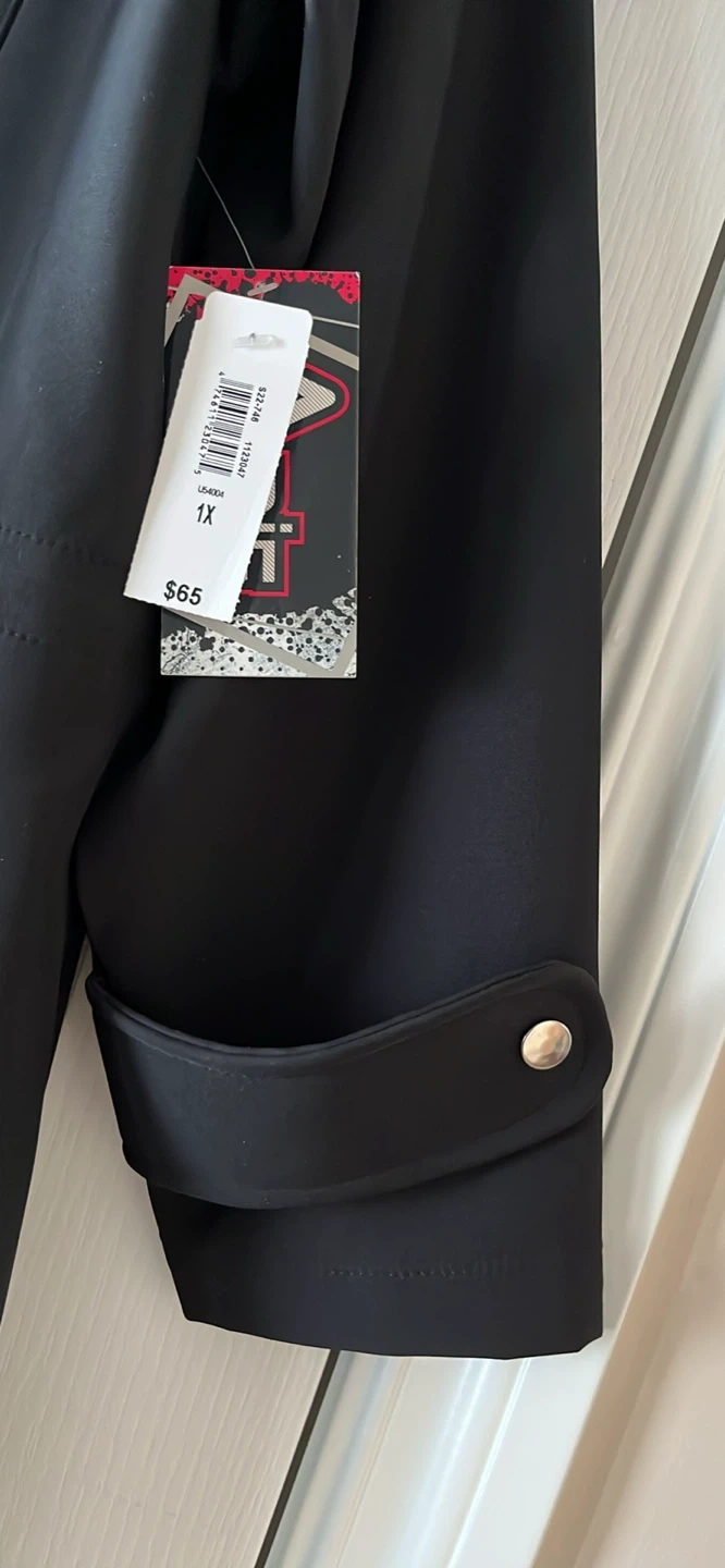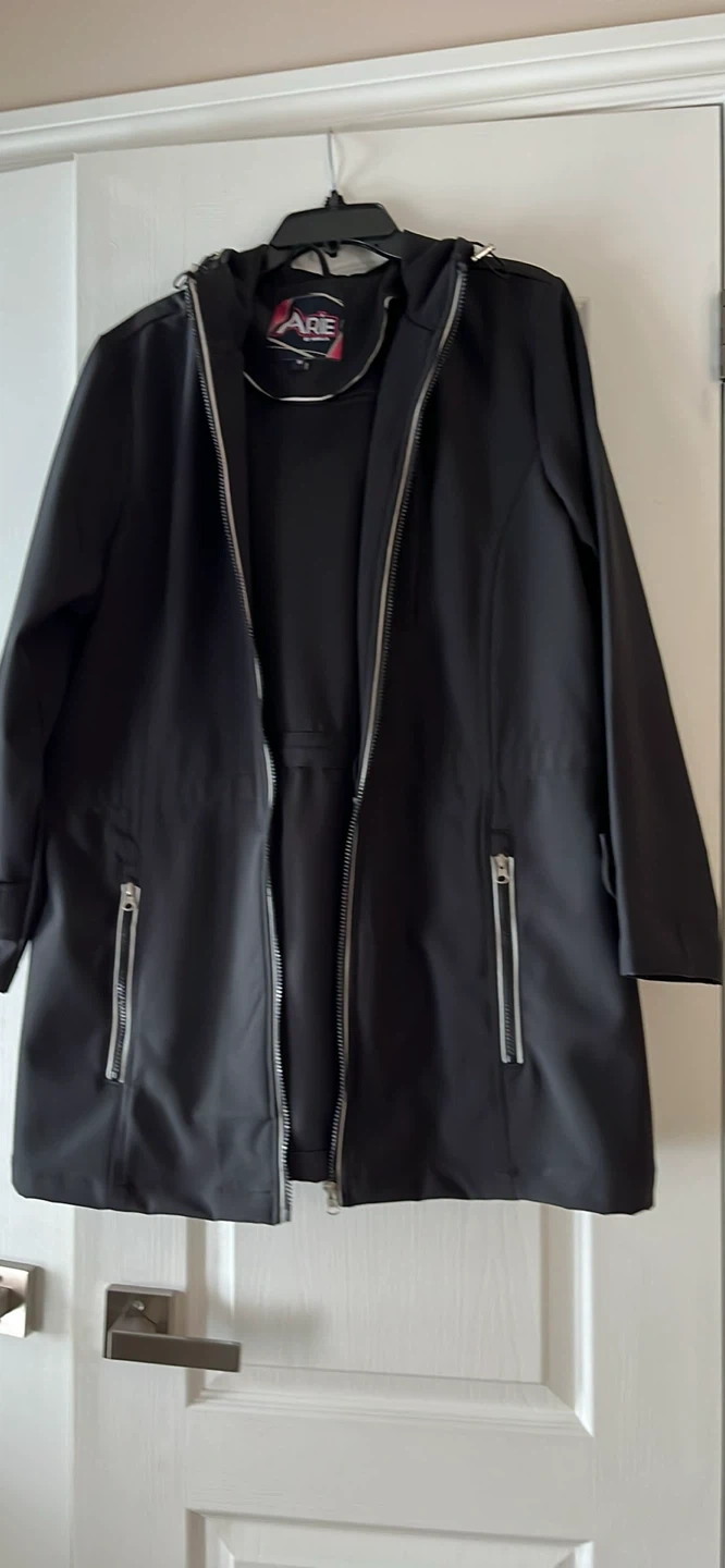 Selling a stylish black rain jacket from Arie by Ariella in size 1X! It's in great condition and features a sleek design with silver zippers. The original price tag shows $65, so you're getting a great deal!