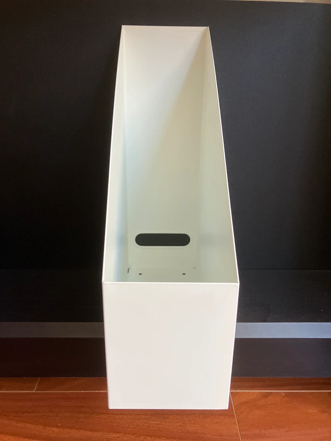 Here's a simple and clean white magazine file holder, made out of metal. It's perfect for keeping your magazines, brochures, or documents organized on a shelf or desk.
