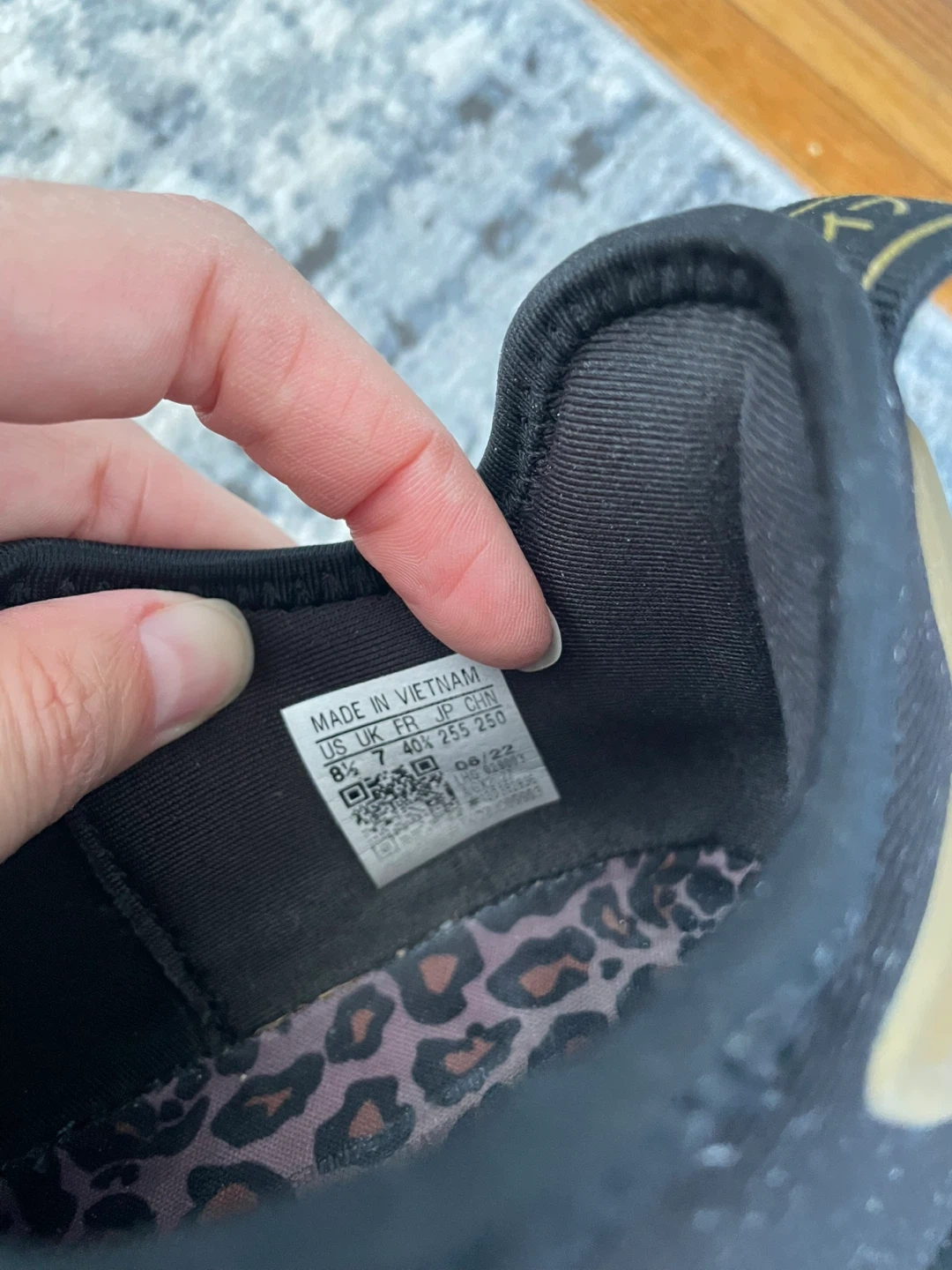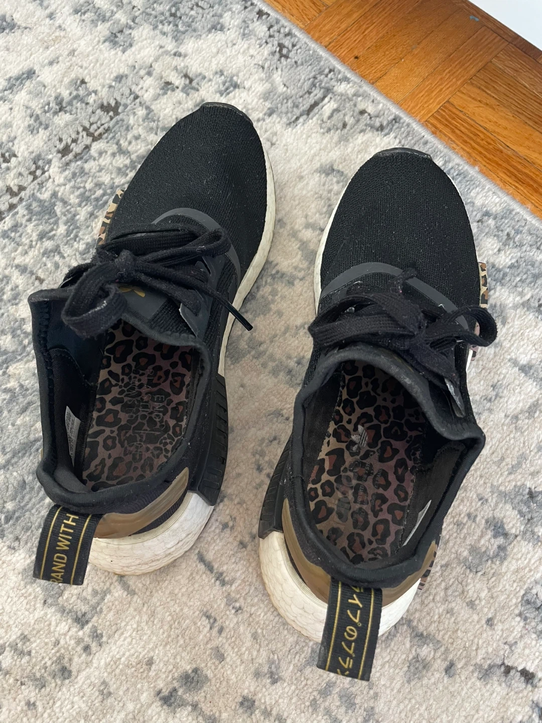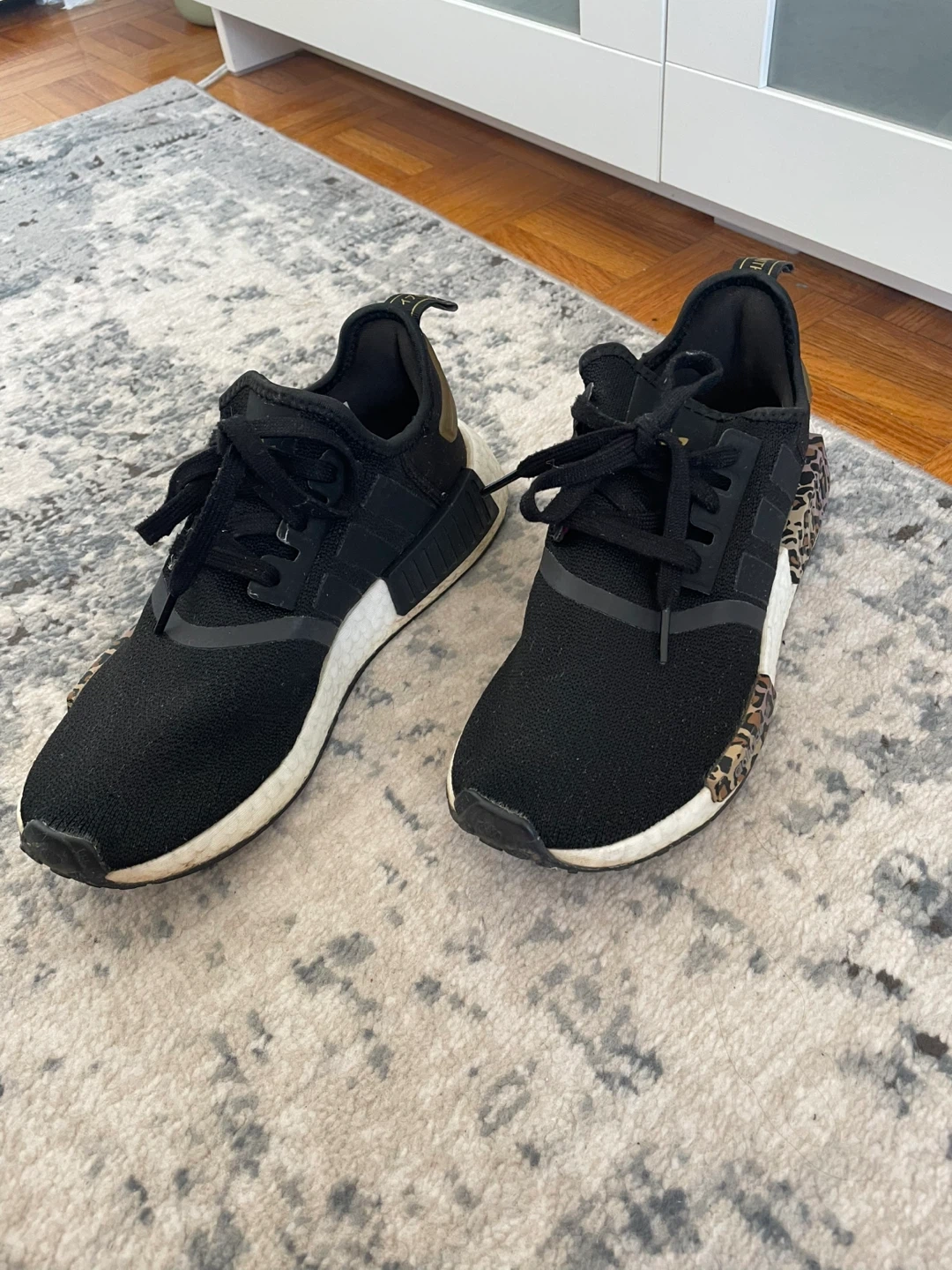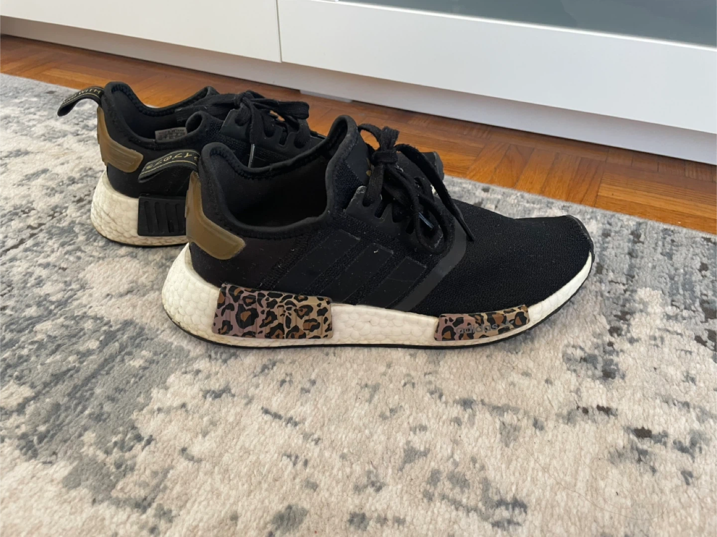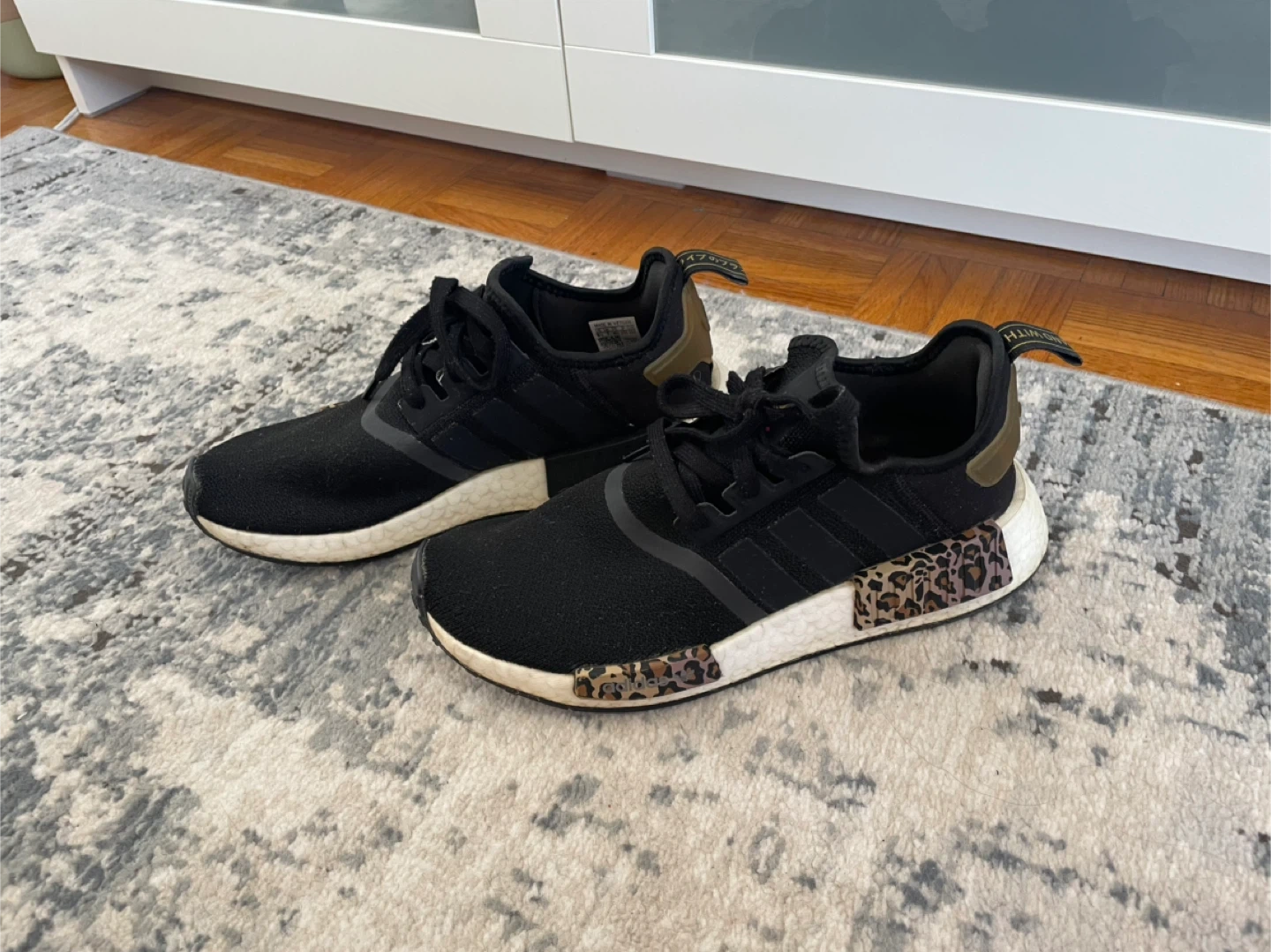 Selling a pair of Adidas NMD R1 sneakers in black with cool leopard print accents! They're in great shape and ready for a new owner. The size is not indicated on the shoe, please refer to the photos for details.