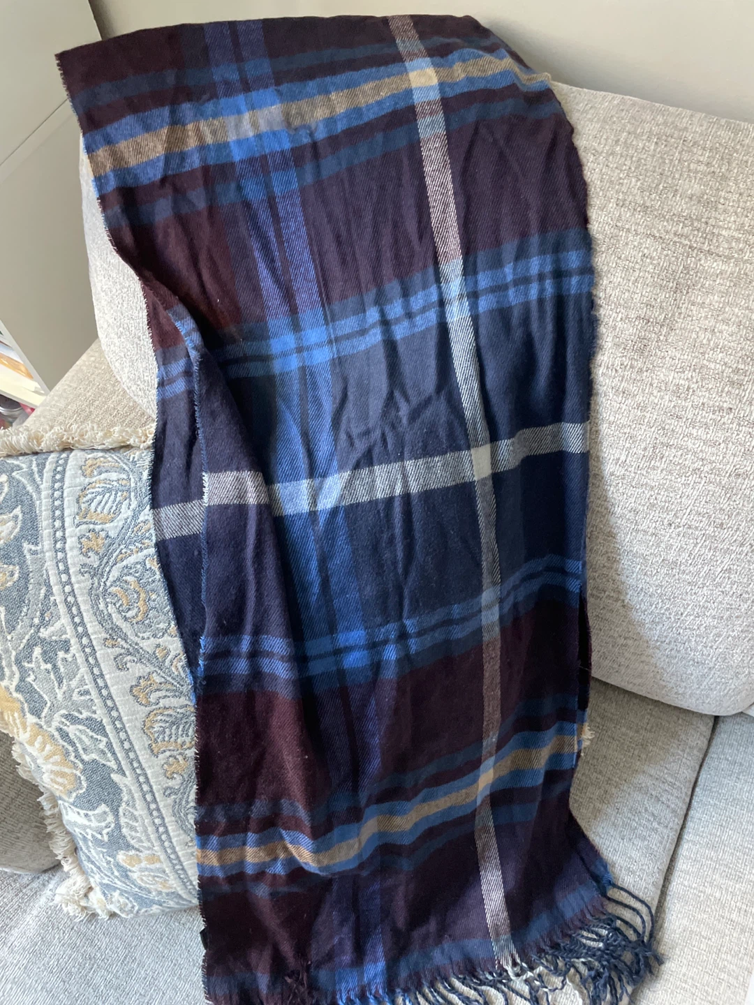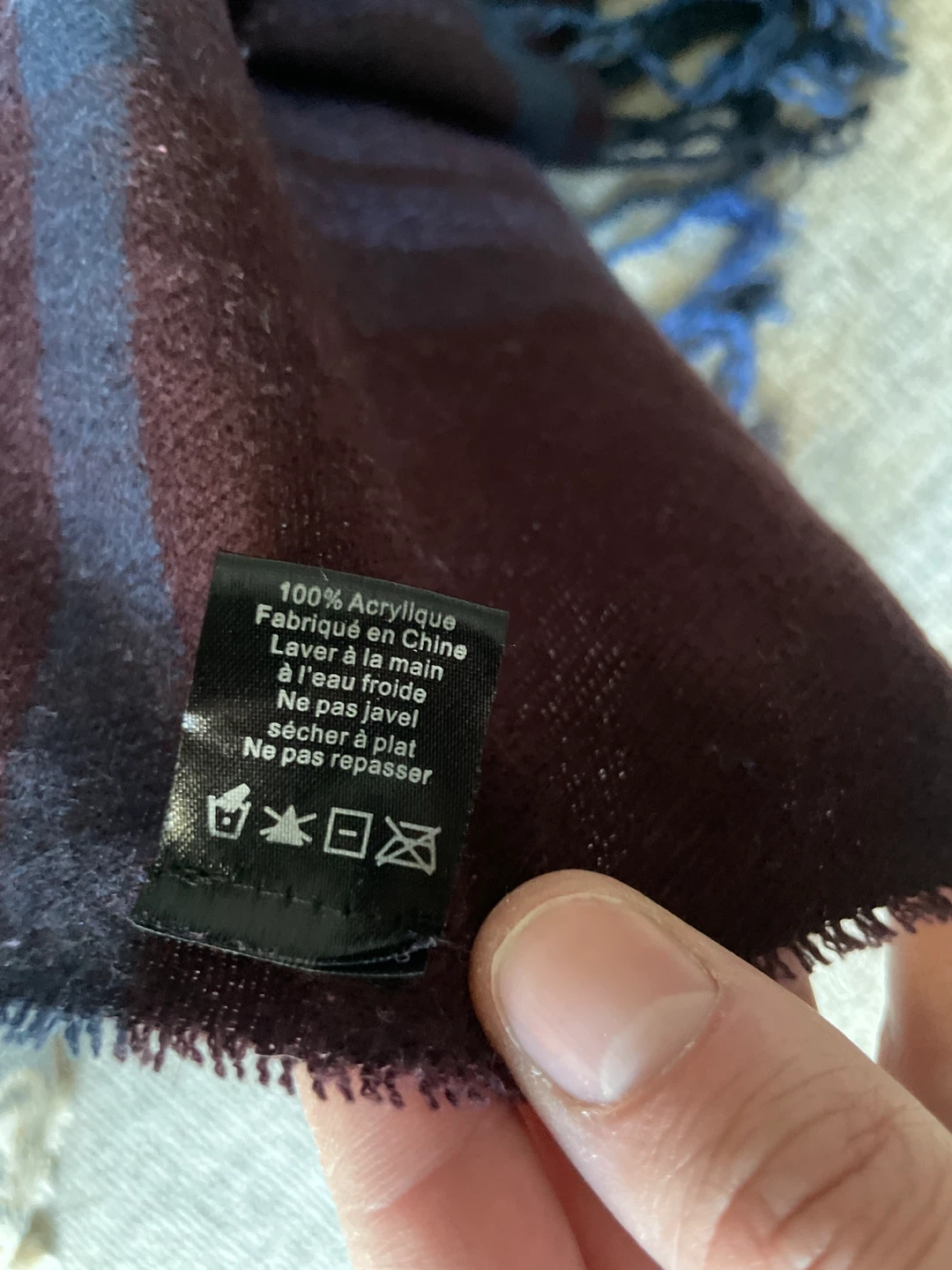 Here's a cozy scarf made of 100% acrylic! It's got a lovely plaid pattern with shades of burgundy, blue, and cream. Perfect for adding a touch of warmth and style to any outfit