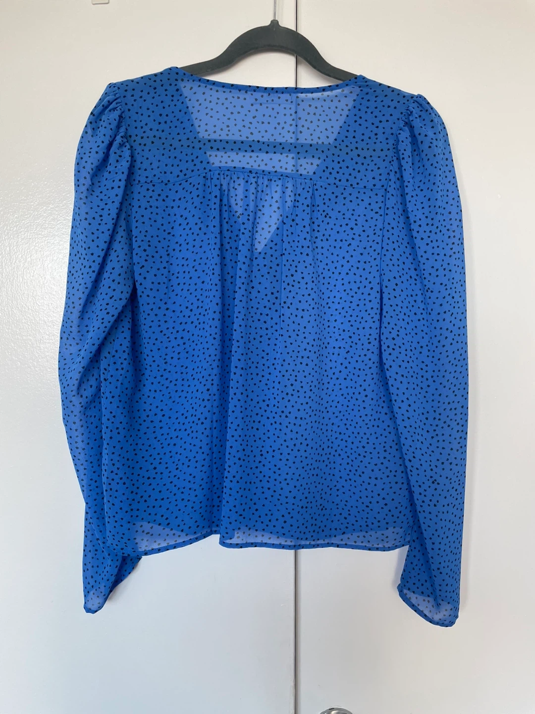 Selling a cute MNG blouse in a bright blue colour with black polka dots! It's a size M and has long sleeves. Perfect for dressing up or down, and in great condition
