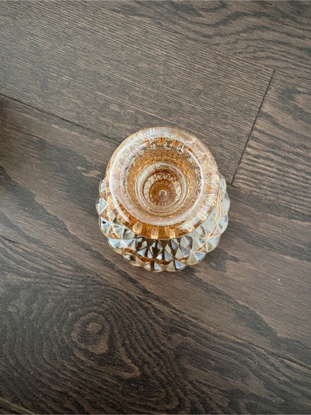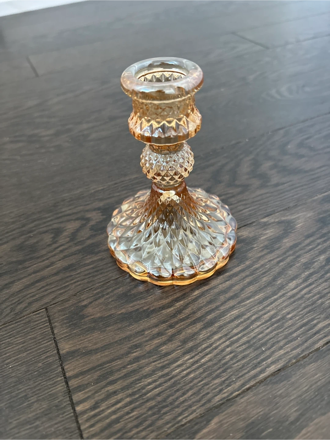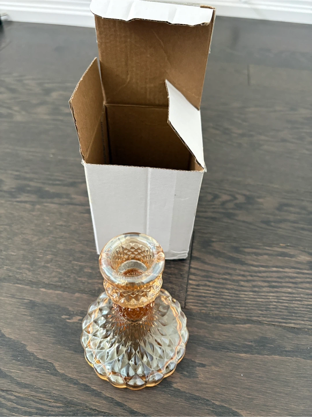 Selling a cute glass candlestick holder. It's in great condition and comes with its original box. Perfect for adding a touch of warmth to any room!