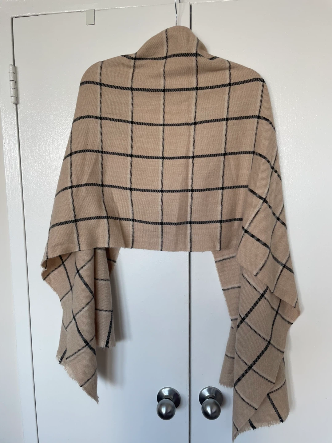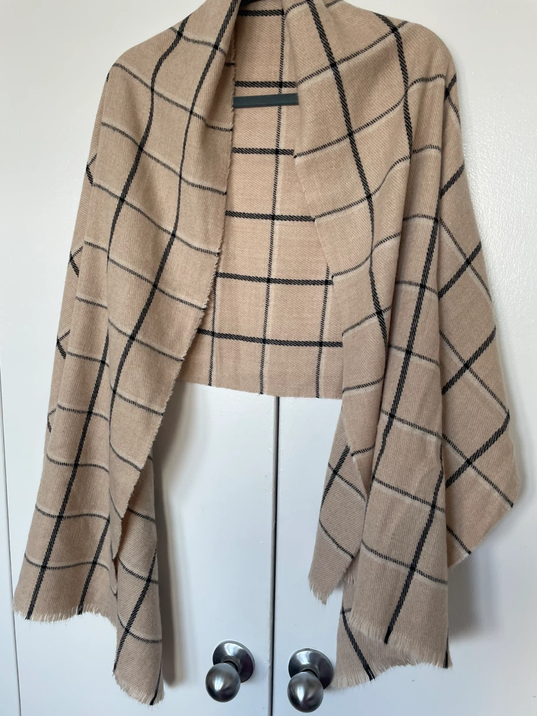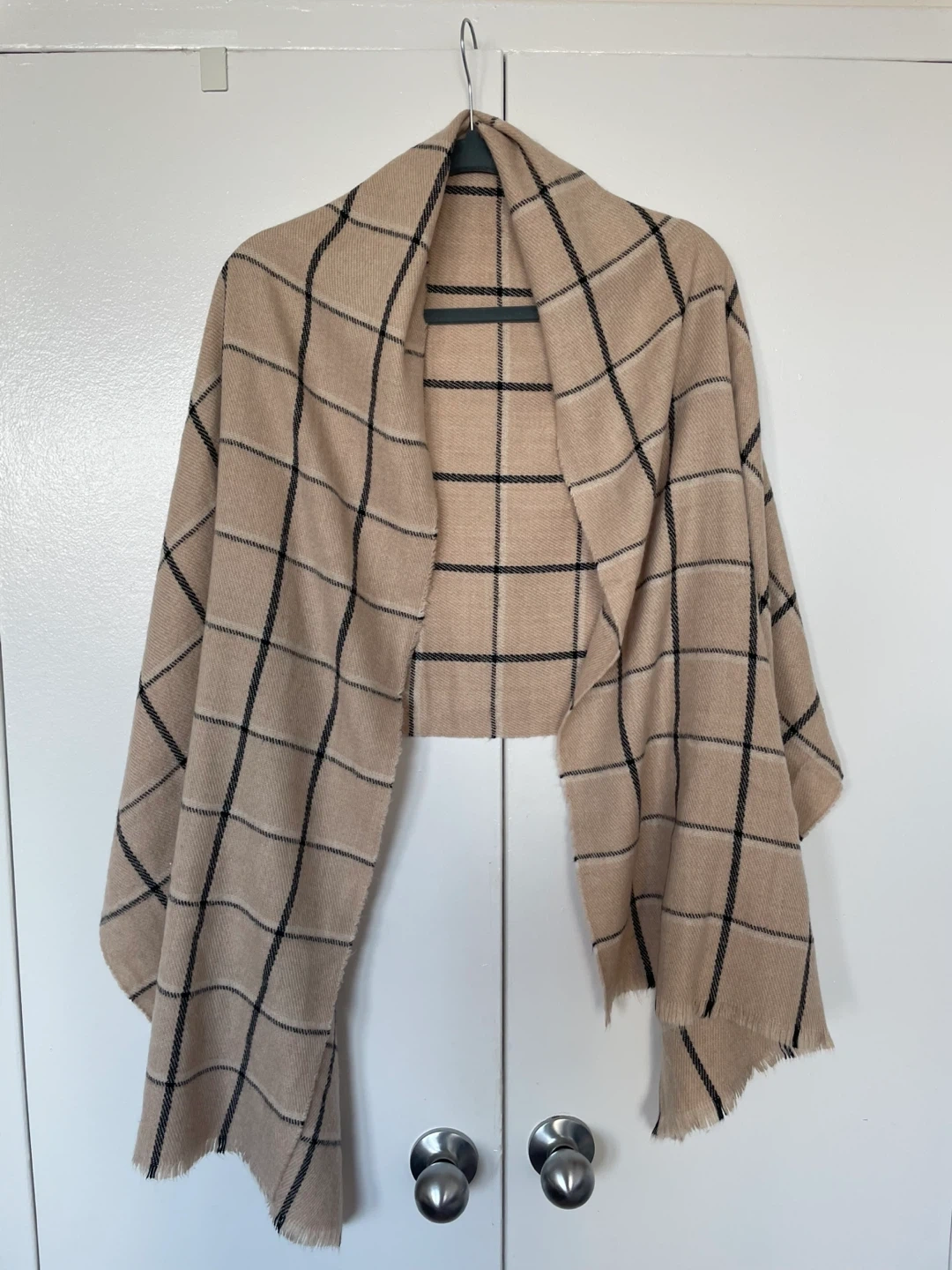 Selling a beige scarf with a black plaid pattern. It's in great condition and would be perfect for adding a cozy touch to any outfit! The material feels soft and warm, making it ideal for cooler weather.