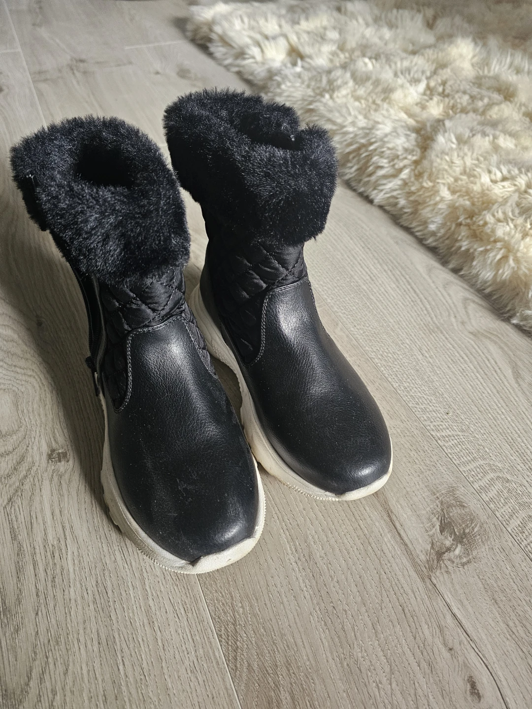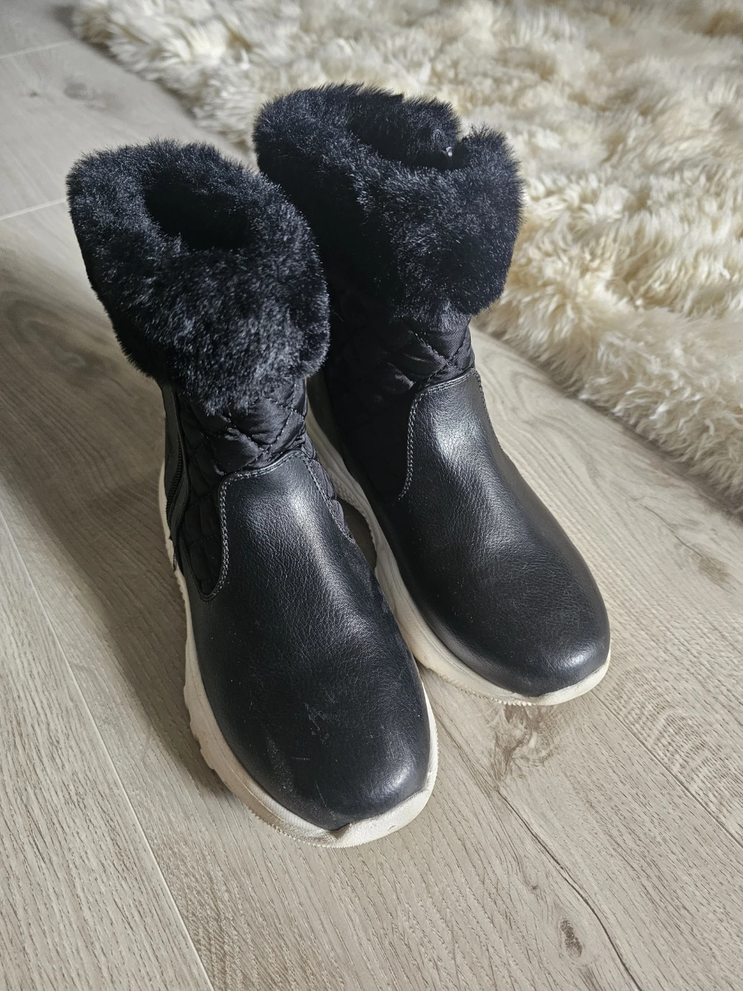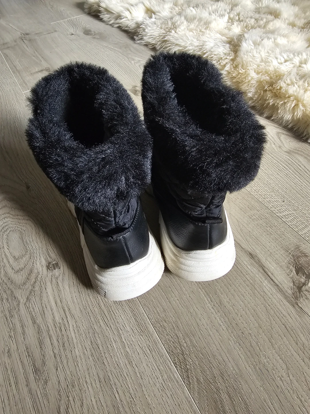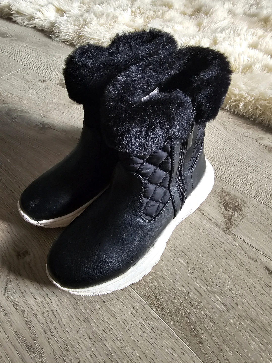 These black winter boots are perfect for keeping your feet warm and stylish! They feature a faux fur trim, a quilted design, and a comfortable white sole. Great for the cold weather!
