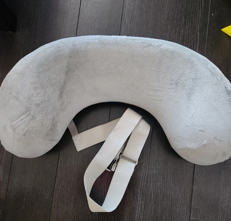 Here's a comfy grey breastfeeding pillow! It's in good condition and ready for your next trip. Perfect for long flights or car rides to keep you cozy and supported