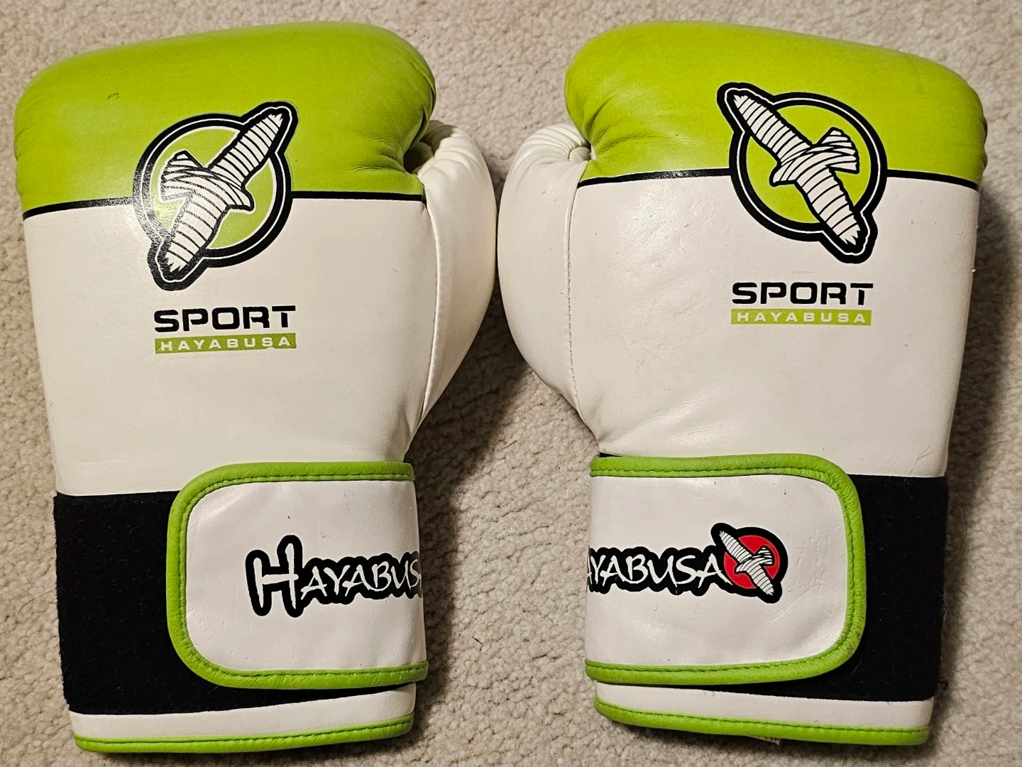 Selling a pair of Hayabusa Sport boxing gloves designed for teen/adult unisex use. They're white with green accents and in great condition. Great for sparring or bag work!