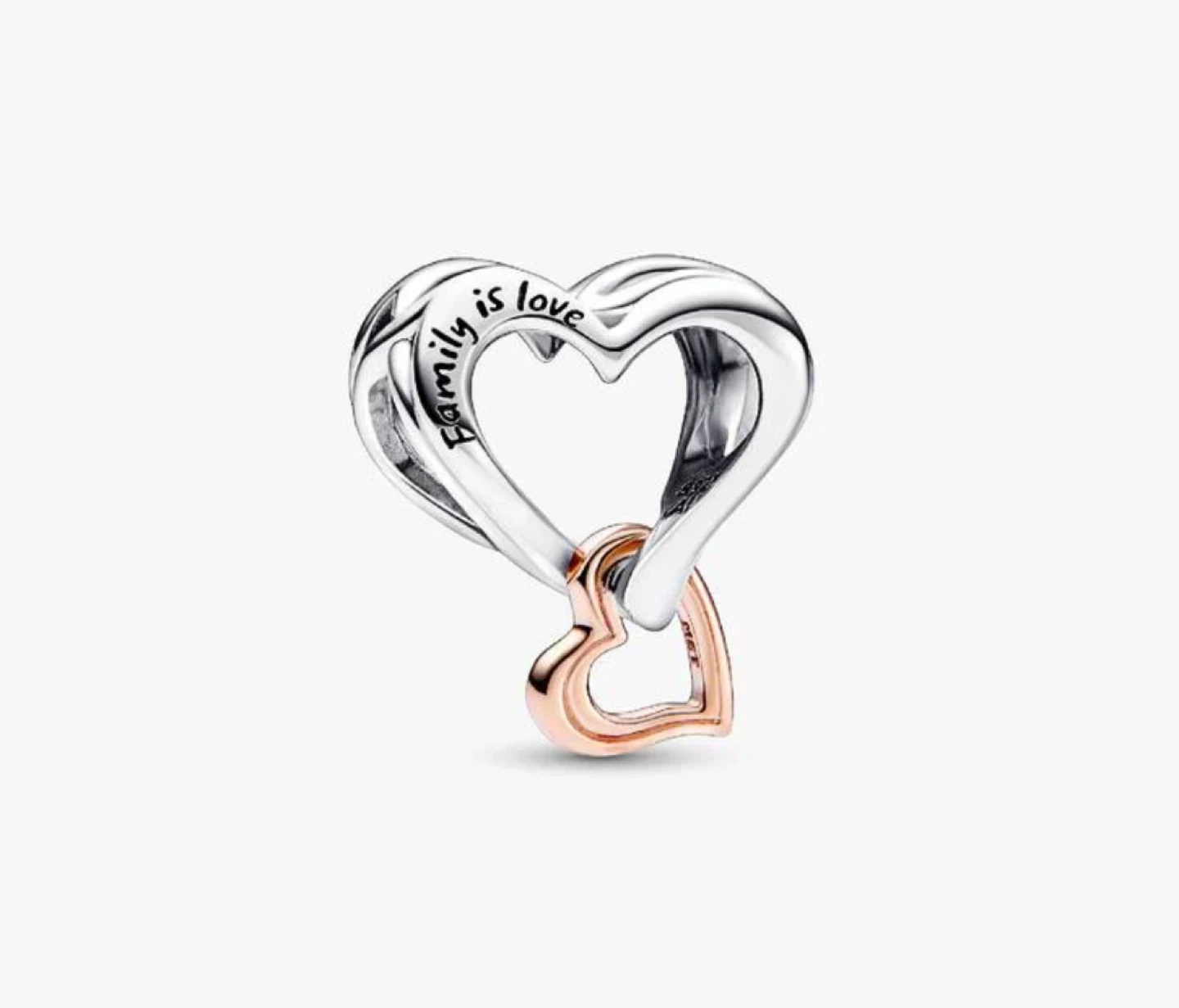A tribute to your family's infinite love. A sterling silver openwork heart links through a smaller heart in 14k rose-gold plating, representing eternal family ties. The bigger heart features two infinity symbols and the engraved message "Family is love". Comes with box and bag.