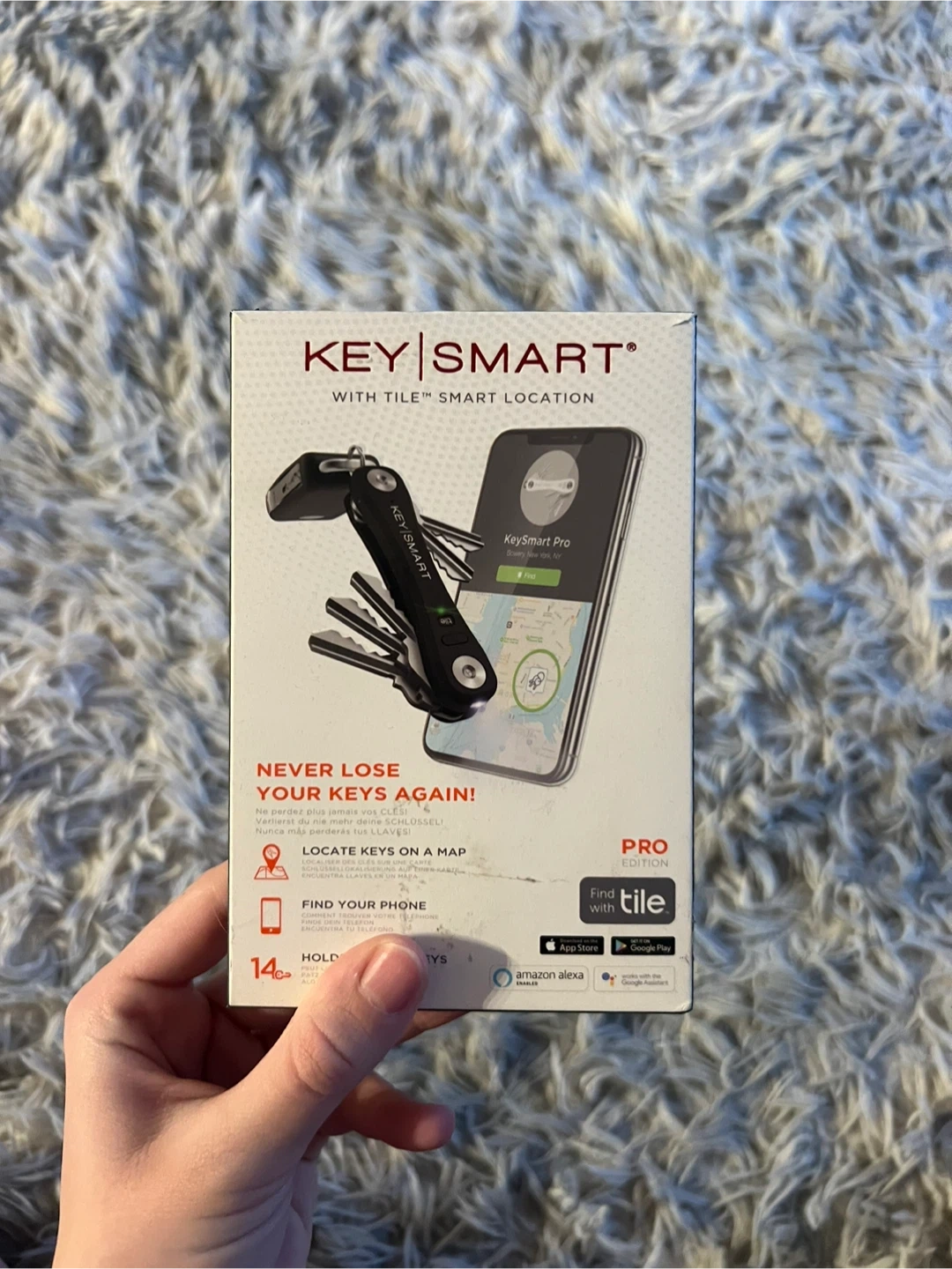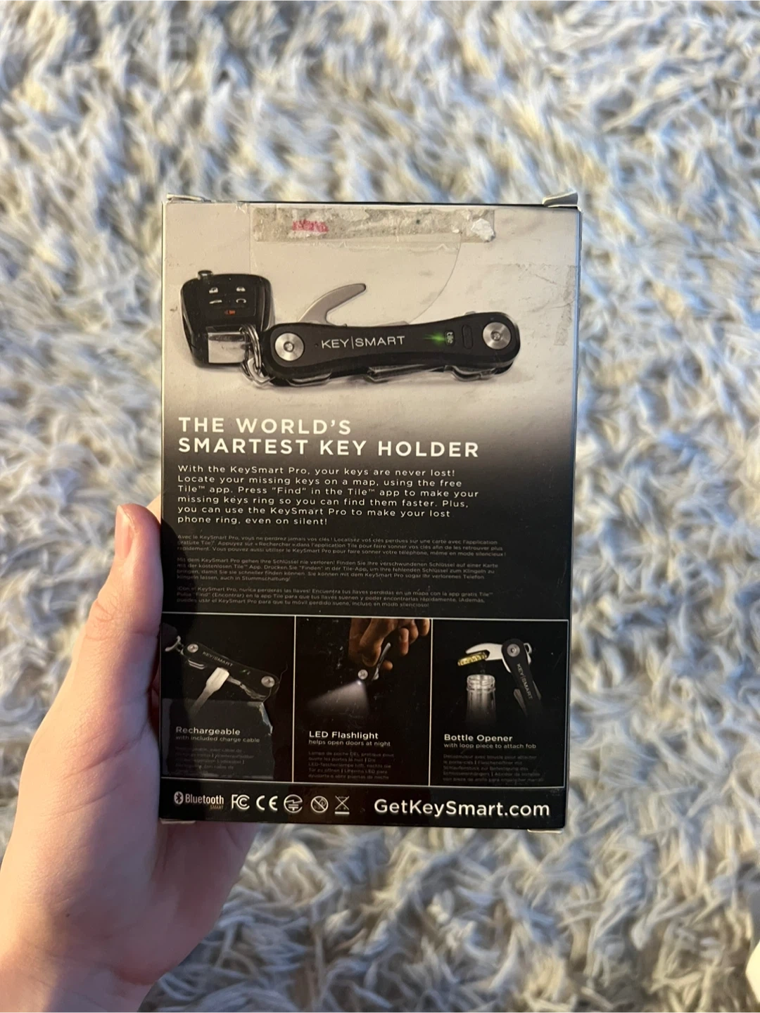 The KeySmart Pro helps you never lose your keys! Locate your missing keys on a map with the free Tile app. You can even use the KeySmart Pro to make your lost phone ring, even when it's silent! The box and user manual are included, as well as a rechargeable charge cable.