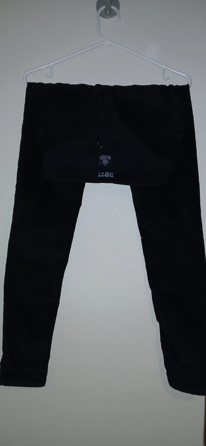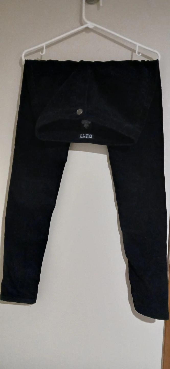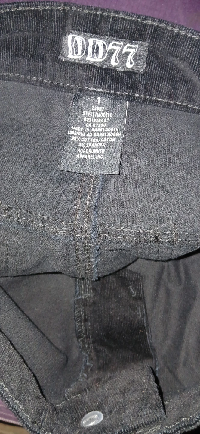 Here are some DD77 black corduroy pants in size 1. They are made of 98% cotton and 2% spandex.