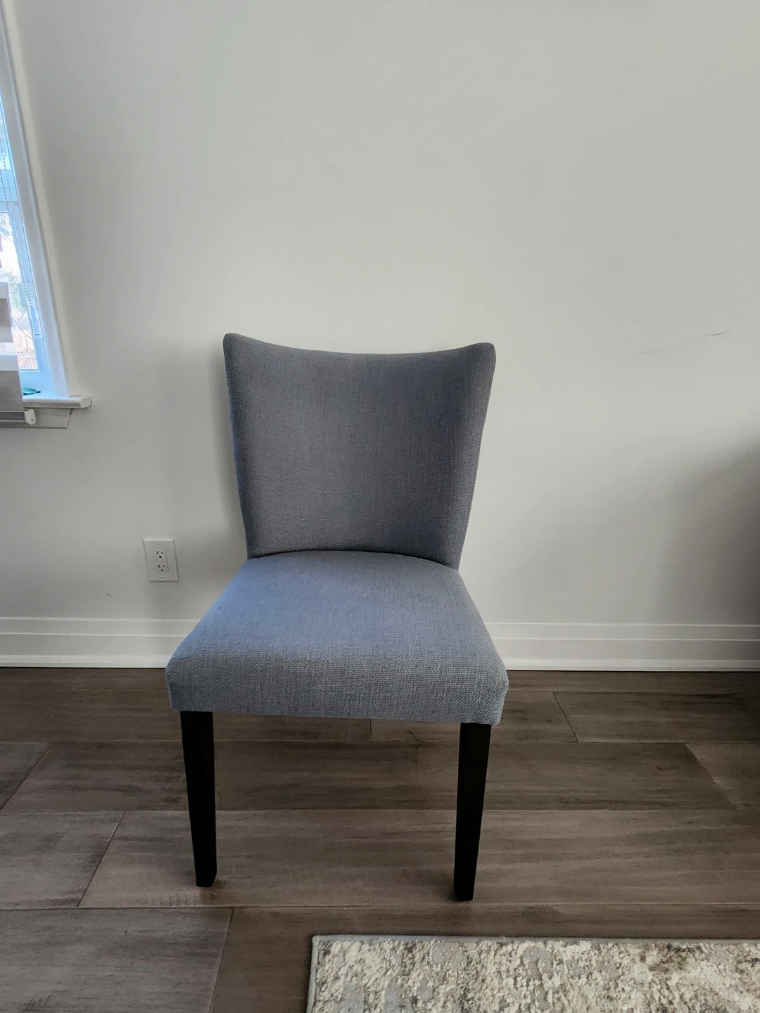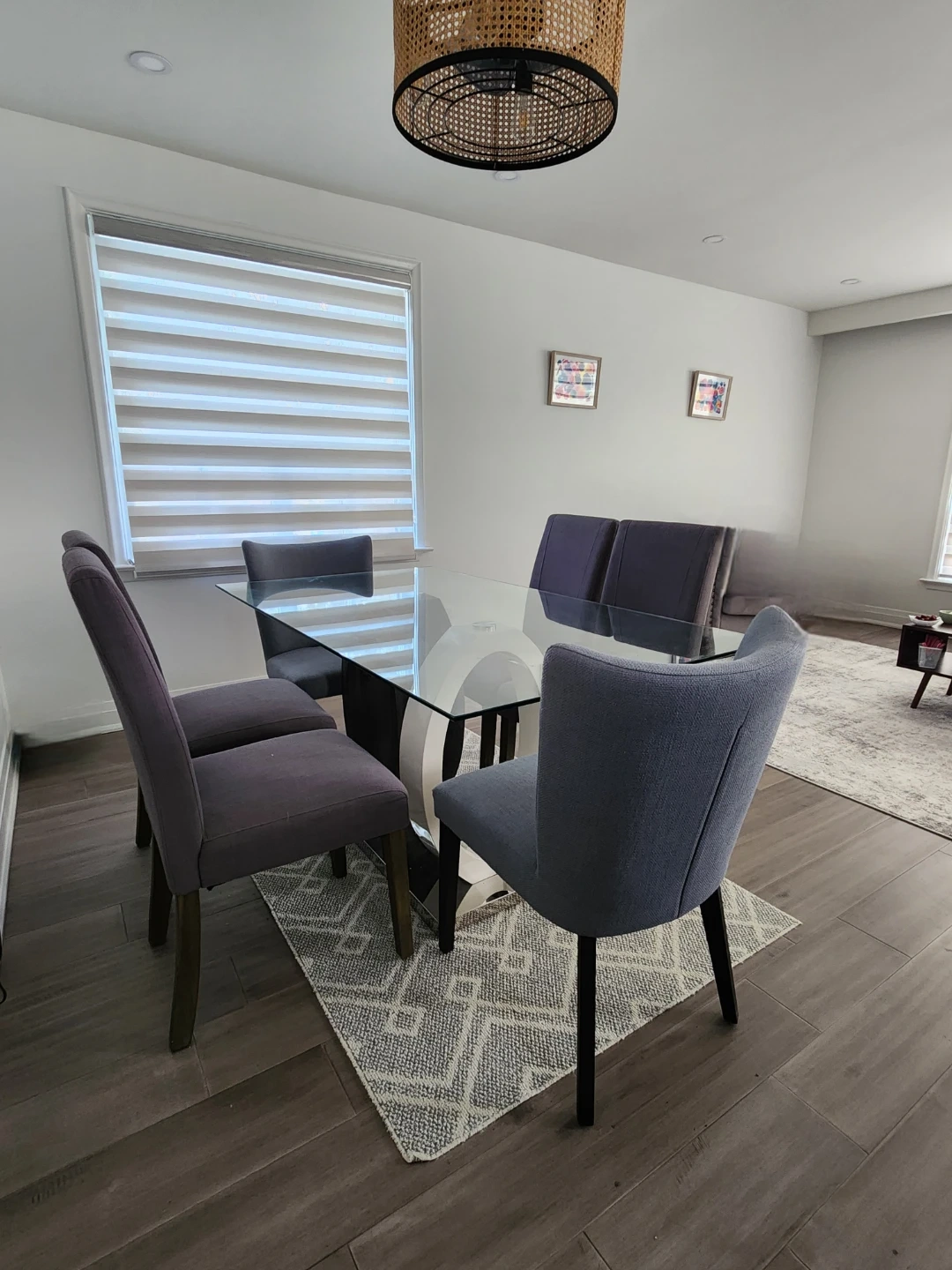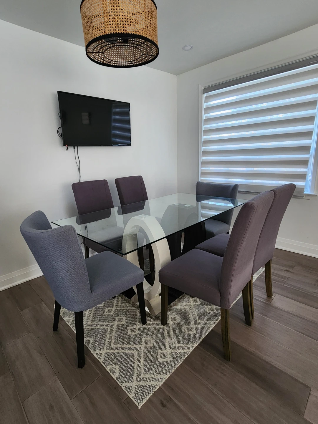 Selling a dining table with a glass top and six chairs. The chairs are a lovely grey/purple colour and the table has a unique white and black base. Perfect for a dining room or kitchen!