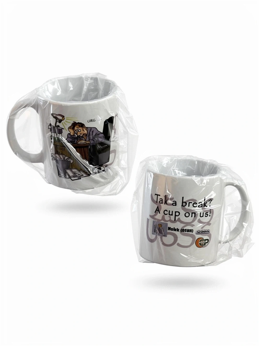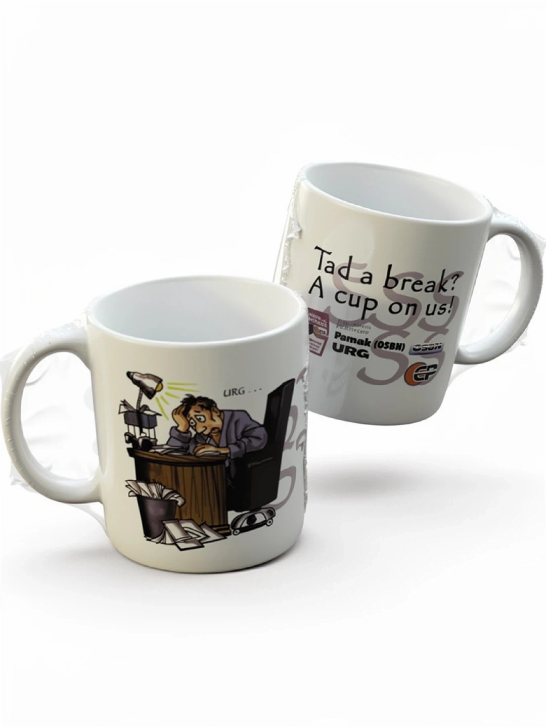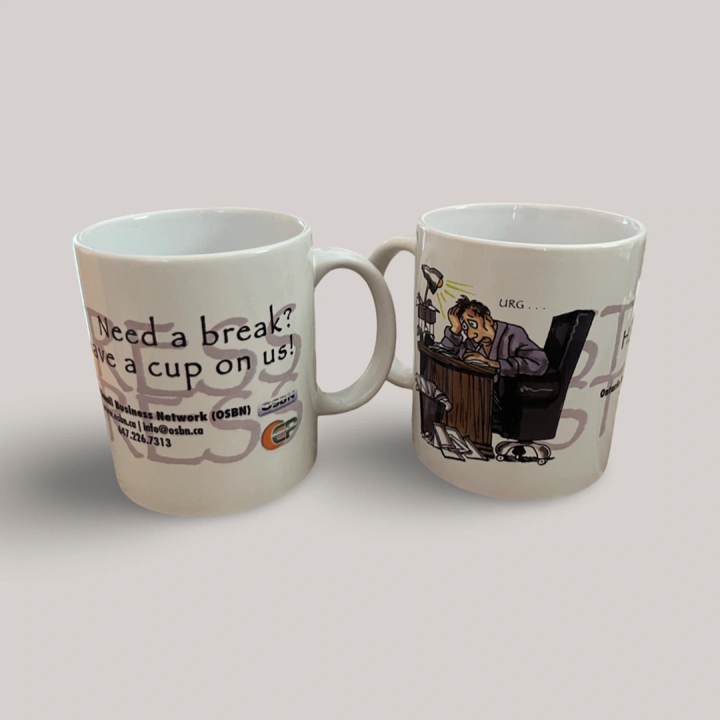 Selling a set of two coffee mugs featuring the OSBN (Oakville Small Business Network) logo. One side of the mug has the text "Need a break? Have a cup on us!" and the other has a cartoon image of a person at a desk looking stressed.
