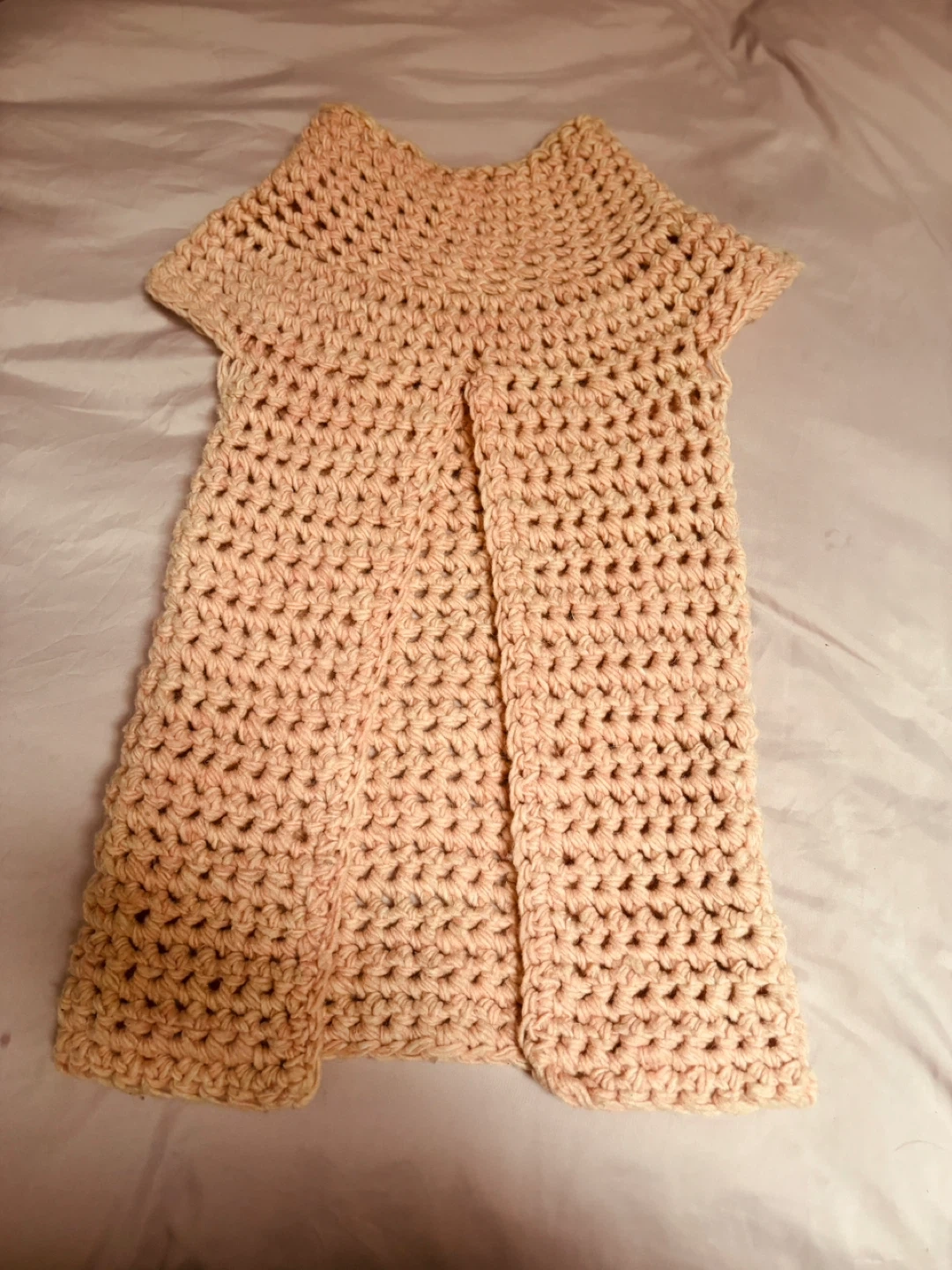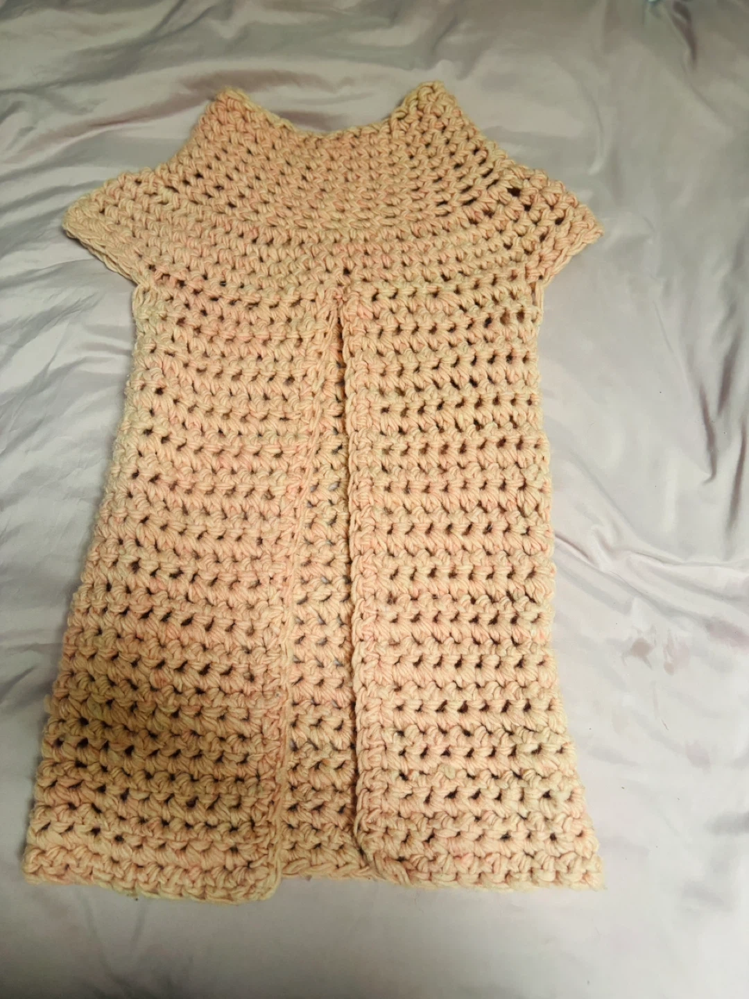 Selling a handmade crochet cardigan in a lovely peach colour. It's a unique piece, perfect for layering or adding a touch of handmade charm to your outfit