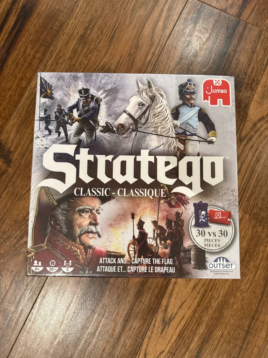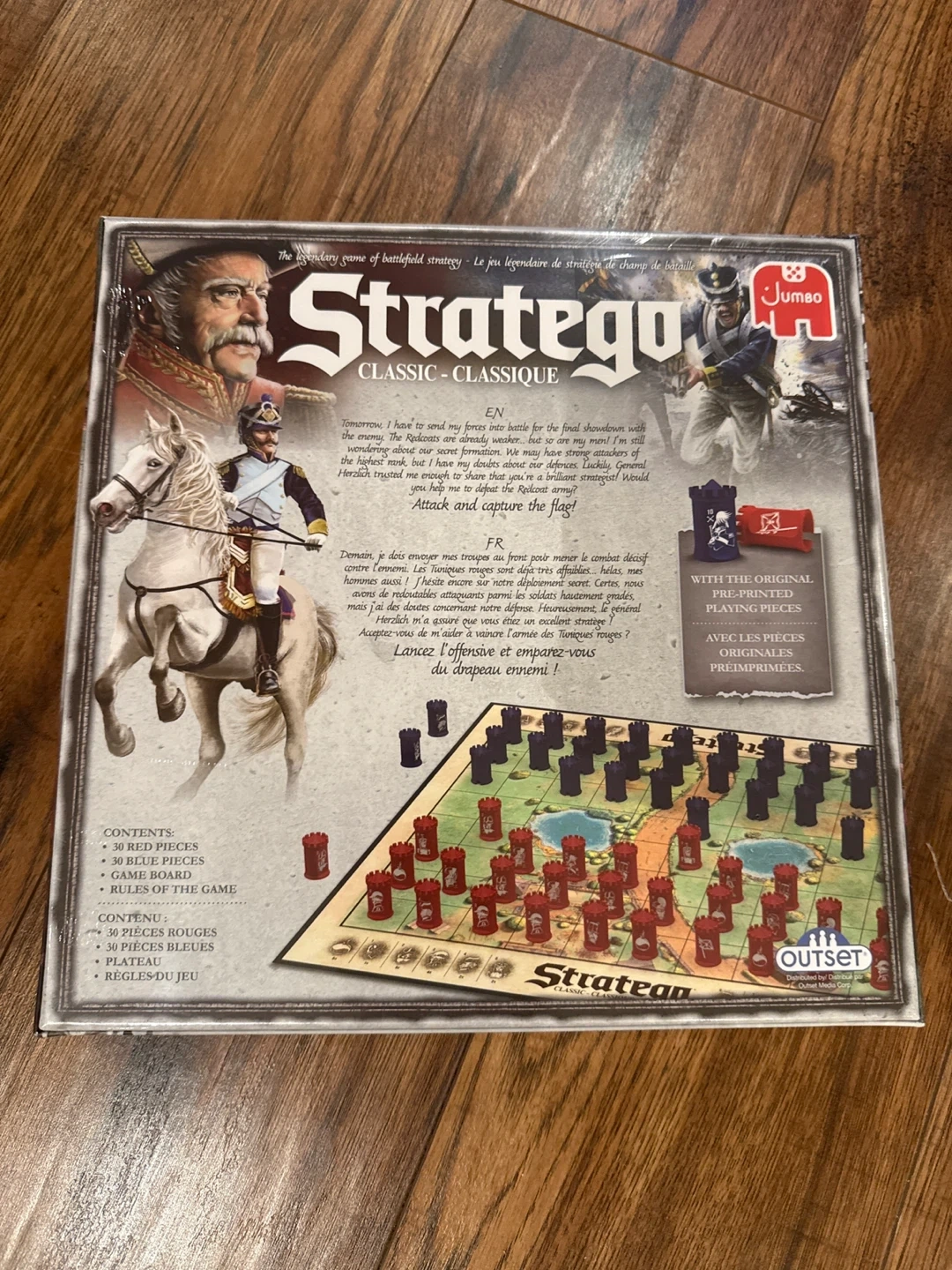 Selling a Stratego Classic board game by Jumbo Outset! It's a strategy game for 2 players, ages 8+. The game includes 60 pieces (30 red and 30 blue), a game board, and the rules of the game. Attack and capture the flag!