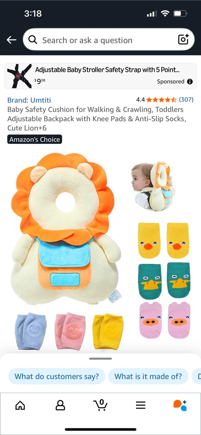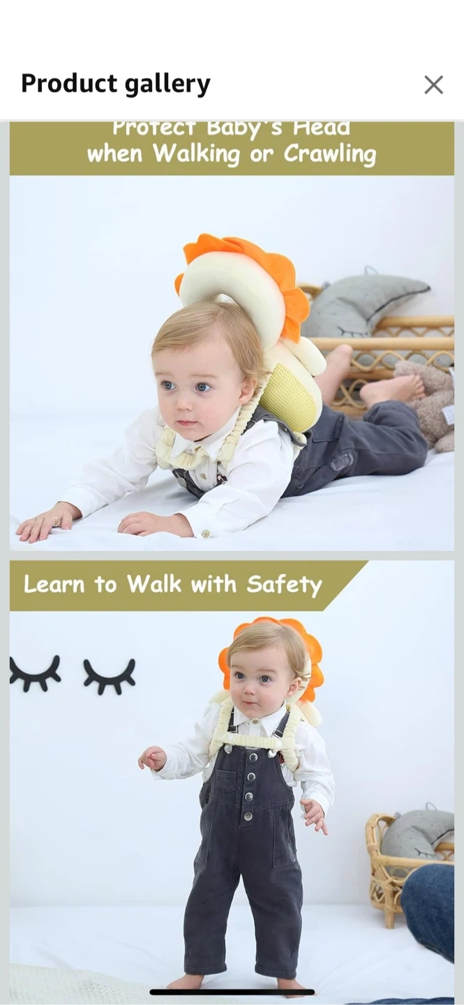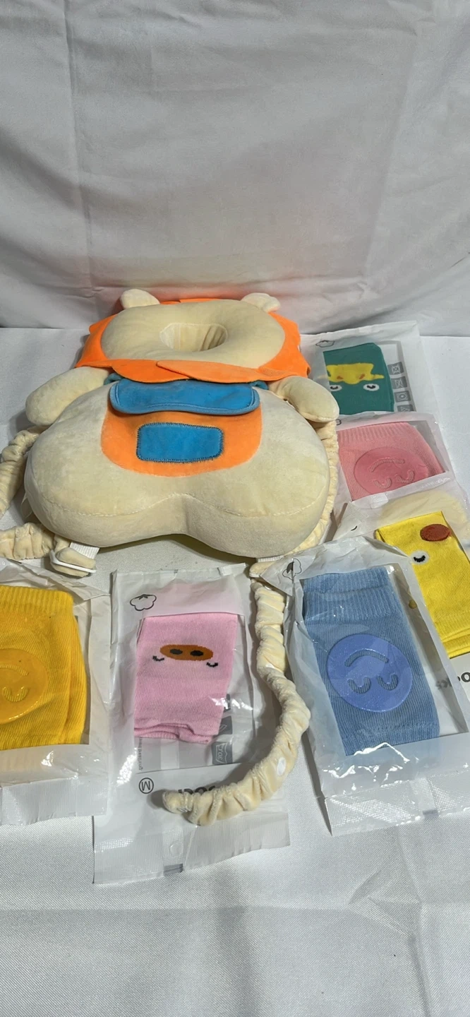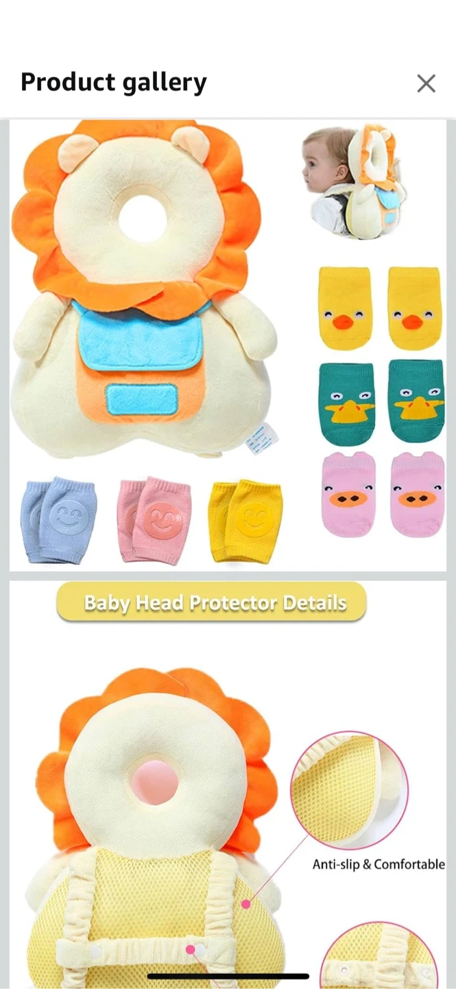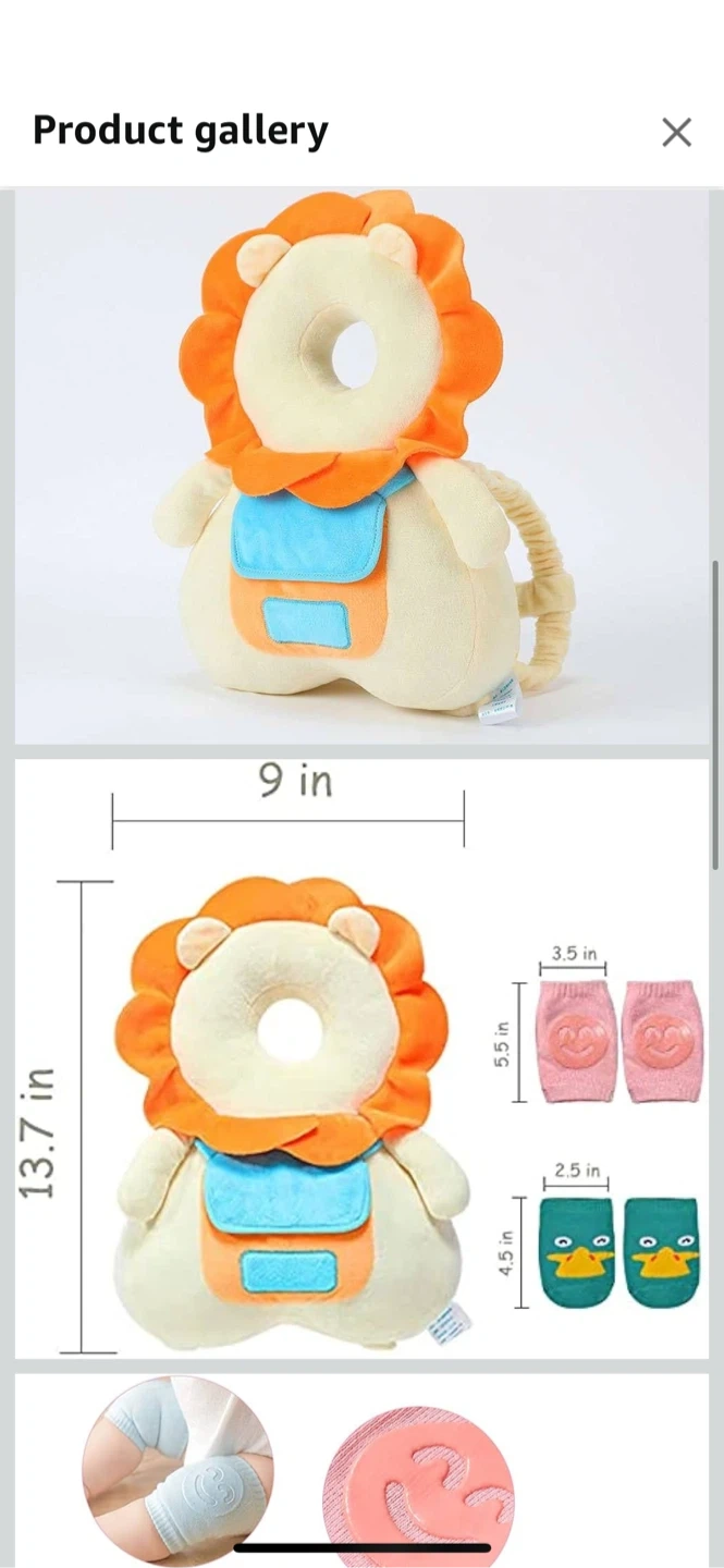 This set includes a baby head protector backpack and knee pads to protect your little one while they learn to walk or crawl. The head protector is designed with a cute lion design and measures 9 inches wide and 13.7 inches tall. The knee pads are also included for extra protection!