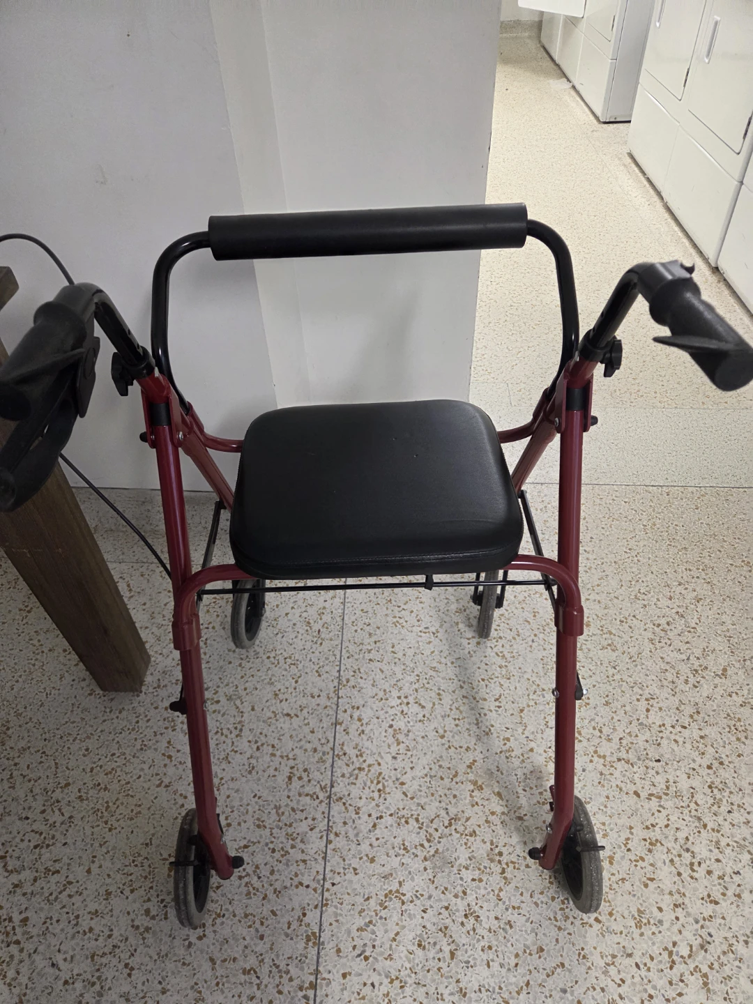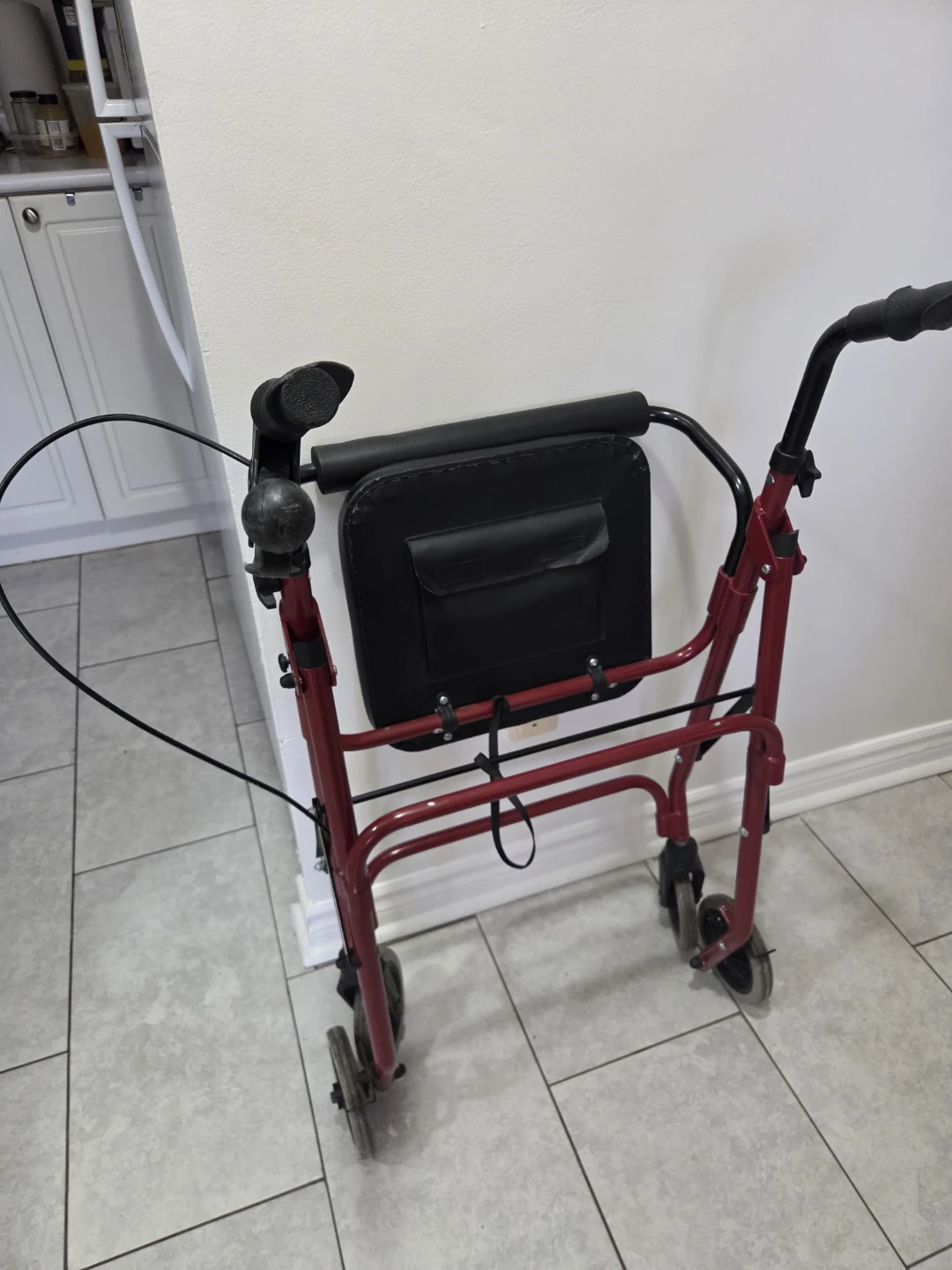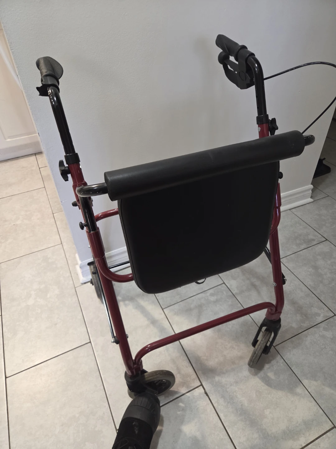 Selling a red walker with a seat! It's in excellent condition and ready to help someone get around comfortably. The walker has a black seat and hand grips,light and foldable.