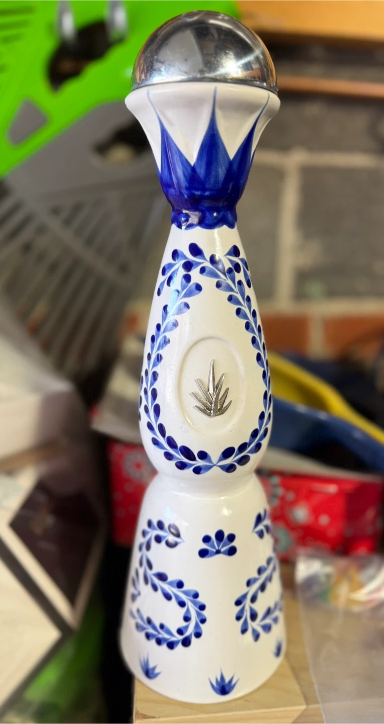 The bottle is white with blue floral patterns and a silver agave logo. Hand painted. Metal cap and ceramic bottle.
