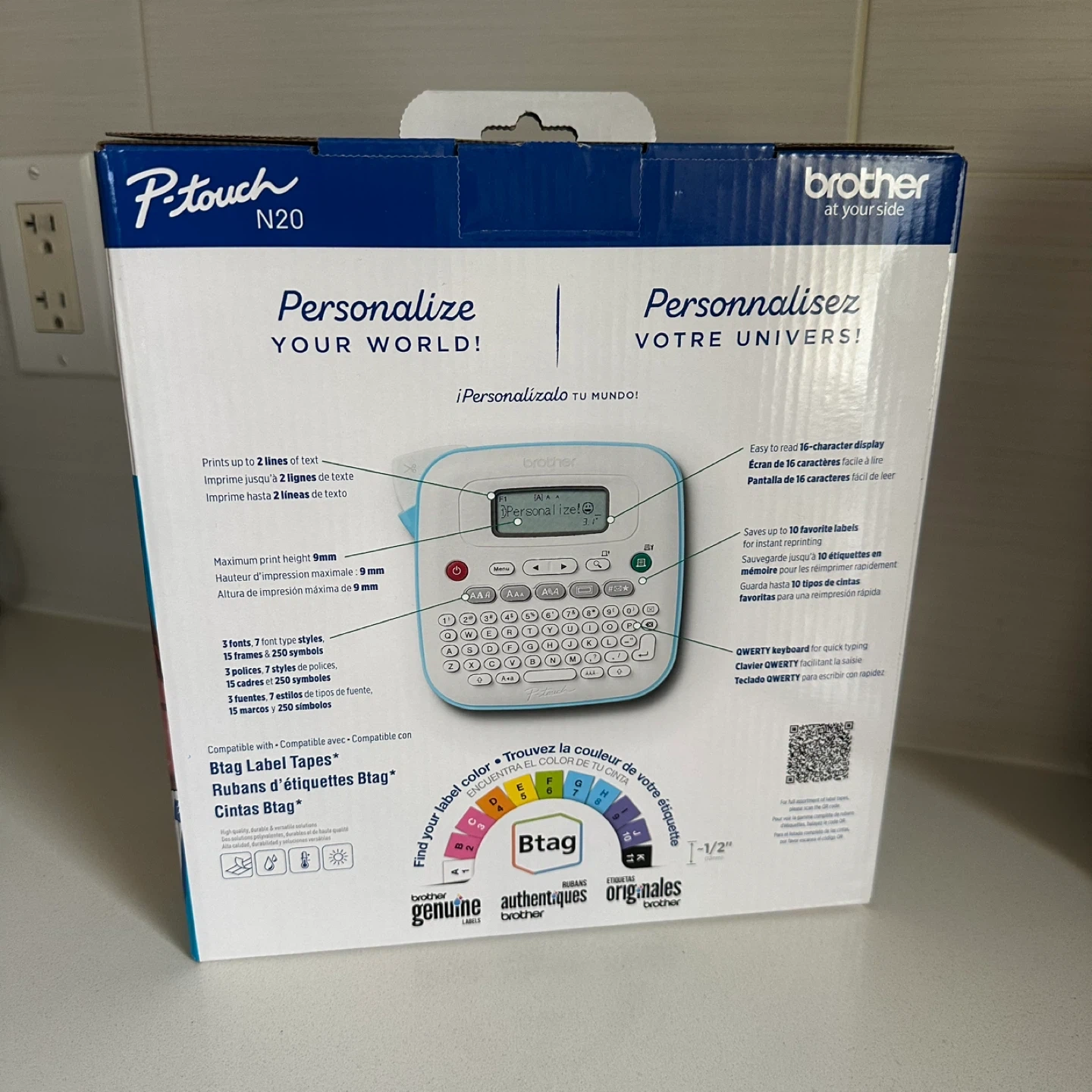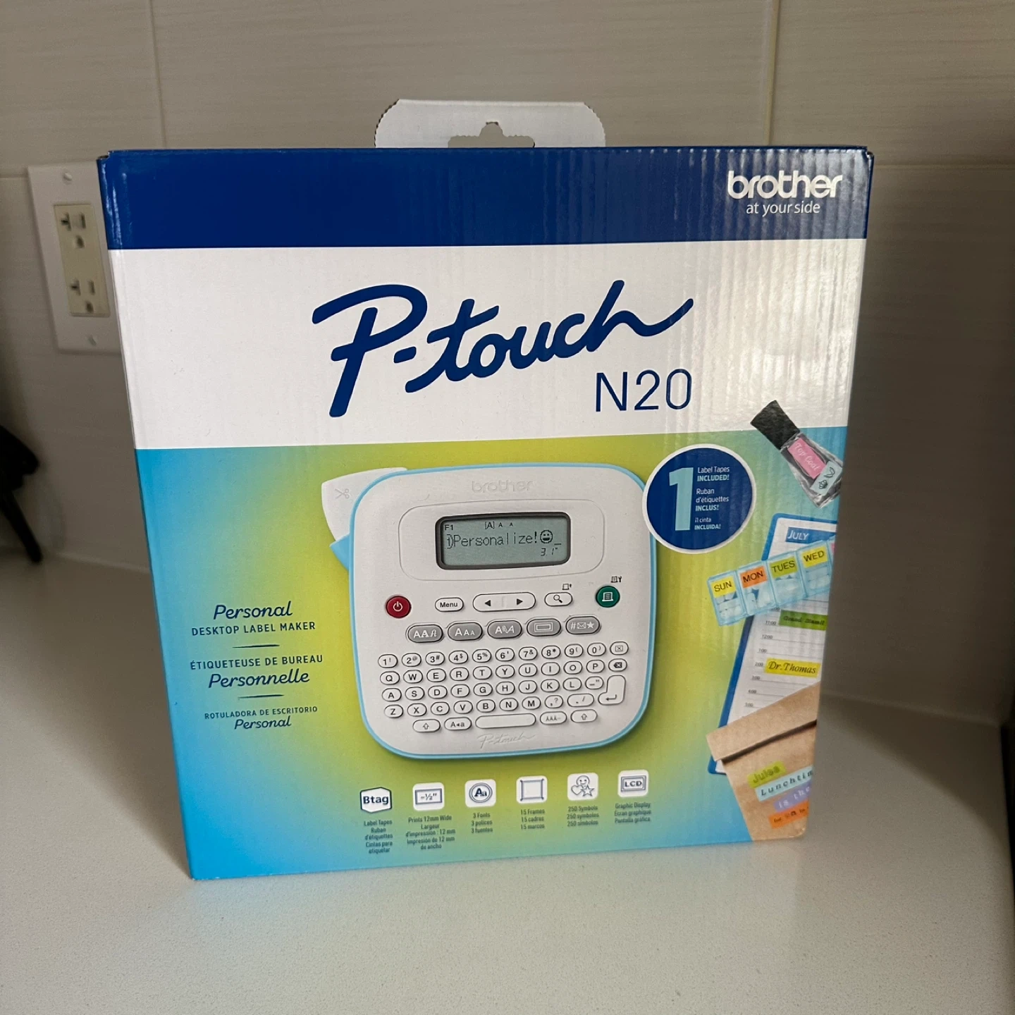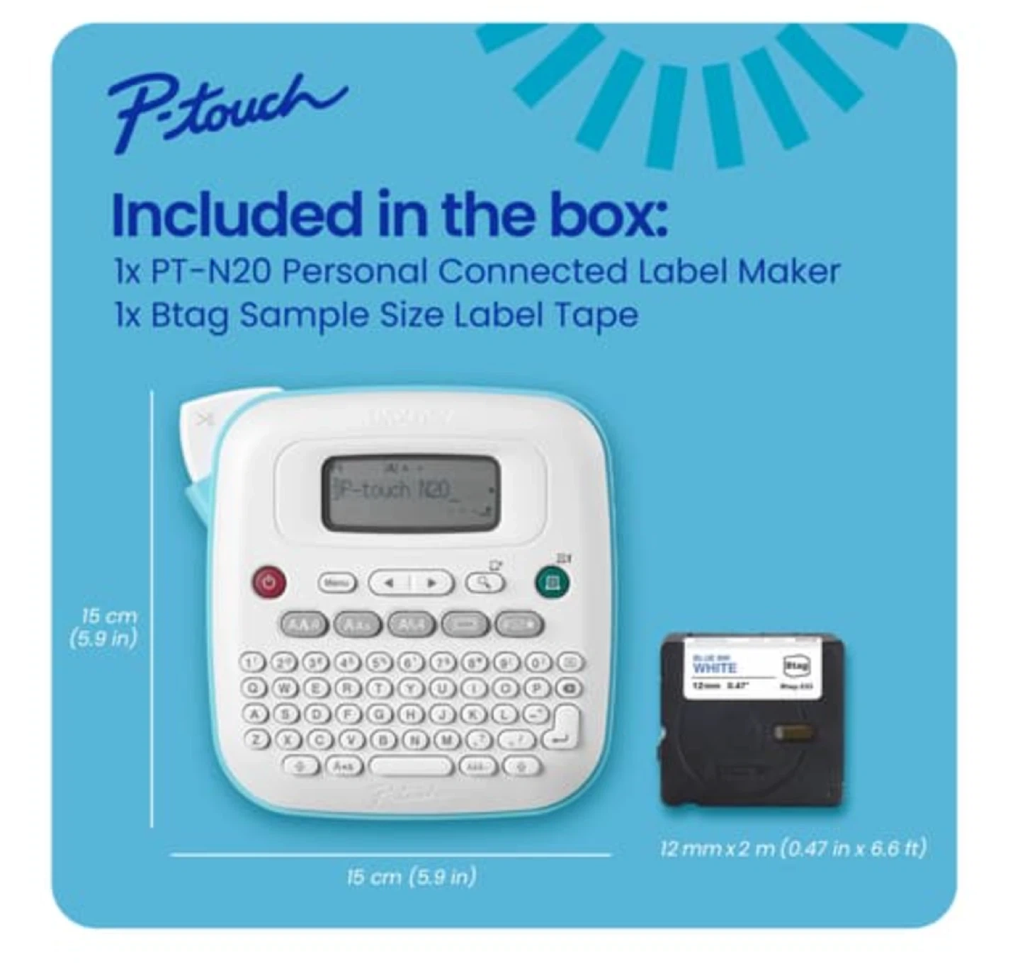 Brand new (never been used or out of the box) Brother P-Touch N20 personal desktop label maker. One of three P-touch models designed exclusively for use with Brother Btag non-laminated 12 mm (~½ in.) label tapes in 17 colourful varieties. The PT-N20 can help you easily personalize your world and organize nearly everything in it. With a portable design and full QWERTY keyboard, typing is fast, familiar, and comfortable. Plus, the easy to read 15-character display helps you eliminate typos and mistakes by previewing your labels before they’re printed. P-touch label makers and Btag tapes let you create affordable customized labels with up to 2 lines of text and choose between 3 fonts, 7 font styles, 15 frames and 250 symbols. The PT-N20 also saves up to 10 labels for quick and convenient re-printing so you don’t have to format new ones every time you need them. Resistant to water, temperature, fading and household liquids, Btag label tapes are also microwave, dishwasher and freezer safe, making them an easy and cost-efficient way to personalize, organize and customize projects. Convenient power options. Plug-in or battery powered for convenient anywhere, anytime use. Requires 6 x AAA batteries (adapter and batteries sold separately).