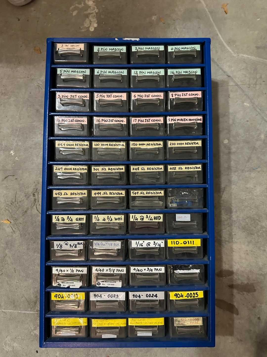 Here's a blue storage cabinet filled with various electronic components. The drawers are labelled with different types of connectors, resistors, and other parts. Great for organizing your electronics projects!