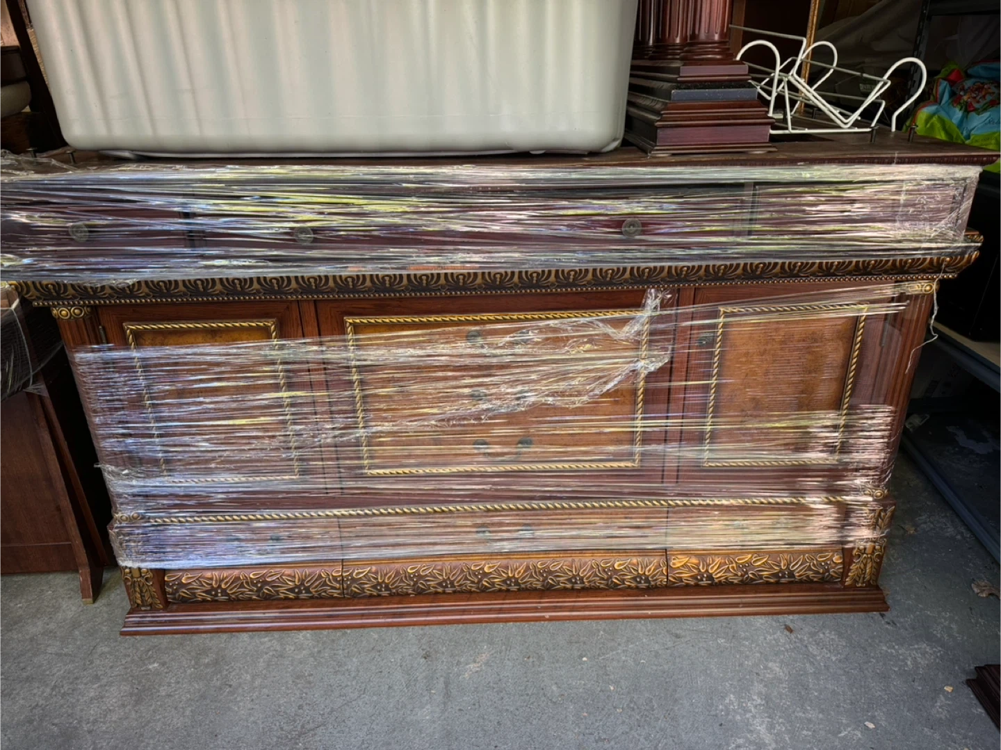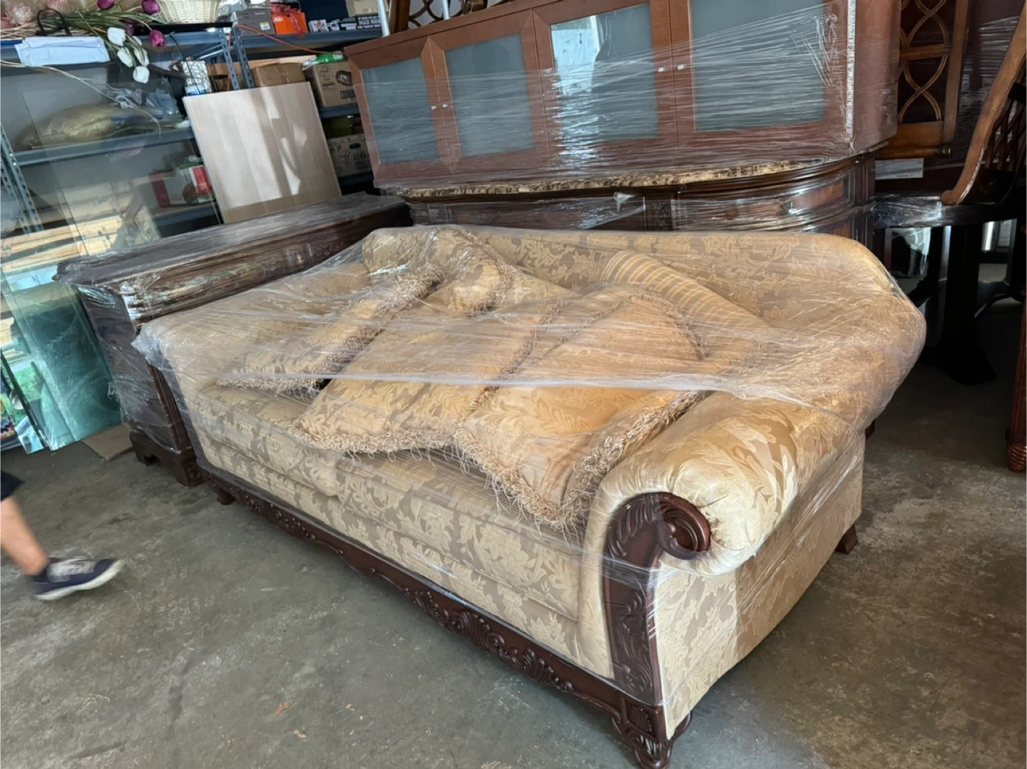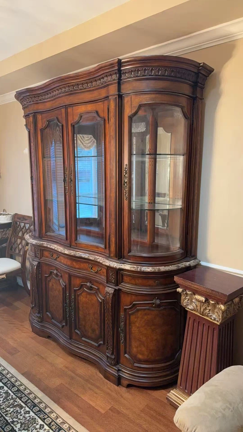 I have a collection of dark wood furniture that I no longer need. The set includes a dining table with chairs, a wine cabinet, a display cabinet, a dresser, nightstands, a set of sofa, coffee tables, and more. Although some pieces show minor signs of use, all are in good functional condition.