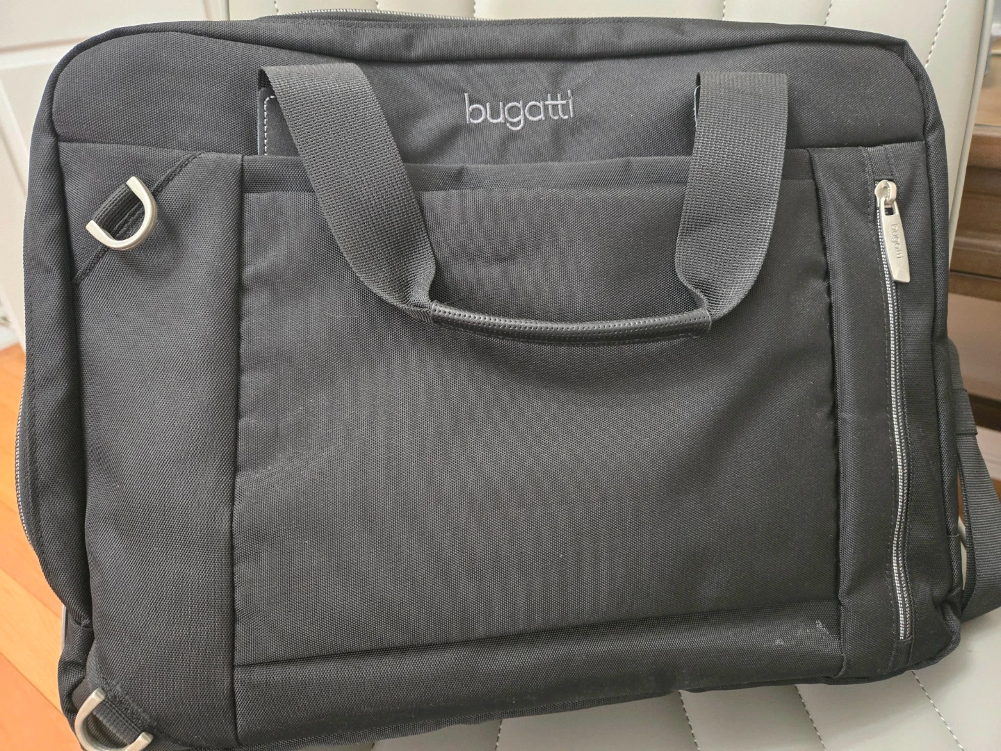 This is a black Bugatti laptop bag featuring 3 compartments. It has padded handles and a shoulder strap. It's great for carrying your laptop and work essentials.