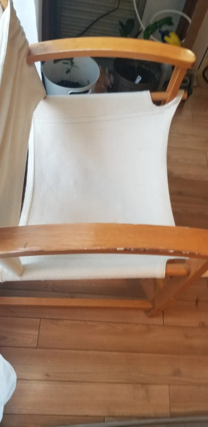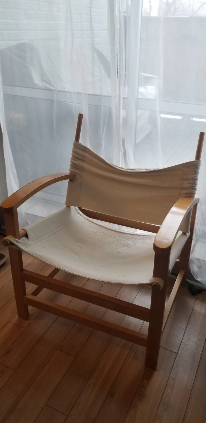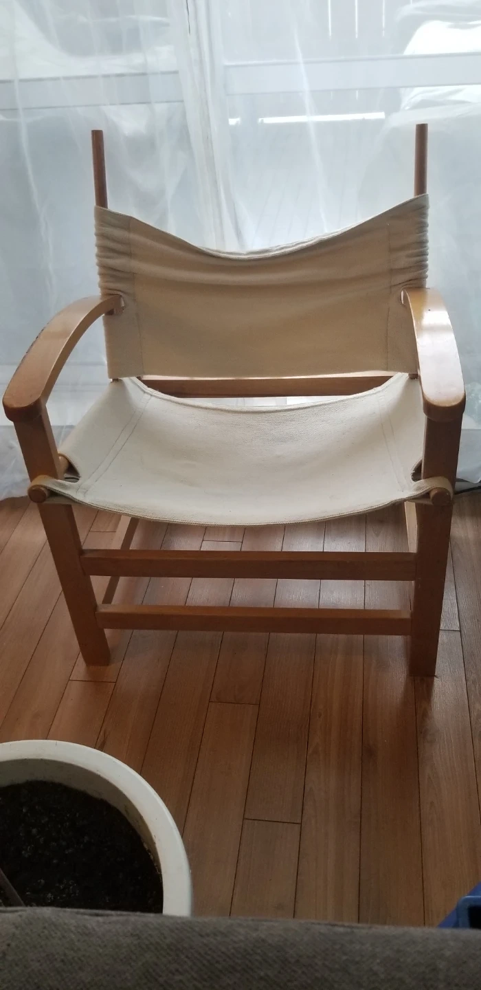 Safari chair with a wooden frame and canvas seat and back. Other than a few scratches on one side (shown in pic) It's in good condition and would be a great addition to any room!