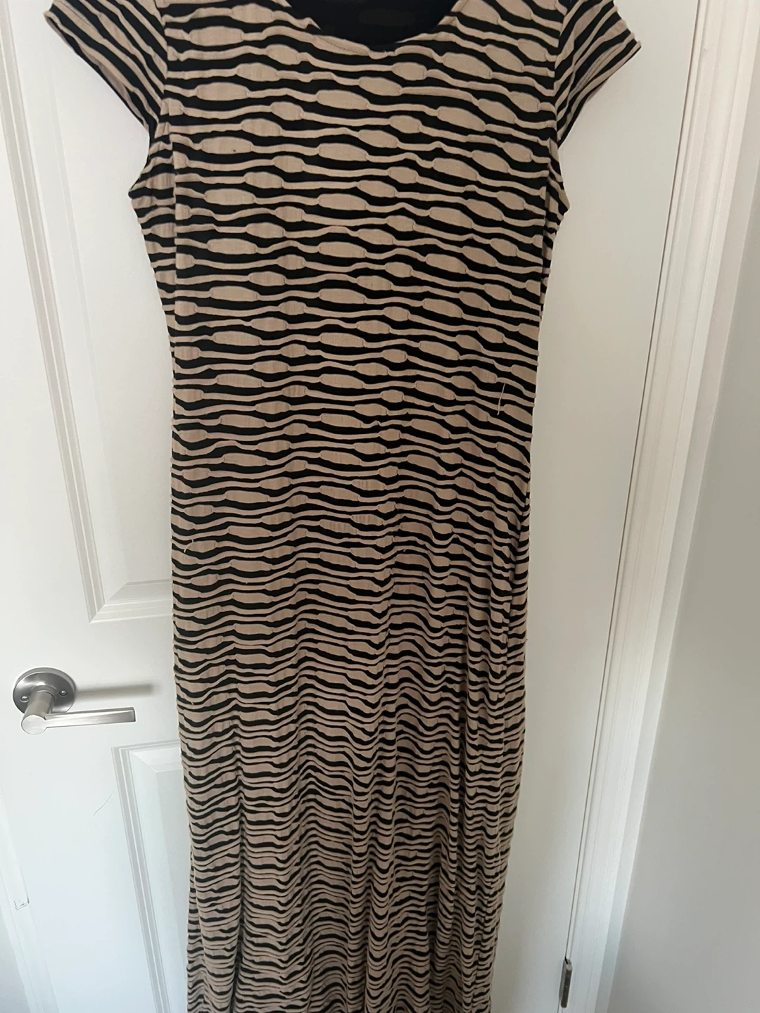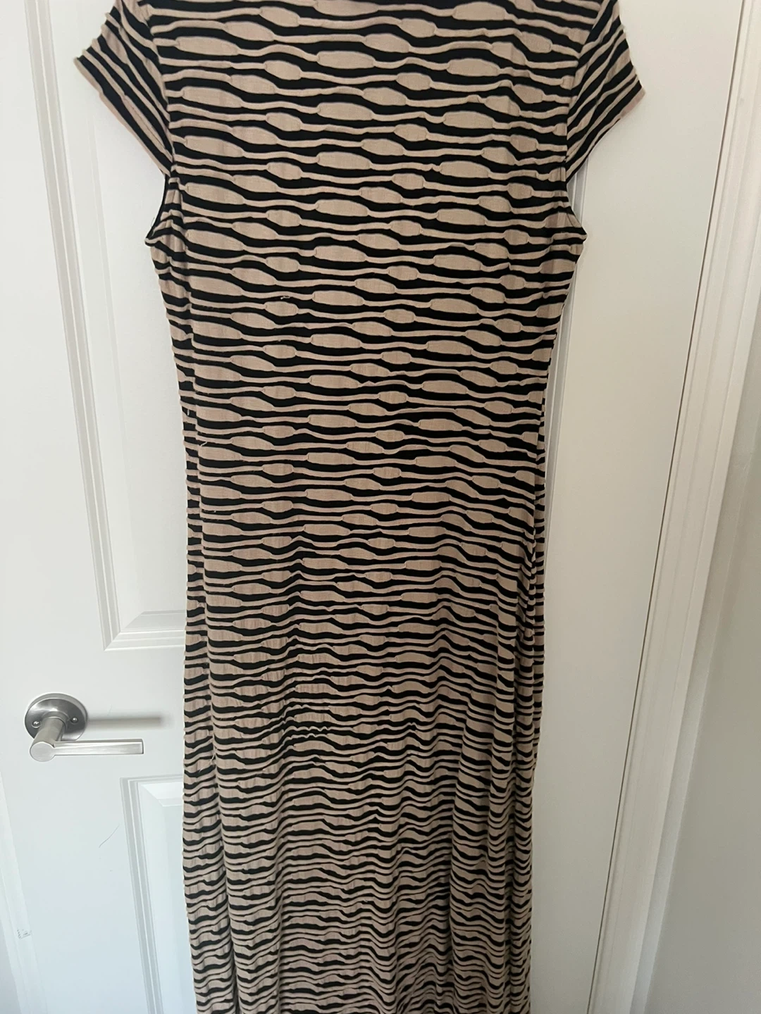 Here's a tan and black maxi dress! It's perfect for casual outings or dressing up for a night out. The unique pattern adds a touch of style to your wardrobe
