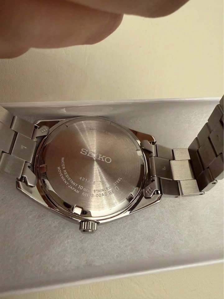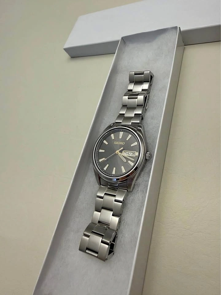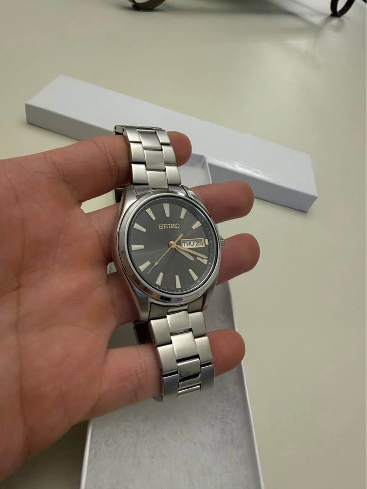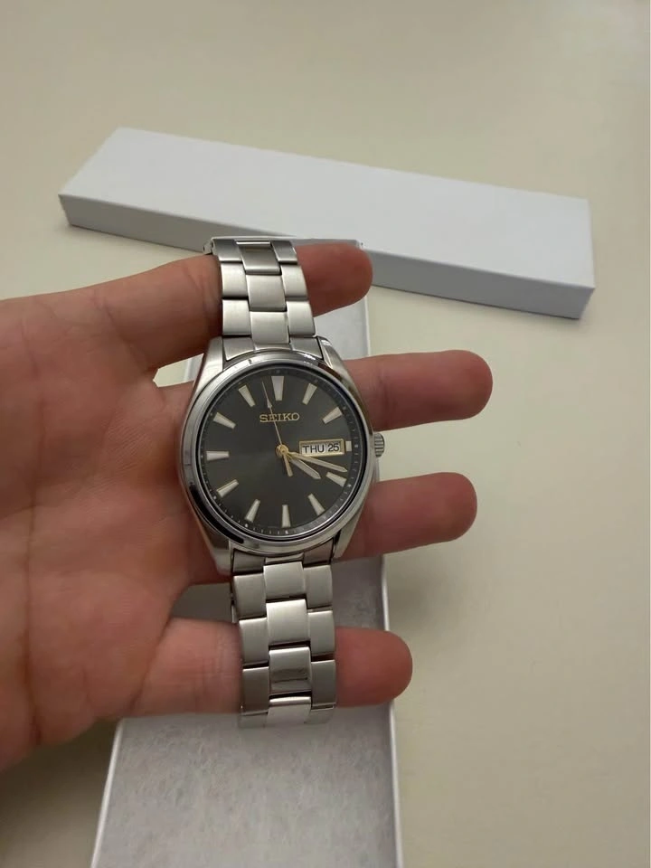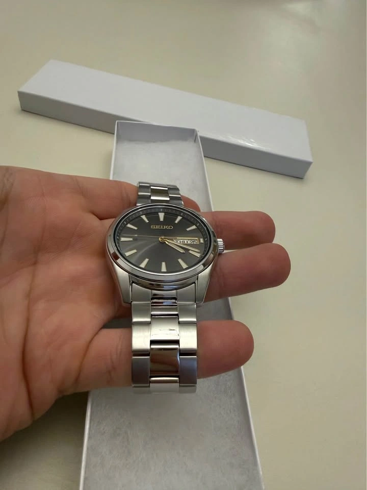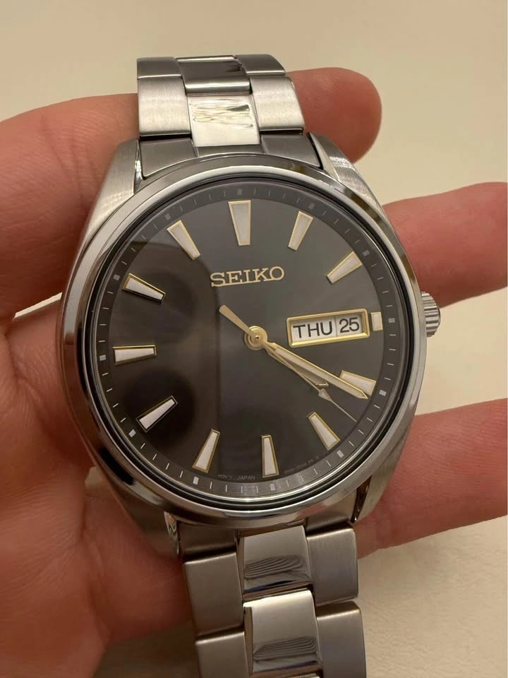 Clean, gently used Seiko SUR343, elegant black/gray sunburst dial with gold hands and accents. Looks sharp with suits or casual, way classier than the price suggests!