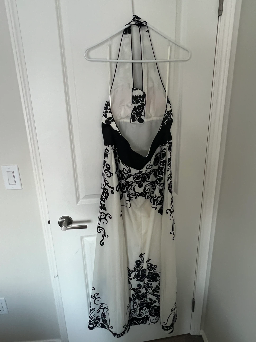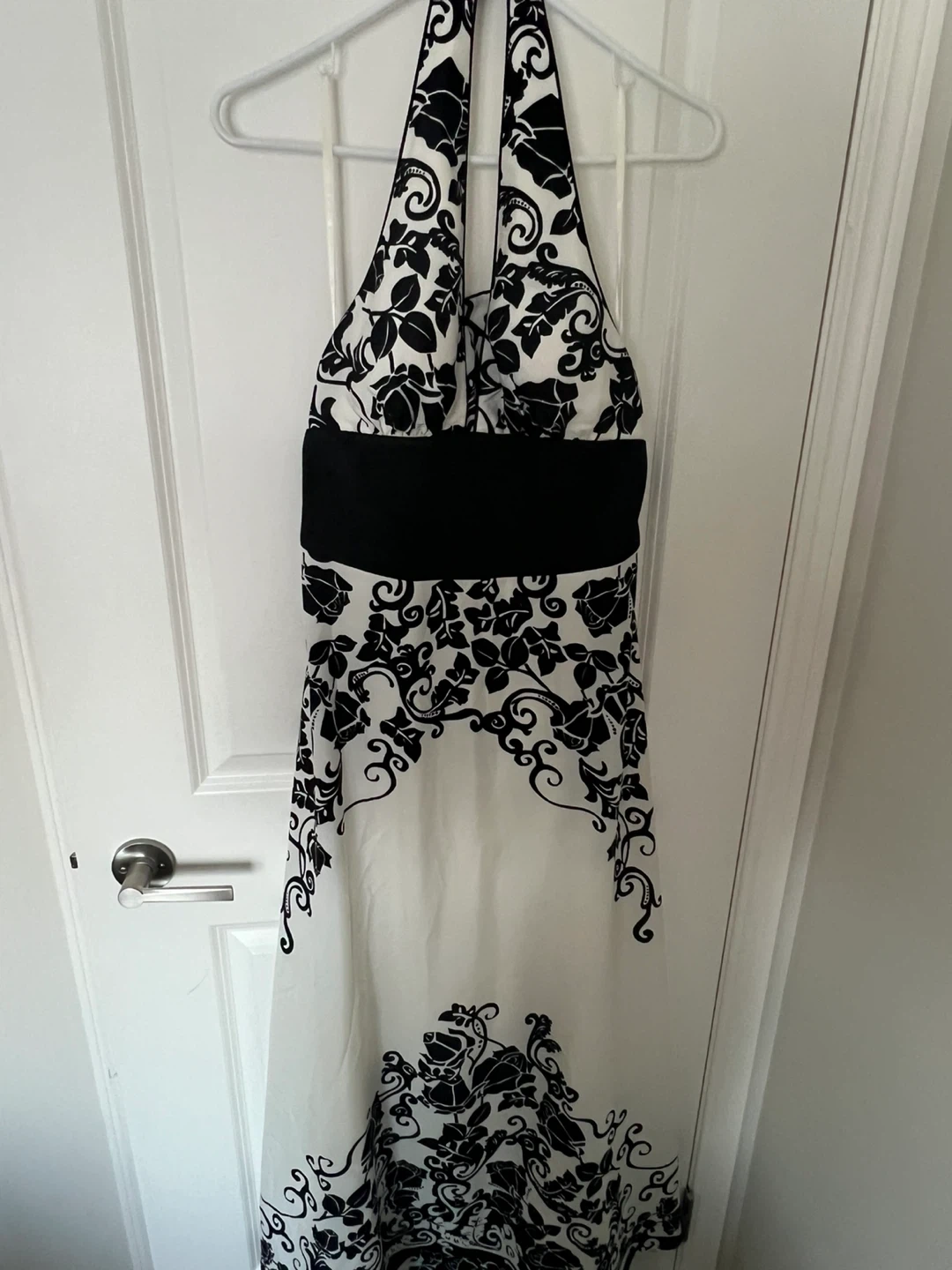 This is a lovely black and white floral halter dress. It's perfect for a special occasion or a night out. It looks to be in great condition and ready for a new home!