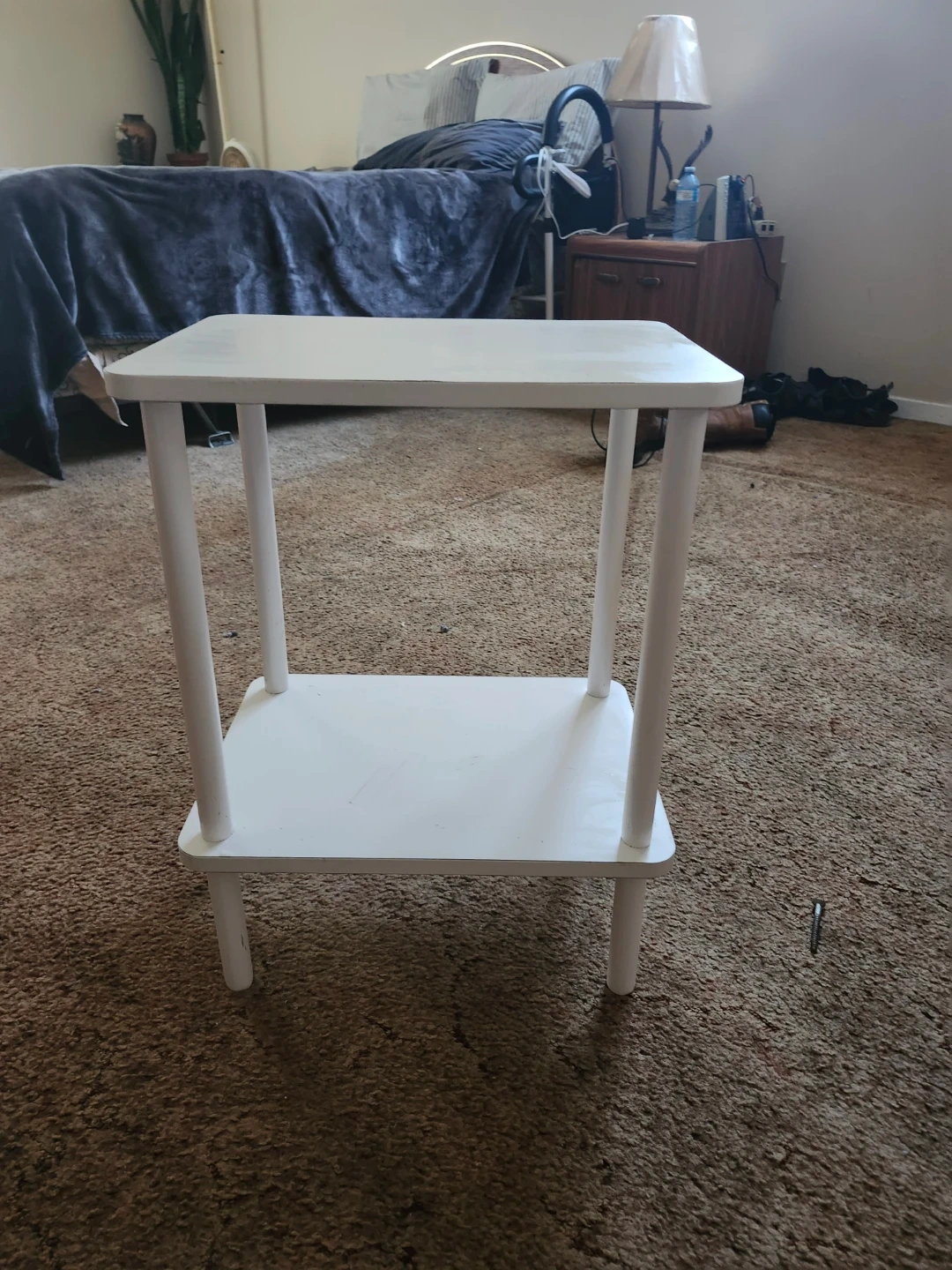 Selling a cute little white end table! It's perfect for a bedside table or a small accent piece in any room. It has two shelves, so you can store books or decorations on the bottom shelf and keep the top clear for a lamp or other items. It's in great condition and is ready for a new home!