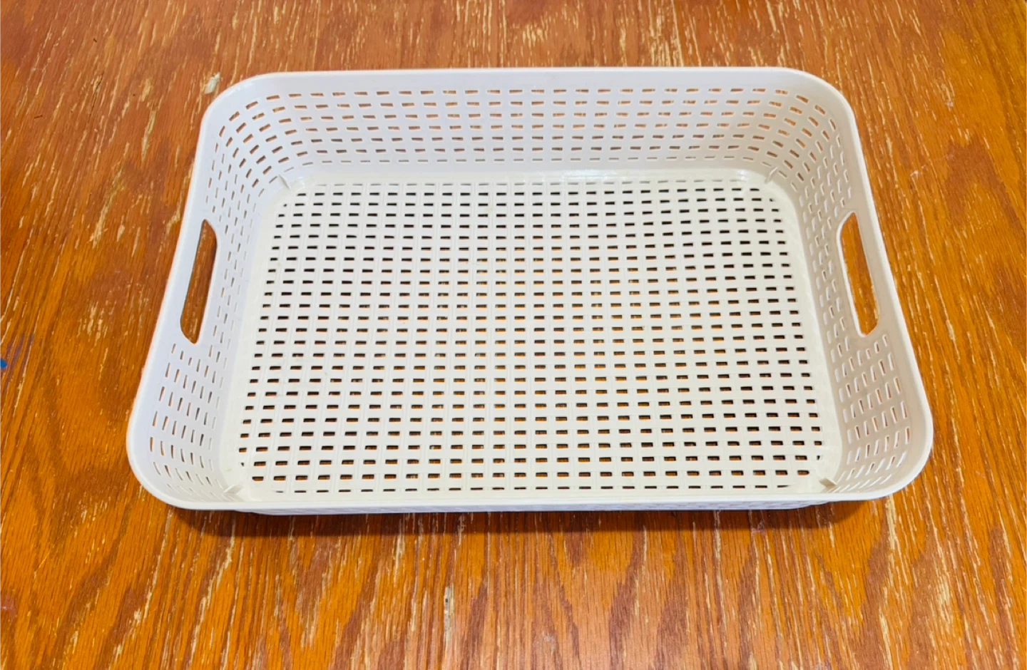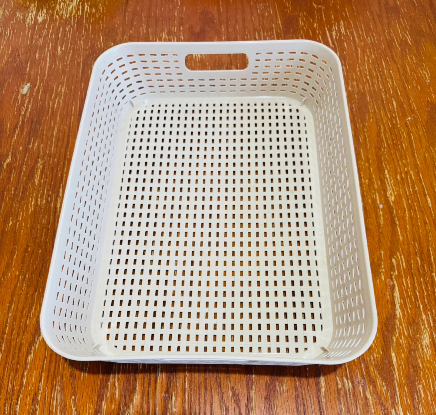 Selling a handy beige plastic storage basket! It's in great shape and ready to help you organize your space. Perfect for tidying up shelves, drawers, or countertops. It's lightweight and easy to move around too!