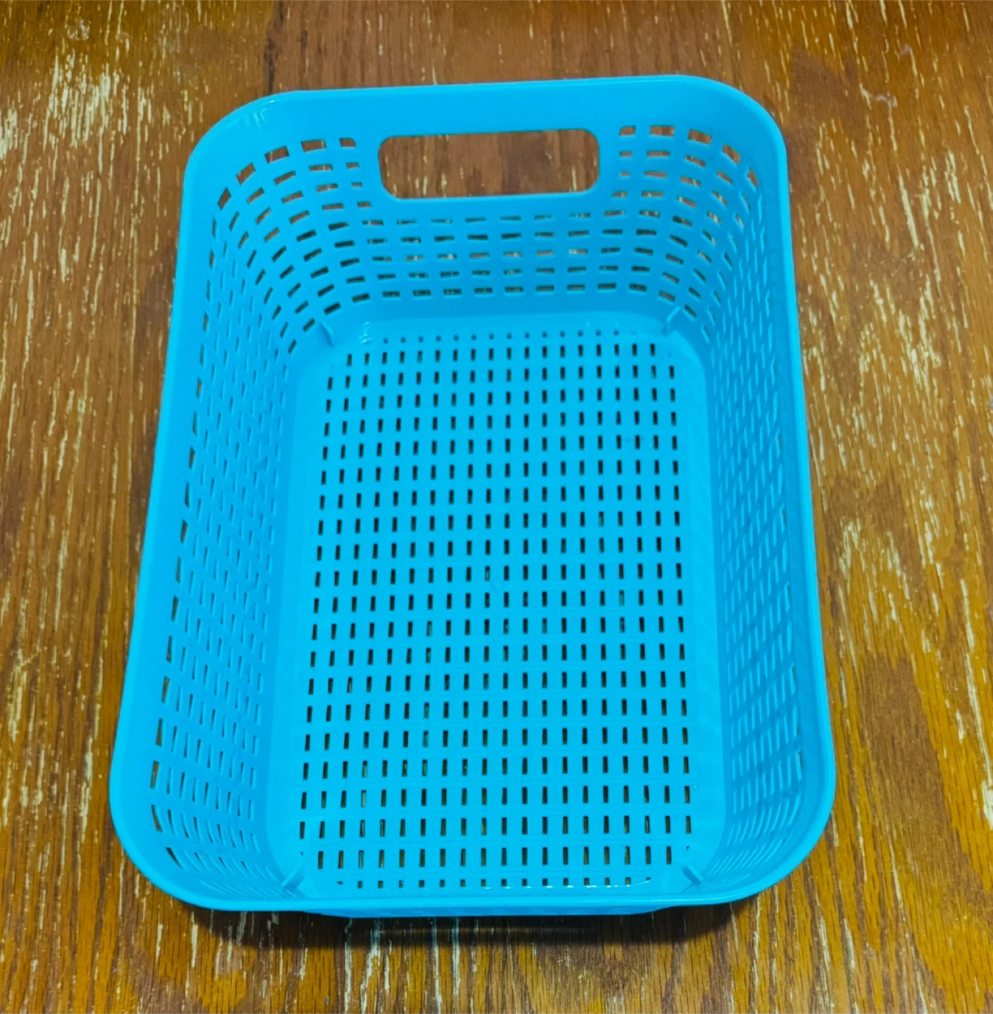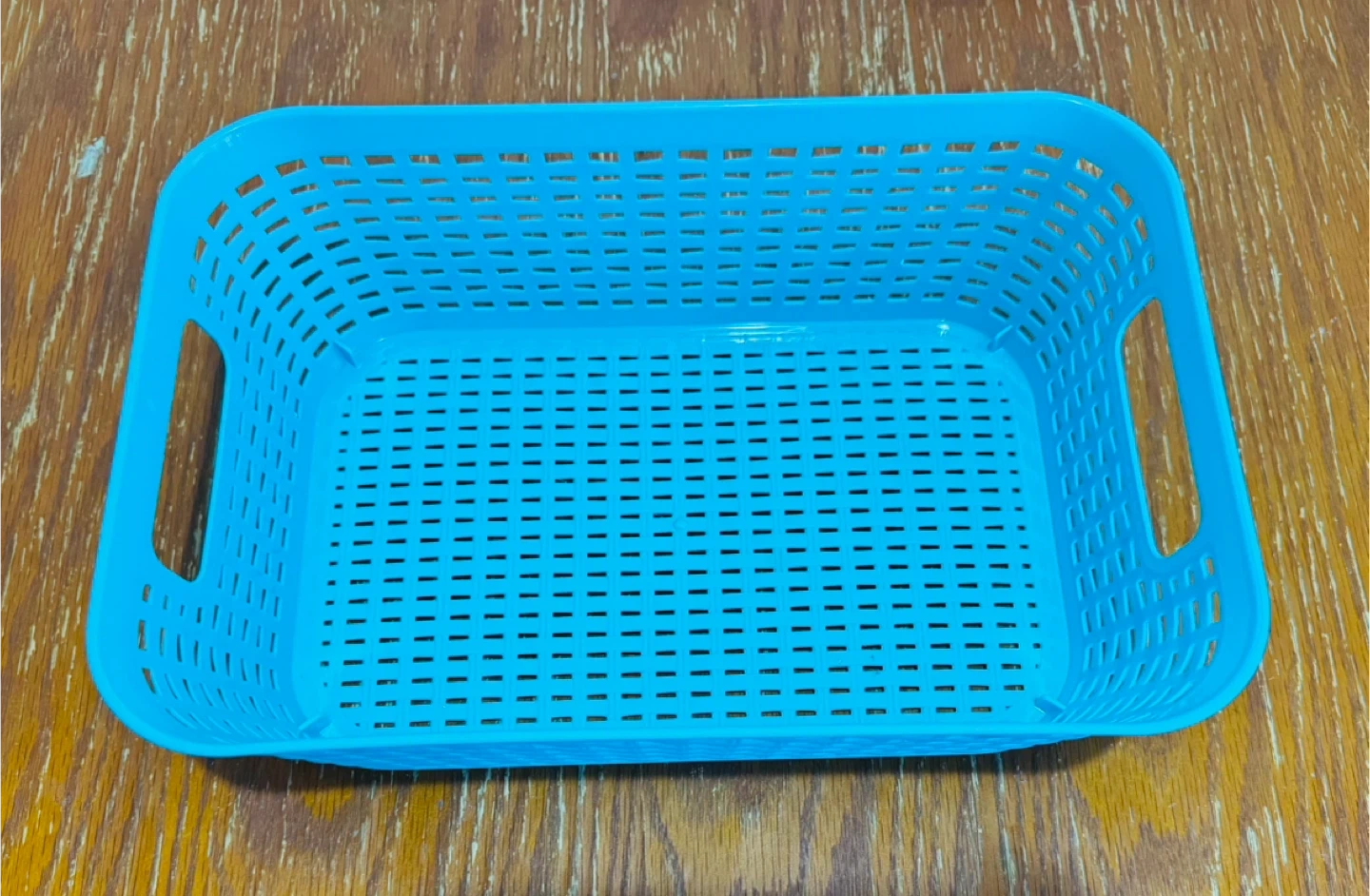 Here's a handy blue plastic storage basket! It's perfect for organizing items around the house. It's in great condition and ready to help keep your space tidy