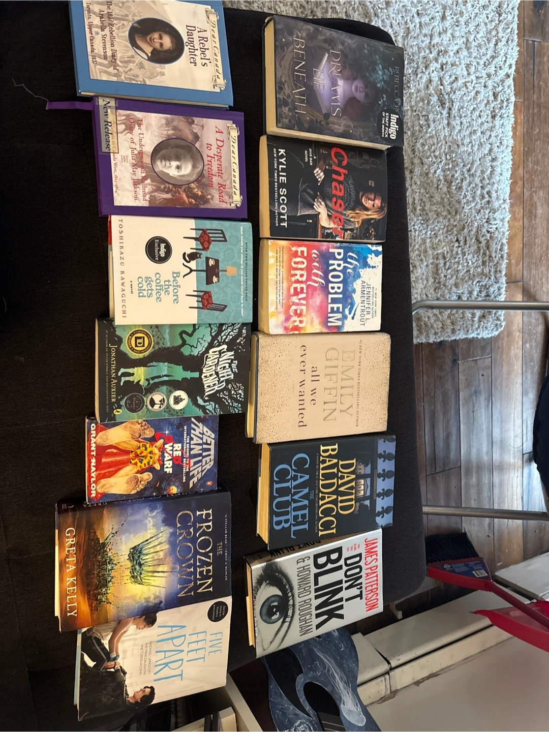 Selling a collection of various books, including titles like 'Dreams Lie Beneath,' 'Chase' by Kylie Scott, 'The Problem with Forever' by Jennifer L. Armentrout, 'All We Ever Wanted' by Emily Giffin, 'Camel Club' by David Baldacci, and 'Don't Blink' by James Patterson & Howard Roughan. There are also 'Dear Canada' series books and others like 'Before the Coffee Gets Cold' and 'The Frozen Crown'.
