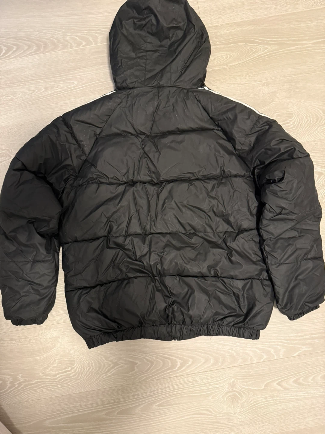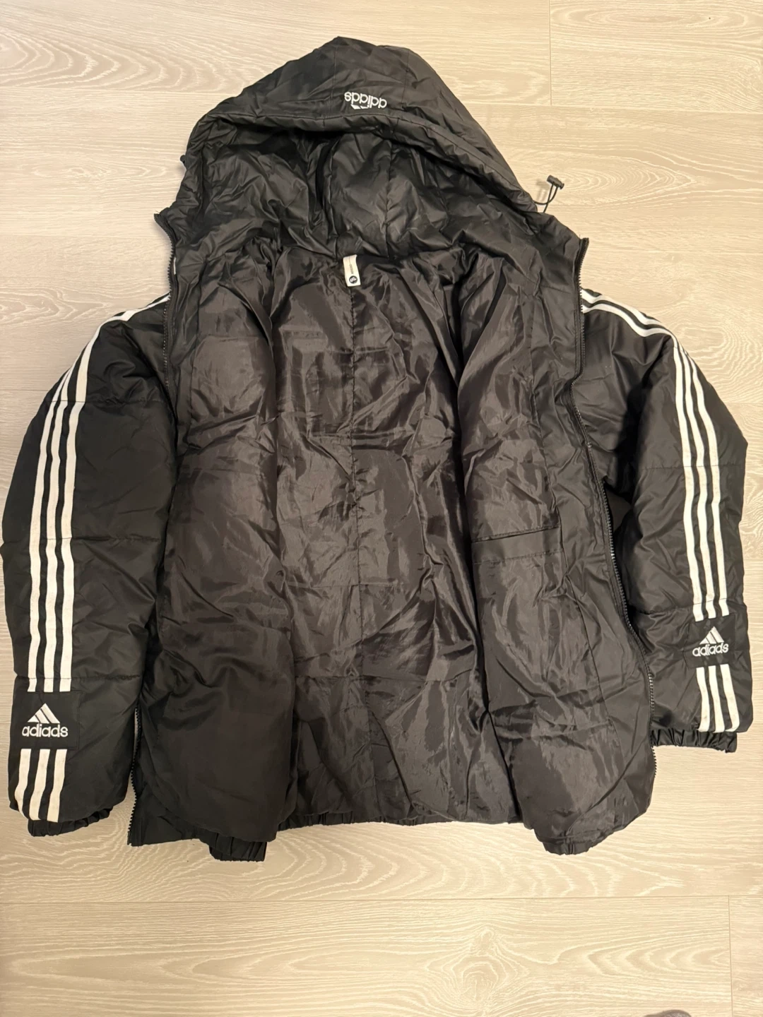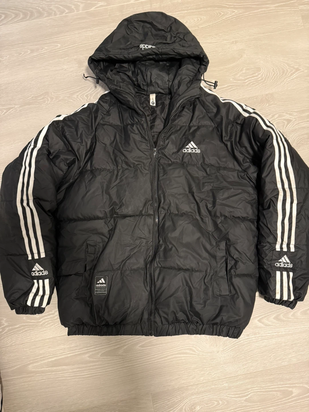 Here's a black Adidas puffer jacket! It has the classic three stripes on the sleeves and the Adidas logo on the front and sleeves. It's in great shape and ready for the colder weather