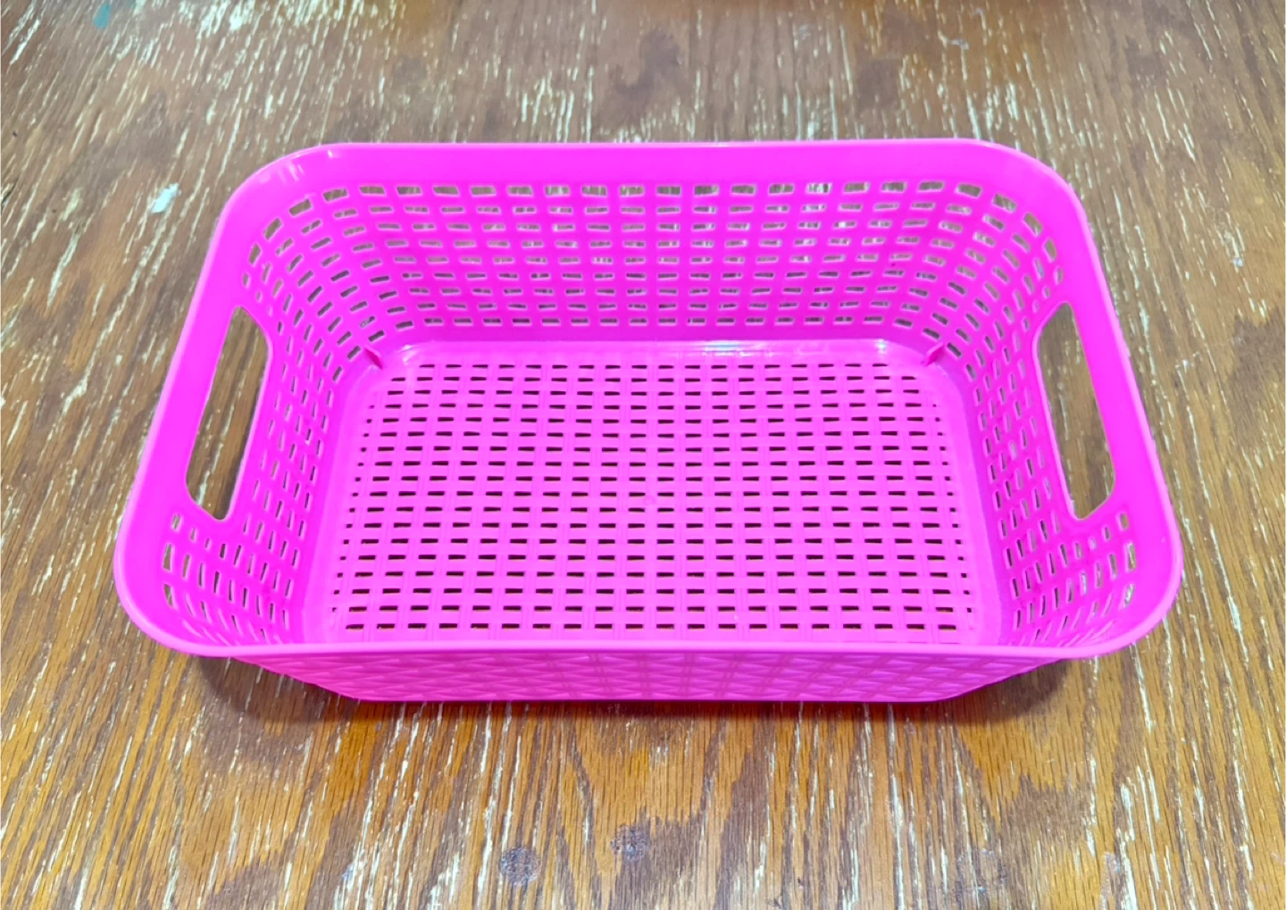 Here's a handy pink plastic storage basket! It's perfect for organizing small items around the house. The basket has a rectangular shape with a grid-like pattern on the bottom and sides. There are also handles on either side for easy carrying