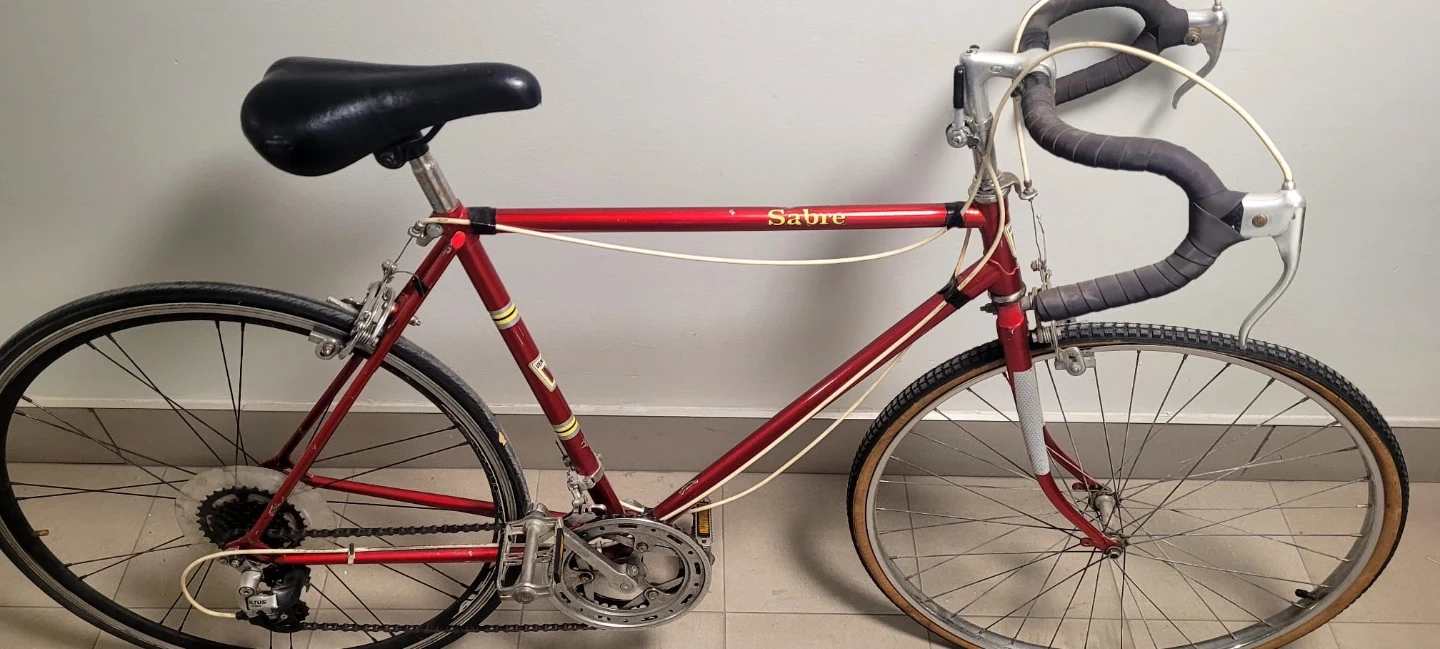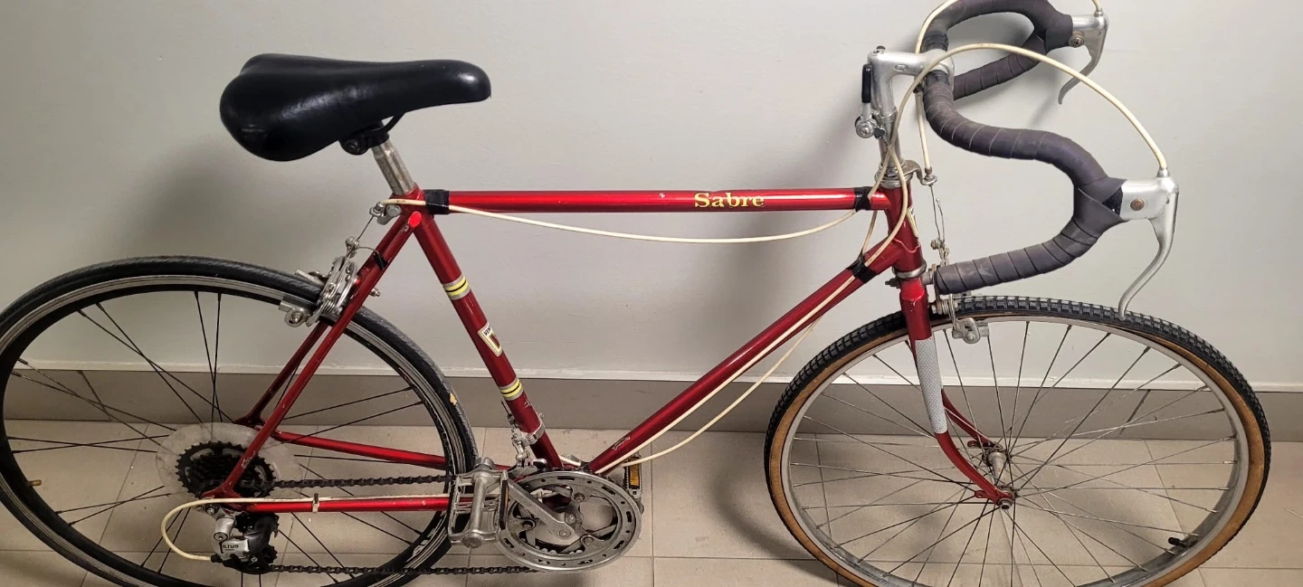 Sabre road bike. It's red with some gold accents. The bike has a classic design with drop handlebars. It's in good condition for its age and would be great for someone looking for a retro ride