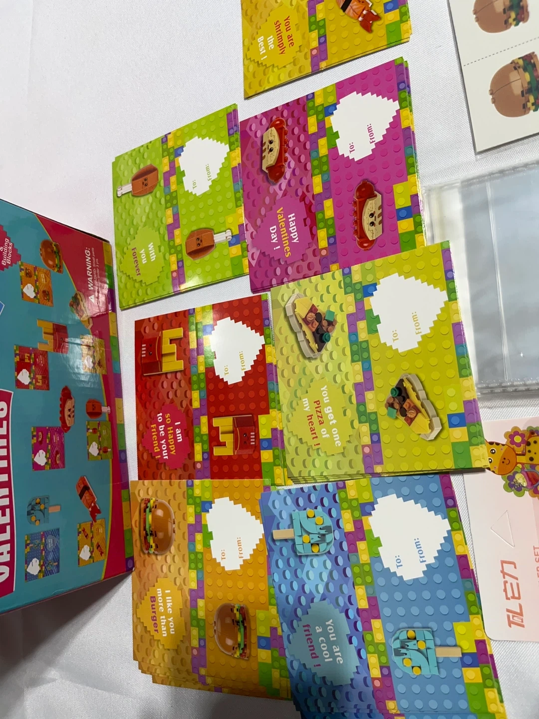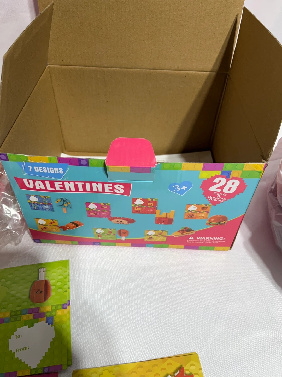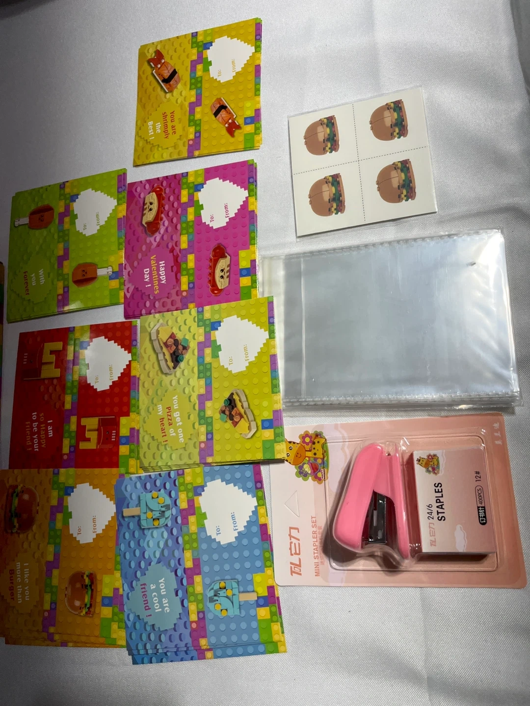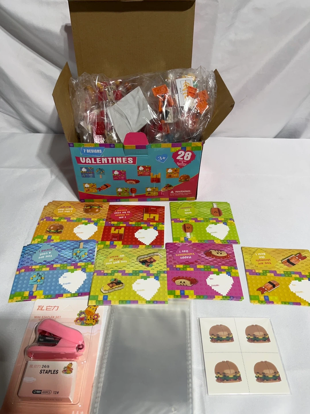 This set includes 7 designs of Valentines cards, each with a building brick theme! It's suitable for ages 3 and up and comes with 28 cards and building bricks. Also included is a mini stapler set to help put everything together