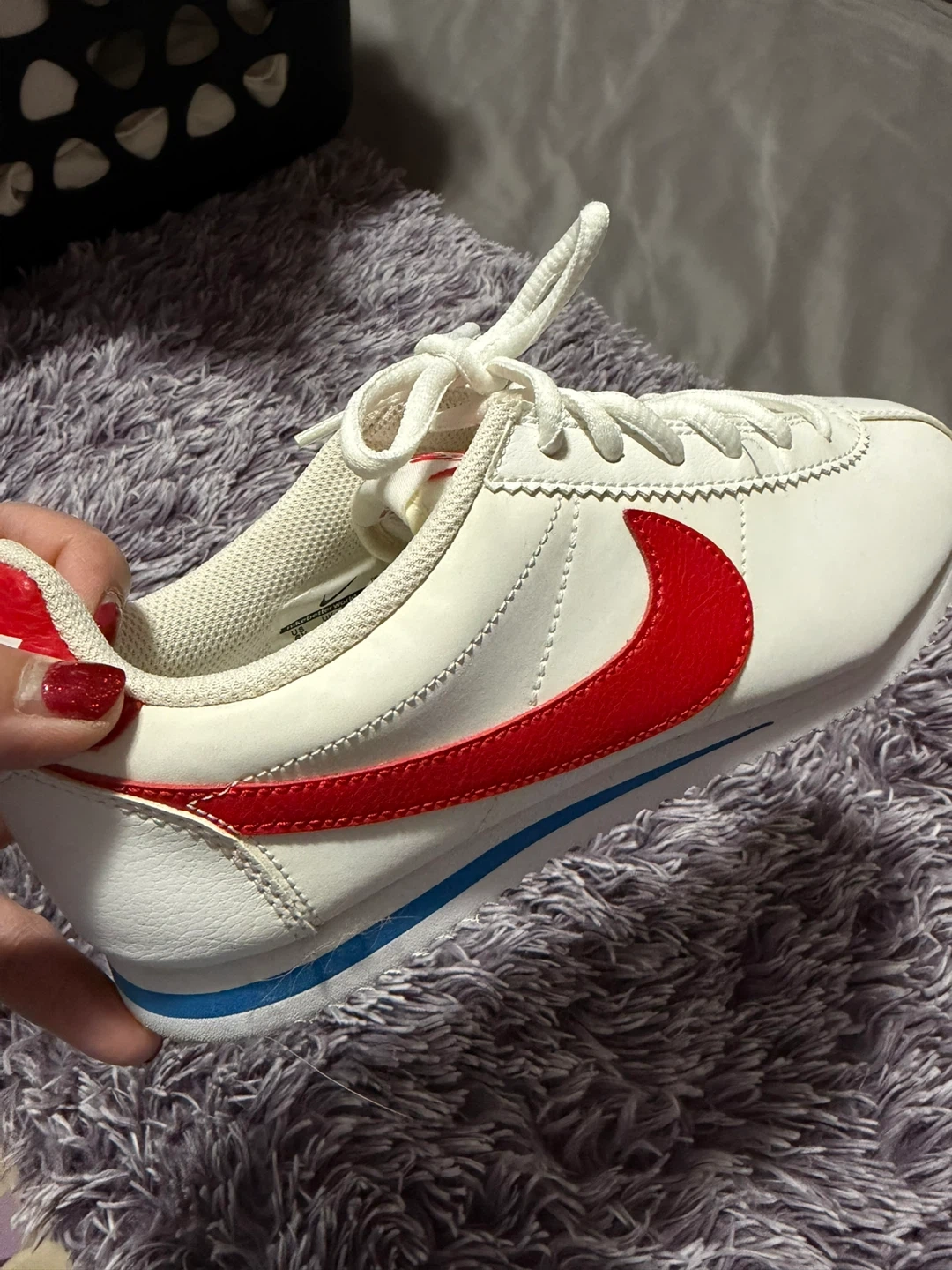 Selling a pair of Nike Cortez in a kids size 6Y. They feature a white leather upper with a red swoosh and blue accents. Great for everyday wear!