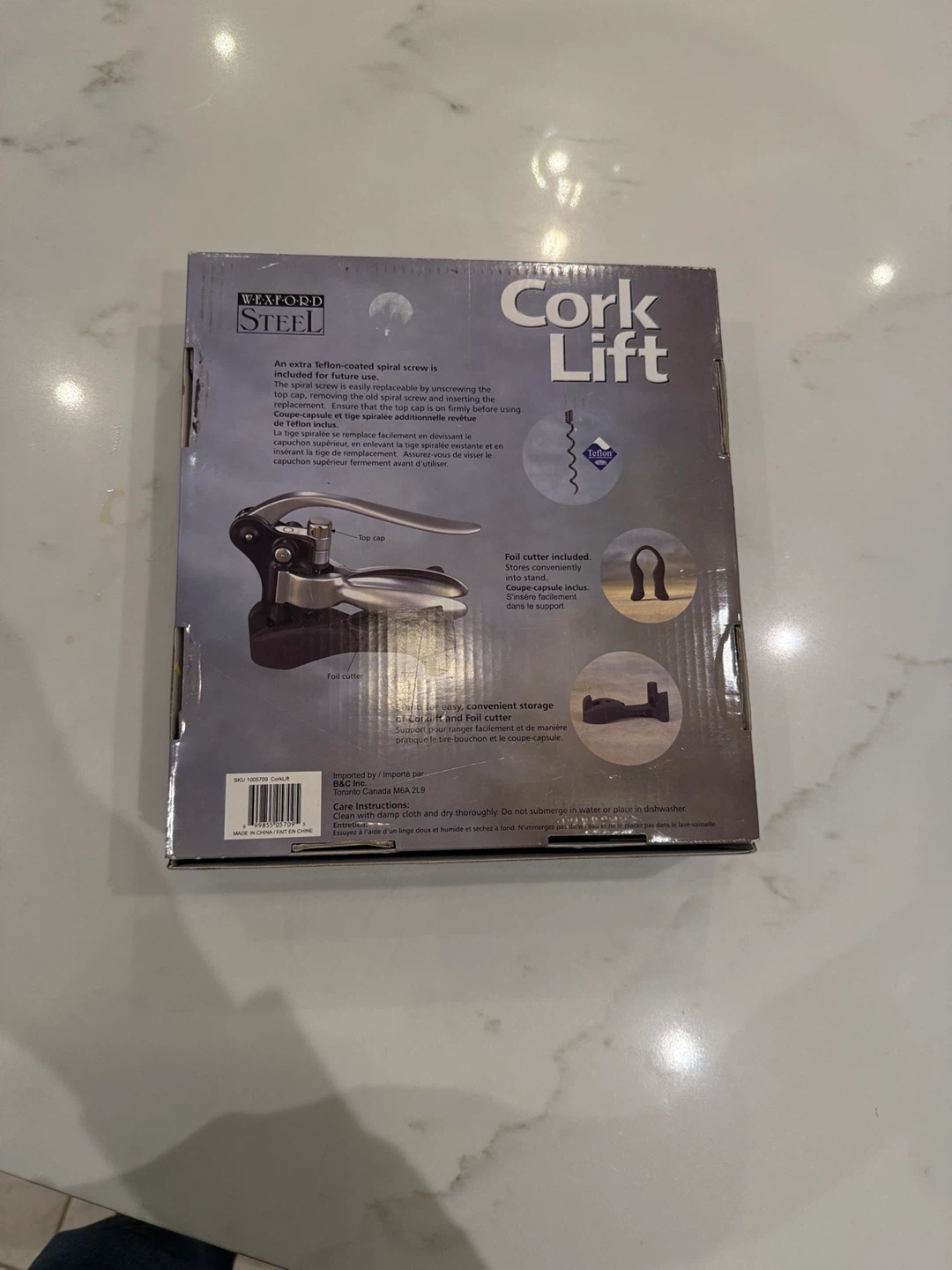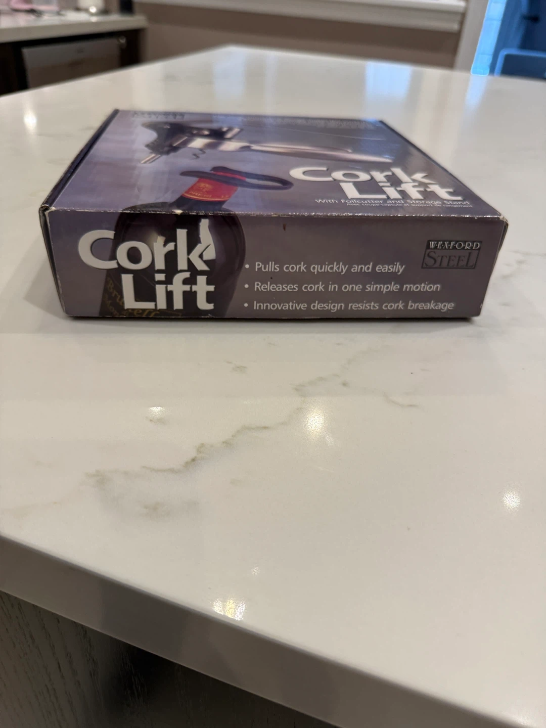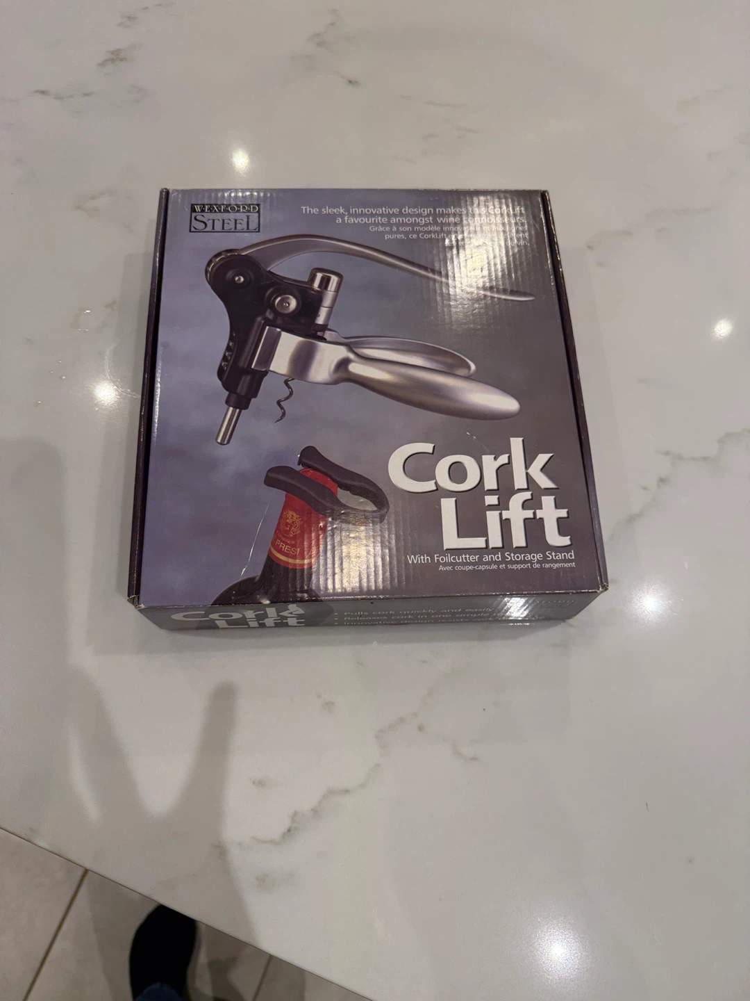 New in Box - Wexford Steel Cork Lift with Foilcutter and Storage Stand. It pulls corks quickly and easily, releasing them in one simple motion. Its innovative design resists cork breakage. An extra Teflon-coated spiral screw is included for future use. The foil cutter stores conveniently in the base.