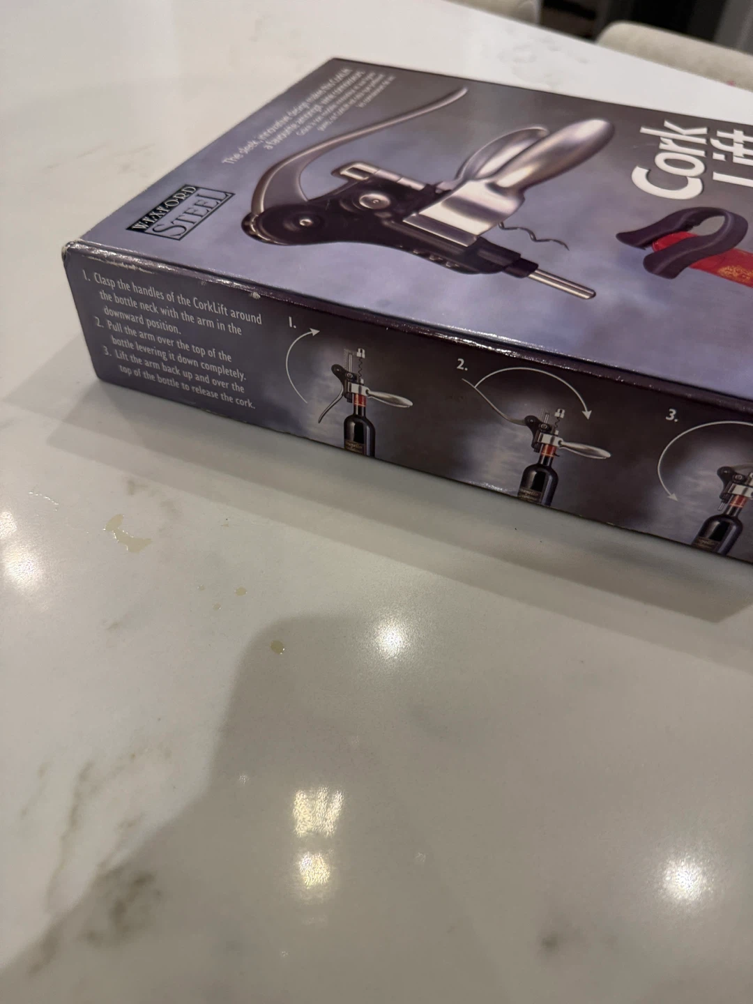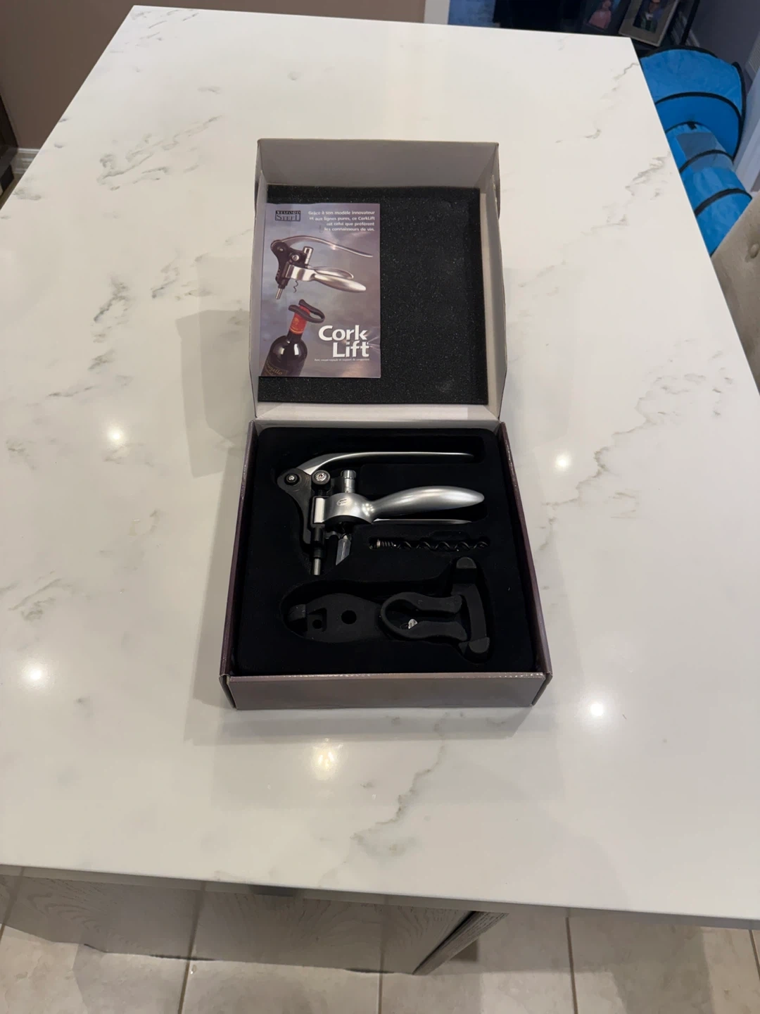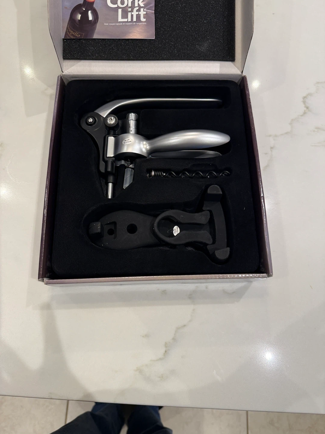New in Box - Wexford Steel Cork Lift with Foilcutter and Storage Stand. It pulls corks quickly and easily, releasing them in one simple motion. Its innovative design resists cork breakage. An extra Teflon-coated spiral screw is included for future use. The foil cutter stores conveniently in the base.