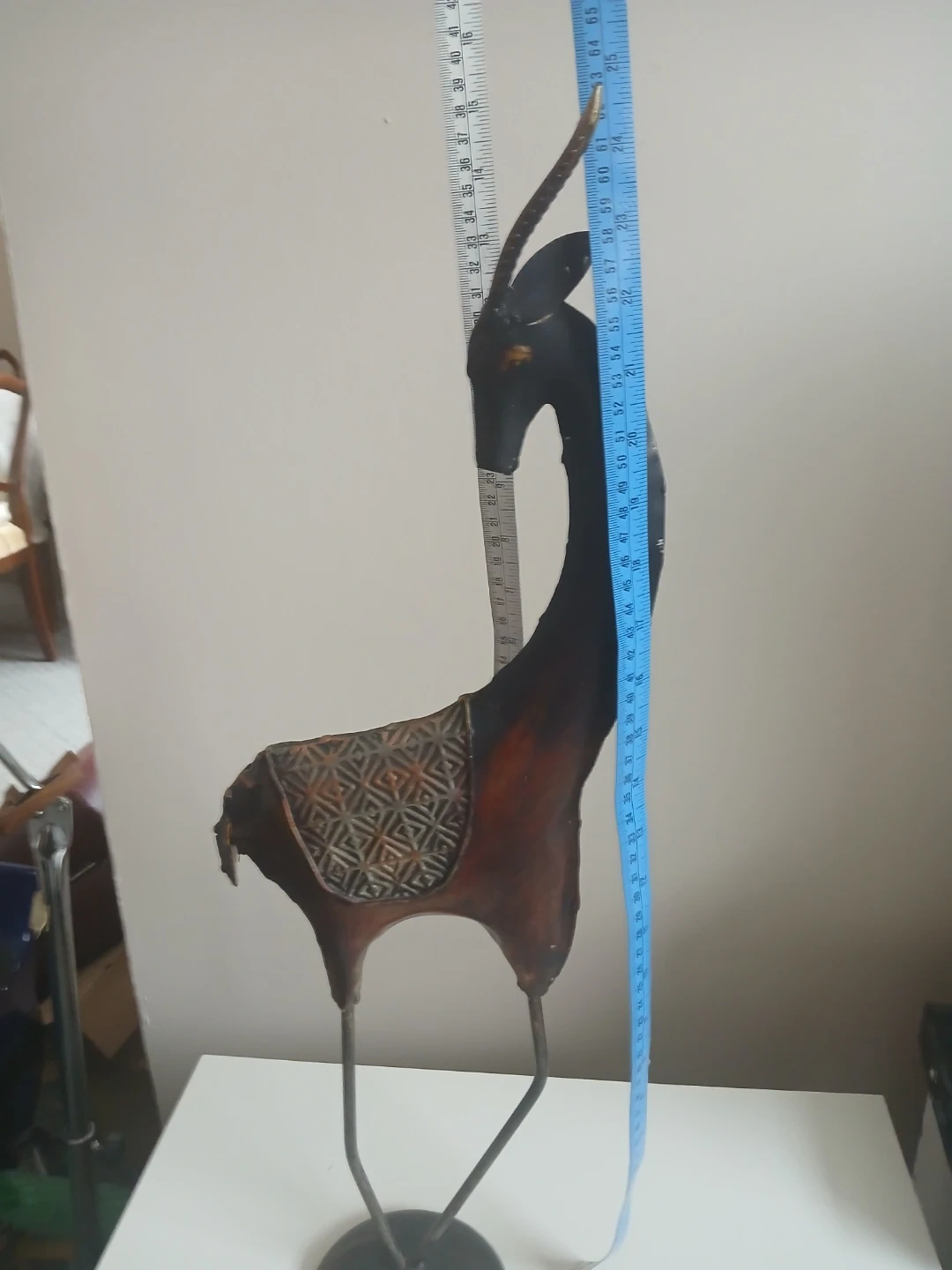 Here's a unique metal giraffe sculpture that would look great in any room! It has a saddle with a geometric pattern and a sturdy metal base. It's in great condition and ready to be displayed in your home